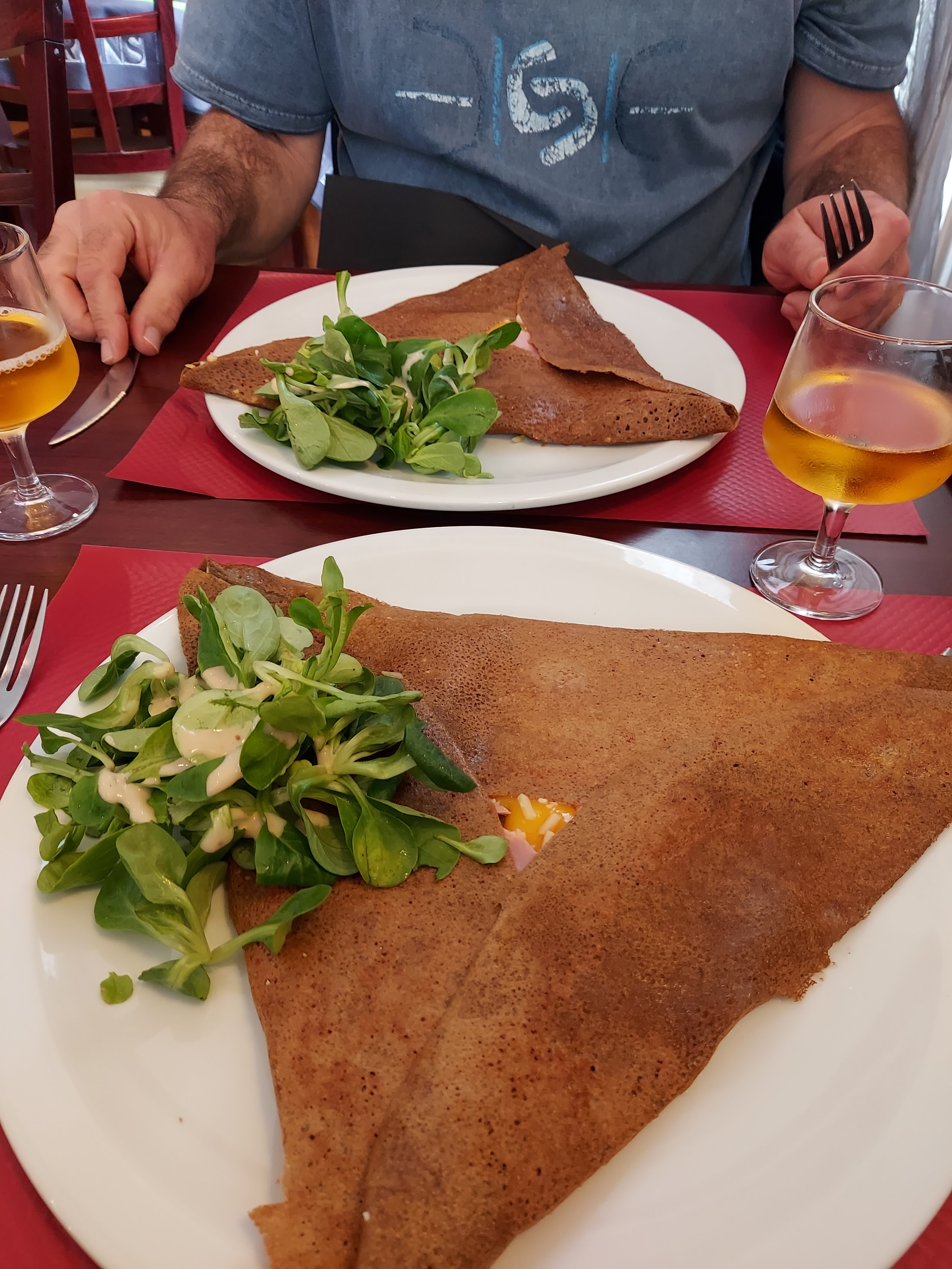 La gentillesse du patron et la qualité des galettes et crêpes (un régal et copieux en plus), m'ont fait oublier le moment de solitude quand je me suis étalée dans l'entrée du restaurant