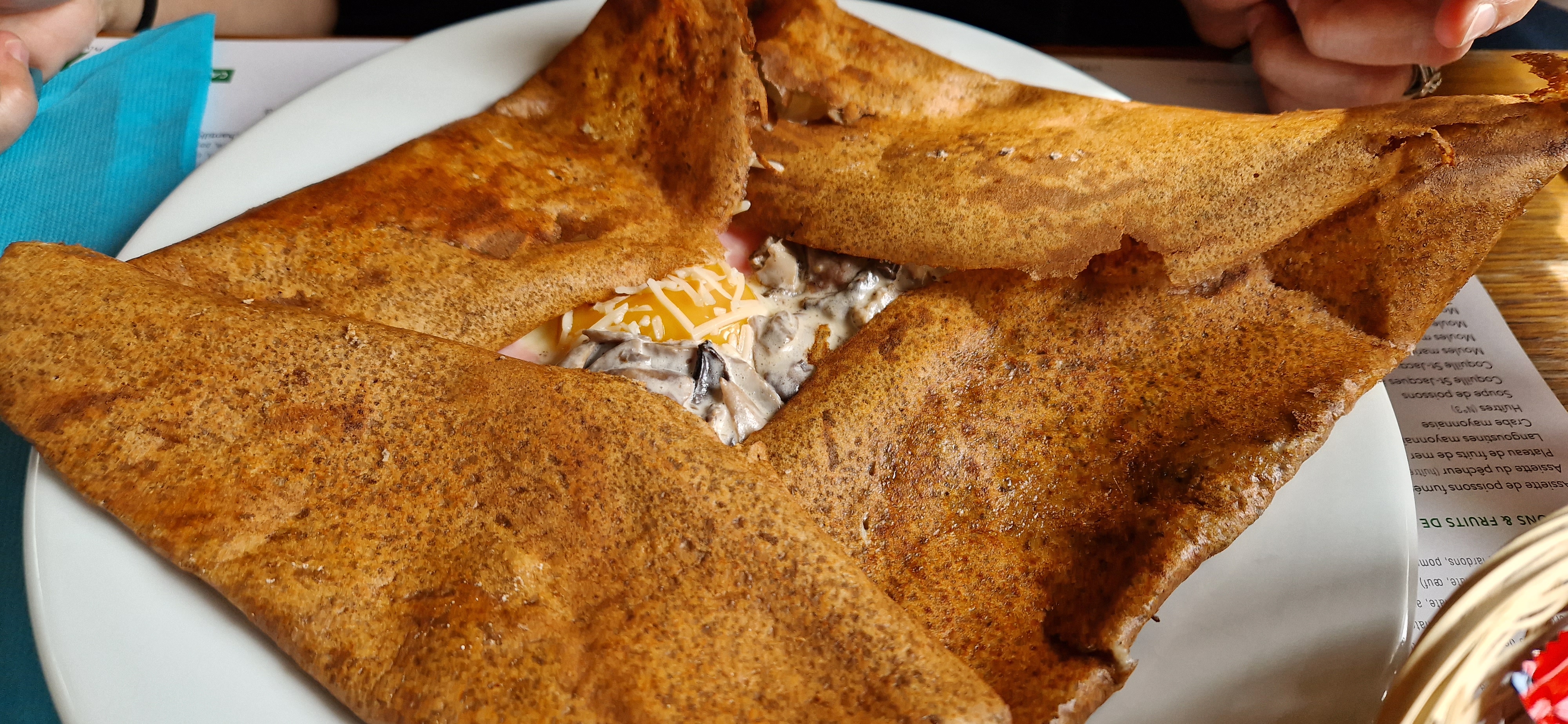 Déçue, je suis habituée à largement mieux dans ce restaurants. Accueil peu aimable (même pas un bonjour de la part de la serveuse) On nous a placé dehors alors qu'il pleuvait (un parasol en guise d'abris) et que la salle intérieure était vide Les crêpes étaient bonne mais sans plus, avec des champignons en boite... Et la présentation des crêpes était peu esthétiques (mal pliées, debordent de l'assiette)