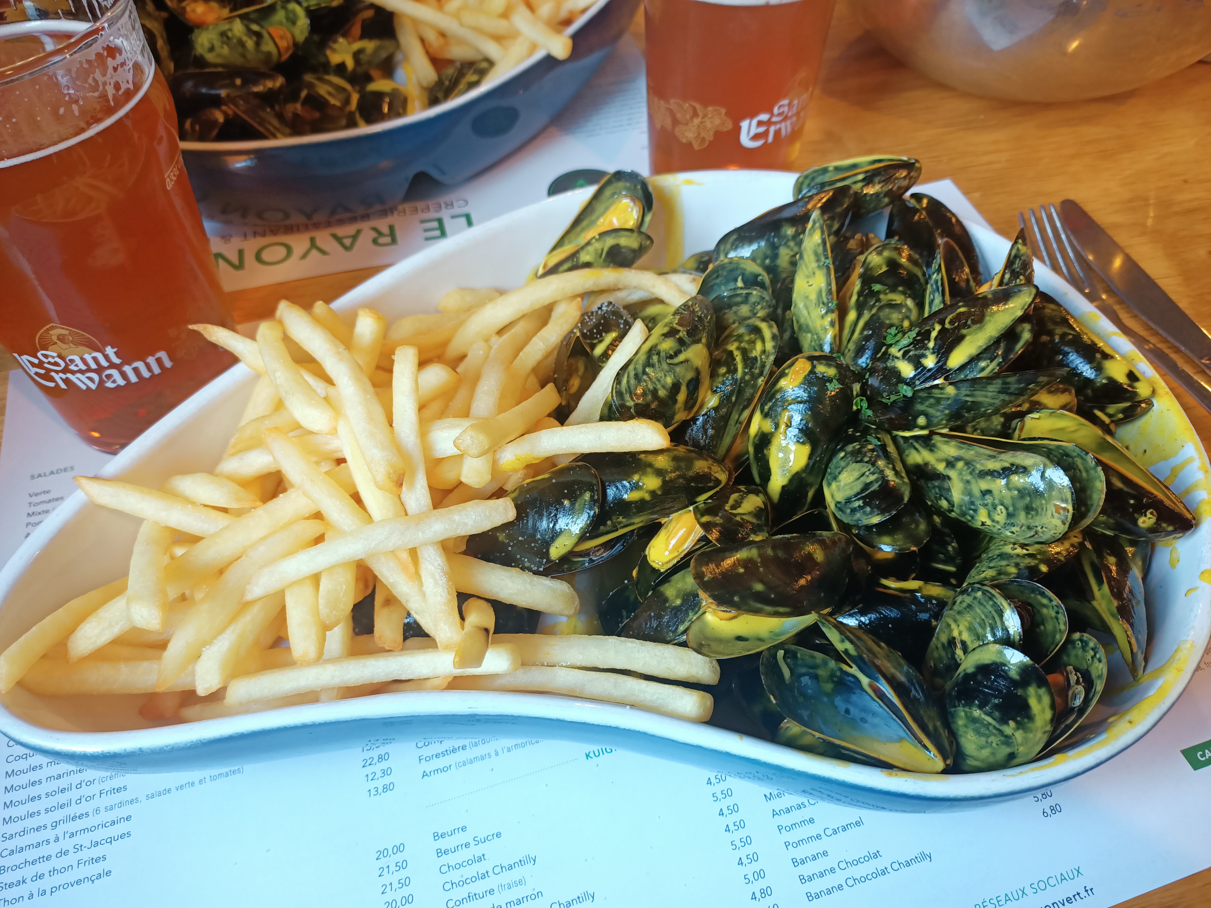 Le classique : moules sauce soleil d’or (safran crème) —> une tuerie ! Crèpes et kouigns au rendez-vous. Manque des frites maison !!! Staff archi cool et concerts fréquents. Terrasse utilisable même sous la pluie !