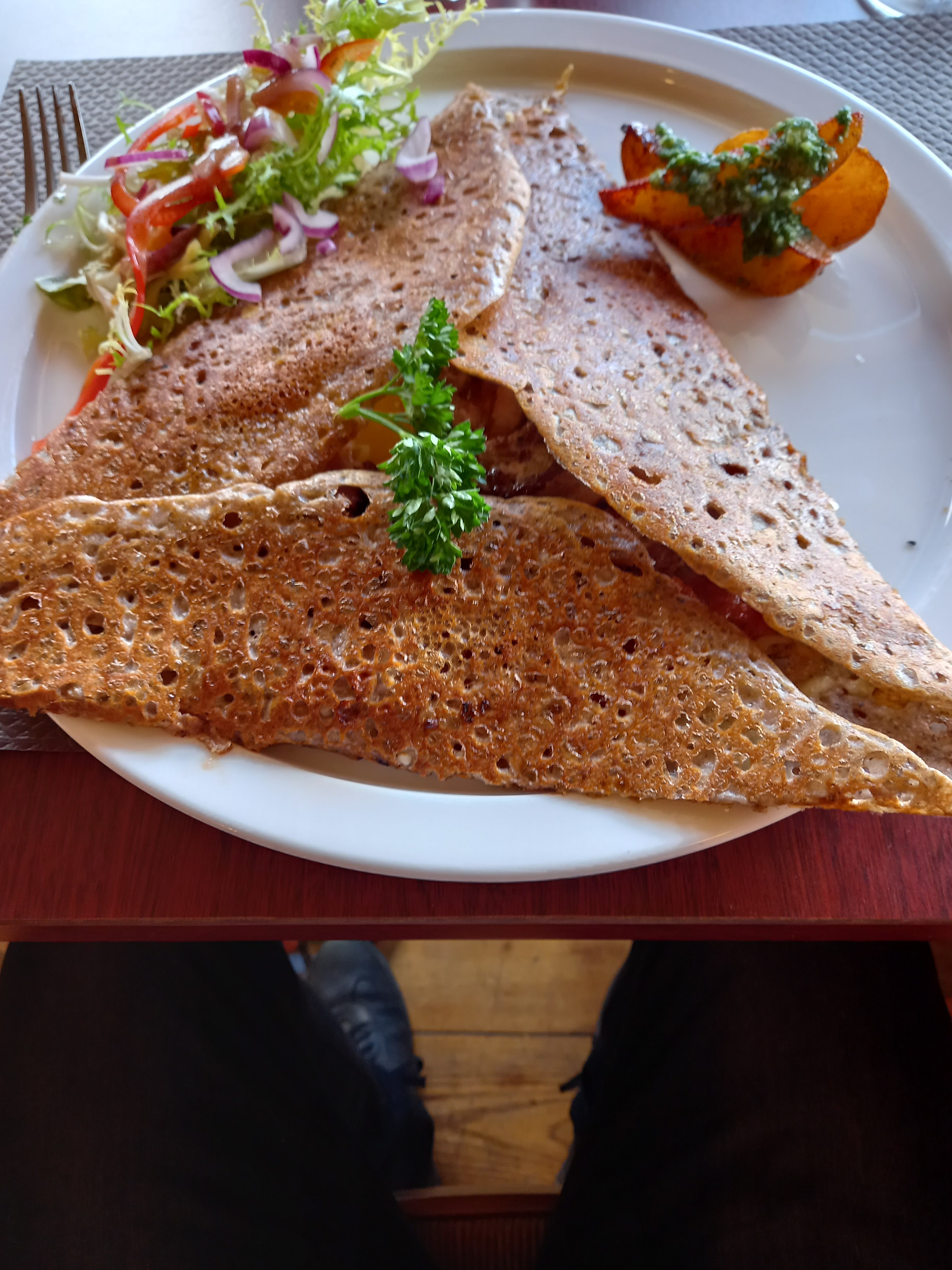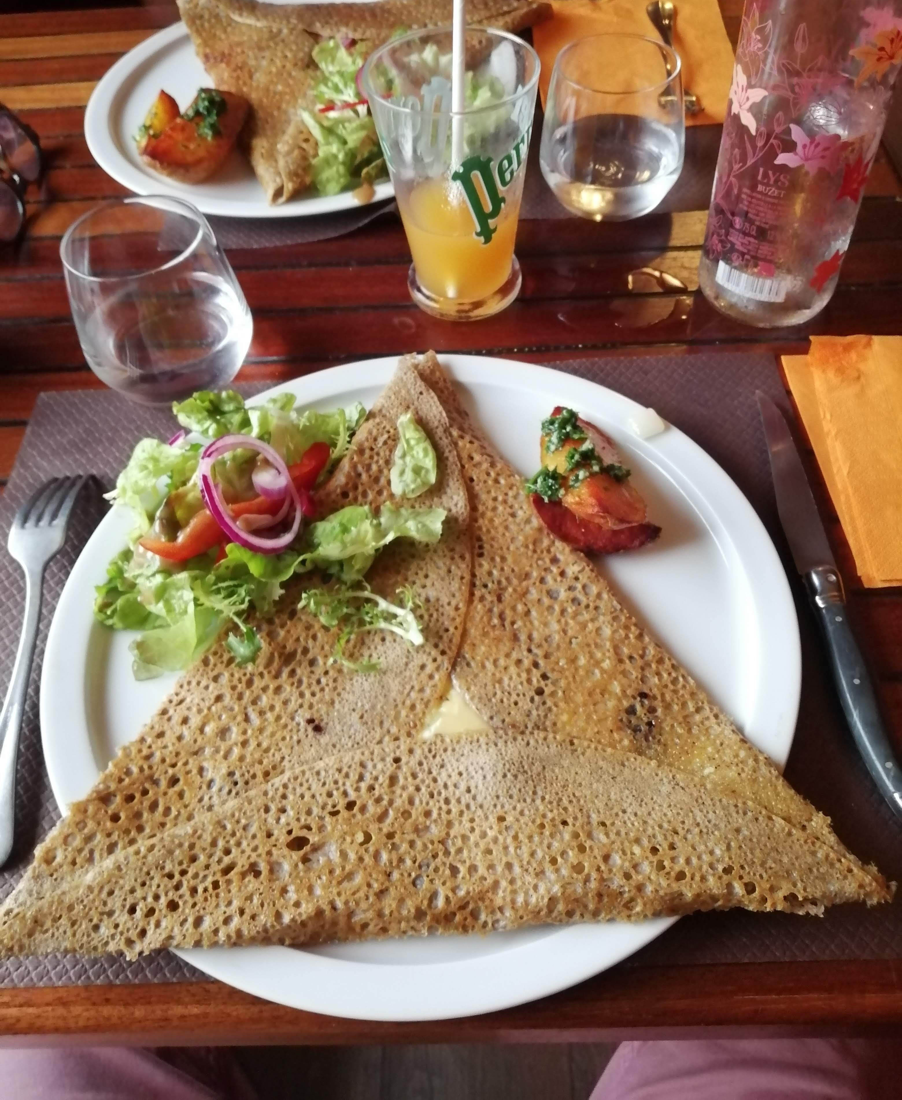 Nous voulions manger dans un petit restaurant à proximité, mais malheureusement, seuls des sandwichs y étaient disponibles à cause d'une fête du village. Un sympathique monsieur (propriétaire ?) nous a recommandé cette crêperie dans un village plus éloigné. Nourriture délicieuse, les plats sont un régal pour la langue et largement suffisants, mais pas au point de devoir en laisser la moitié. Fortement recommandé, nous mangerons ici plus souvent à partir de maintenant.