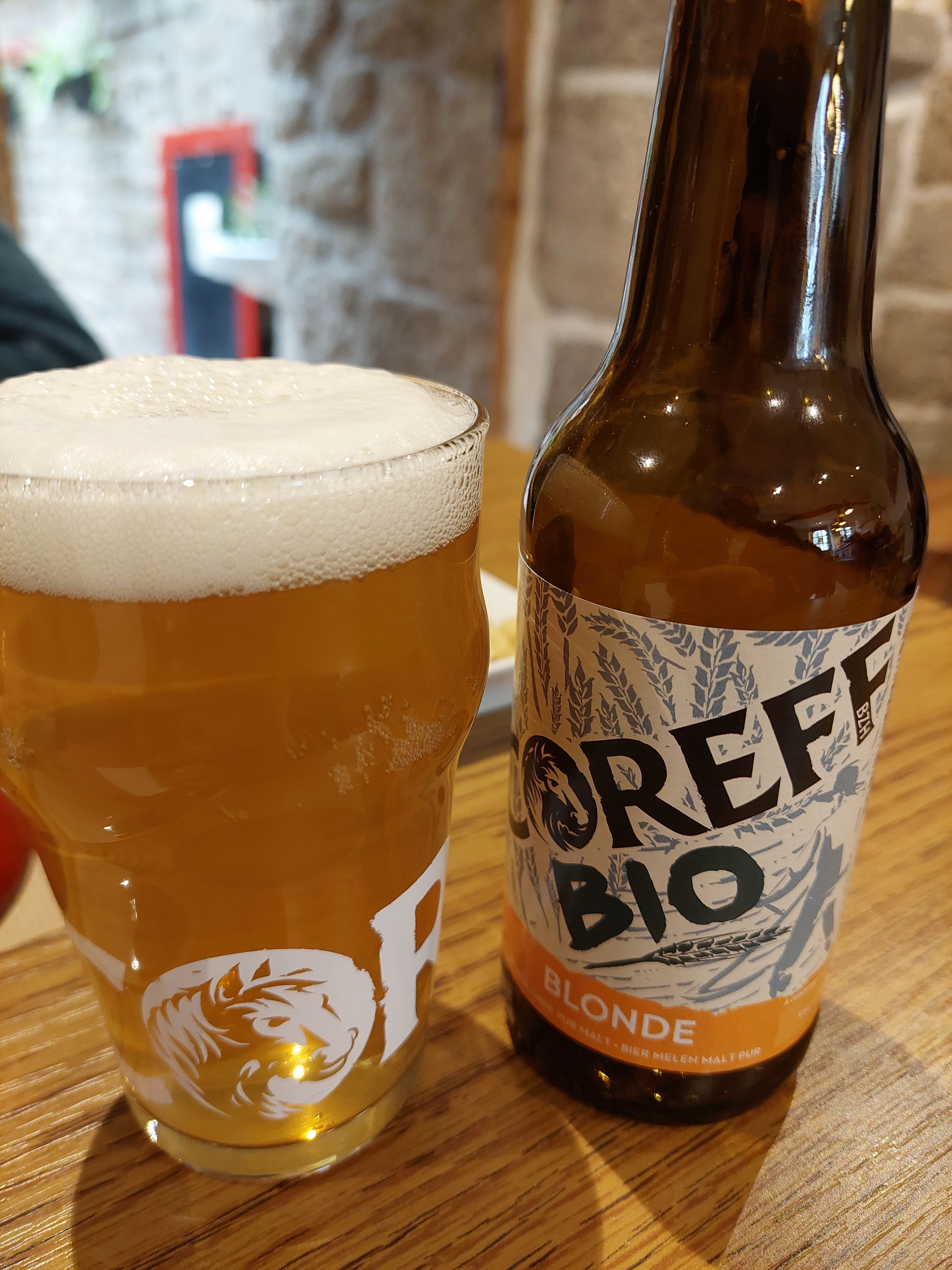 Avant d'entreprendre notre balade plus que décevante en forêt du Huelgoat (...) nous avons fait une halte à la crêperie. Sur la place du village, il y en a au moins trois mais c'est elle qui par son nom boisé et sa façade sympathique a retenu notre attention. Et pour le coup, malgré une carte peu étoffée, ce fût une excellente surprise ! A commencé par le choix du cidre : un domaine de Kervéguen, cuvée prestige, et bio s'il vous plaît, celui-là même qui est servit à la table de l'Élysée. Je ne connaissais pas mais avec sa délicieuse couleur ambrée et ses fines bulles il est délicieux ! Les galettes ensuite : la pâte est à la fois consistance et légère, moelleuse et légèrement croustillante aux entournures. Personnellement, j'avais pris la Goellouse, copieusement garnie de pommes de terre, de fondue d'oignons, de poitrine, de fromage et de ciboulette : simple, efficace et excellent ! Ma fille avait pris une galette différente à base de poulet et de fondue de poireau au curry. Le mélange étant quelque peu audacieux, elle n'a pas terminé mais elle a fait mon bonheur ! Le fiston moins risque-tout c'est contenté d'une complète avec supplément de tomate. Elle était également très copieuse, bien plus que la moyenne des complètes que l'on peut habituellement retrouver dans nos assiettes et il a adoré. Madame, quant à elle a pris une spéciale tomate avec plein de tomates (forcément...), bacon et fromage frais au fines herbes. Elle était très satisfaite de son choix !!! En dessert, j'avais pris une Freizh, à savoir une crêpe sucrée garnie de dés de fraises de Plougastel, d'une boule de glace vanille artisanale Jampy, le tout accompagné d'un petit milkshake à la fraise et sa pointe Chantilly sur brisures de palets Bretons. La encore un mariage très simple mais néanmoins alléchant et divin !!! Madame a opté pour une crêpe banane-chocolat, très chargée en chocolat d'ailleurs, et les enfants pour des boules de glace artisanale. Bref, les recettes sont originales sans fioritures, le rapport qualité/prix est excellent, le service détendu et rapide, le cadre propre et agréable : tout ce qu'on demande à une crêperie quoi !!!