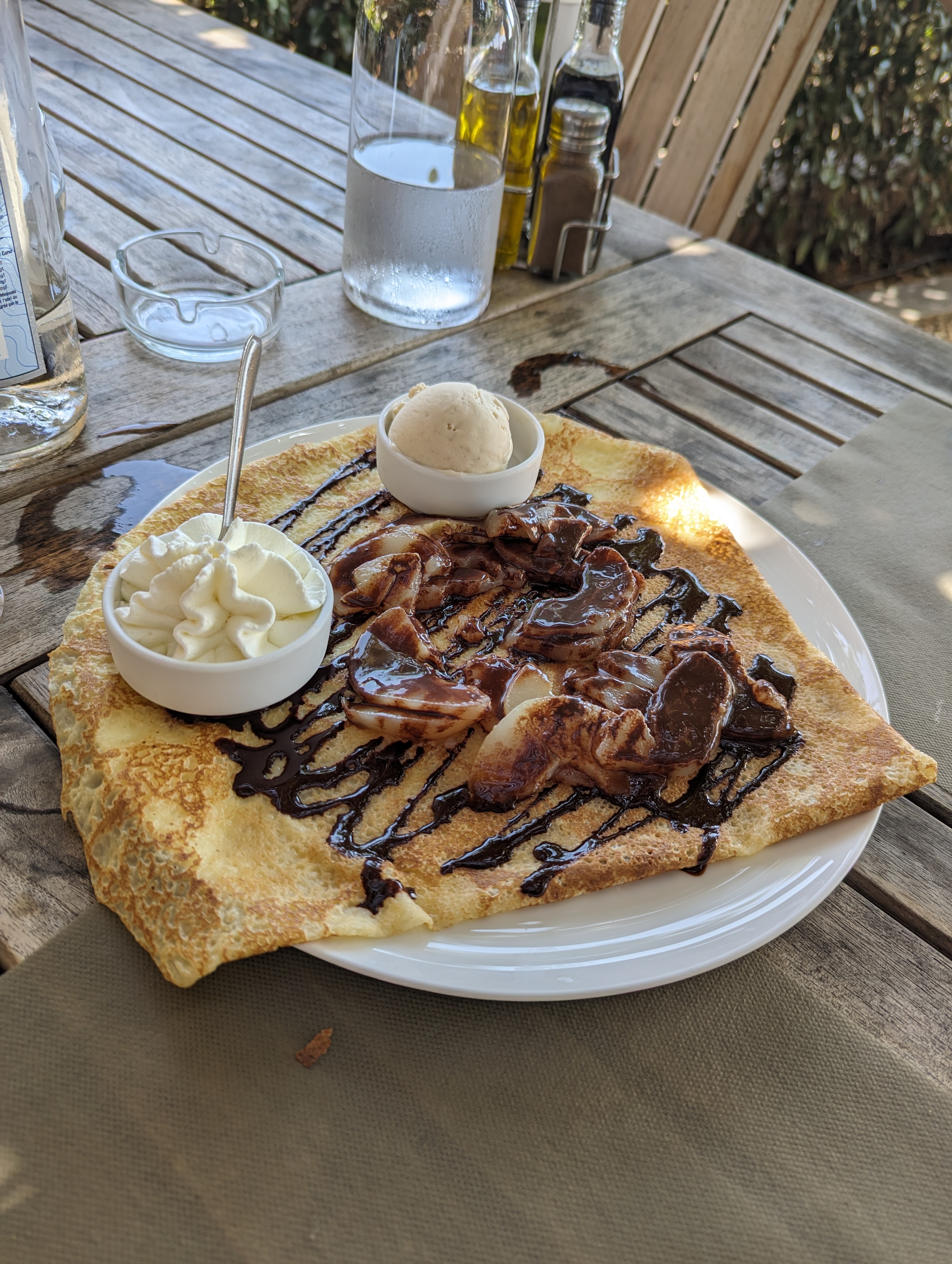 Les meilleures crêpes que j'ai jamais mangées ! L'emplacement est si beau que les mots ne peuvent pas lui rendre justice. La nourriture était simple : bon produit avec une exécution correcte. Je suis tellement content que nous nous soyons arrêtés ici.