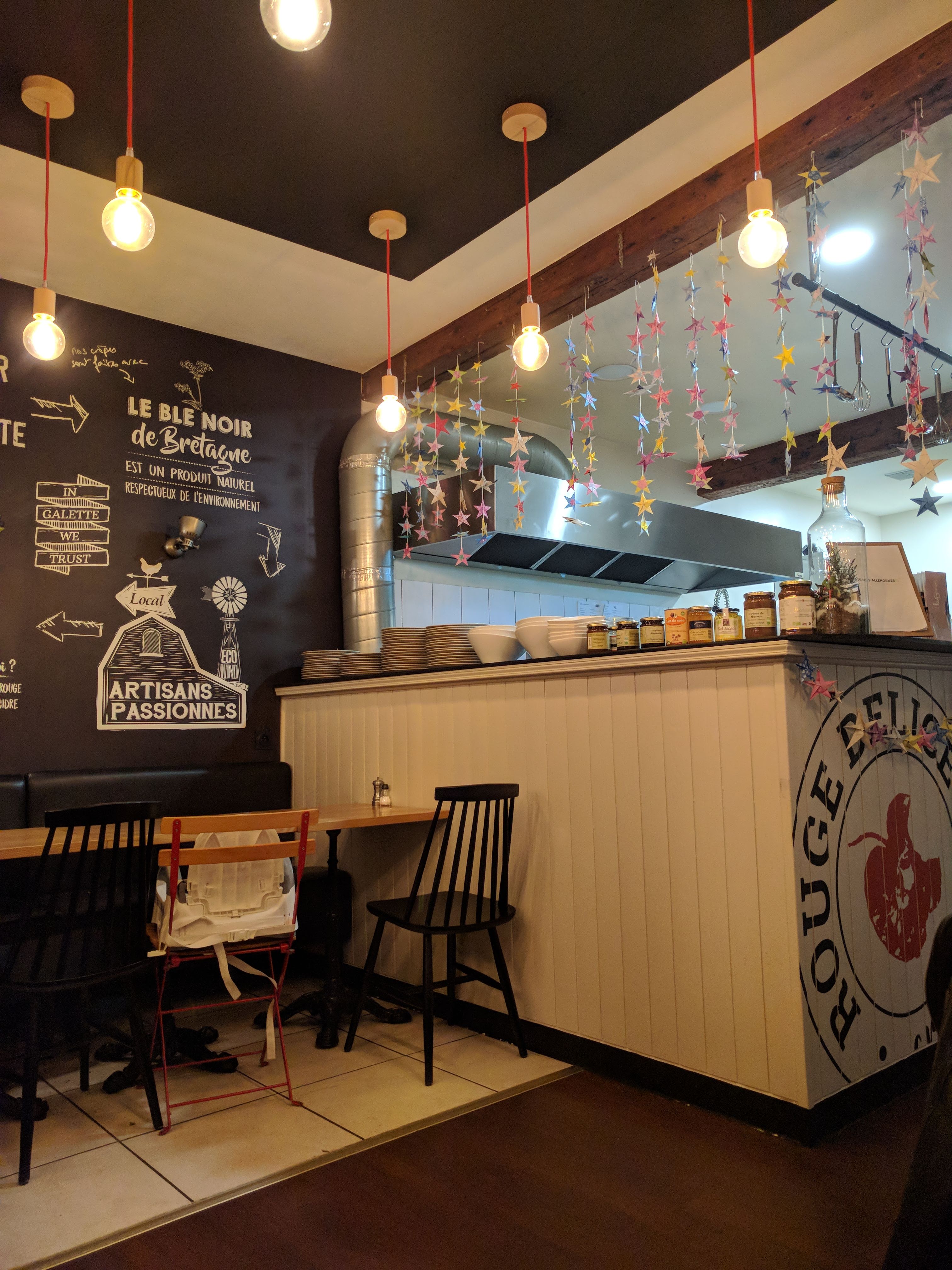 Au détour d'une ruelle, nous nous sommes arrêtés dans cette crêperie. Tout est cohérent : le code couleur rouge avec des touches de noir comme l'immense ardoise au mur. Les crêpes ont du goût ainsi que le cidre. Le service et rapide et la serveuse très agréable... bref, allez y les yeux fermés et profitez d'un bon moment autour de bonnes crêpes !