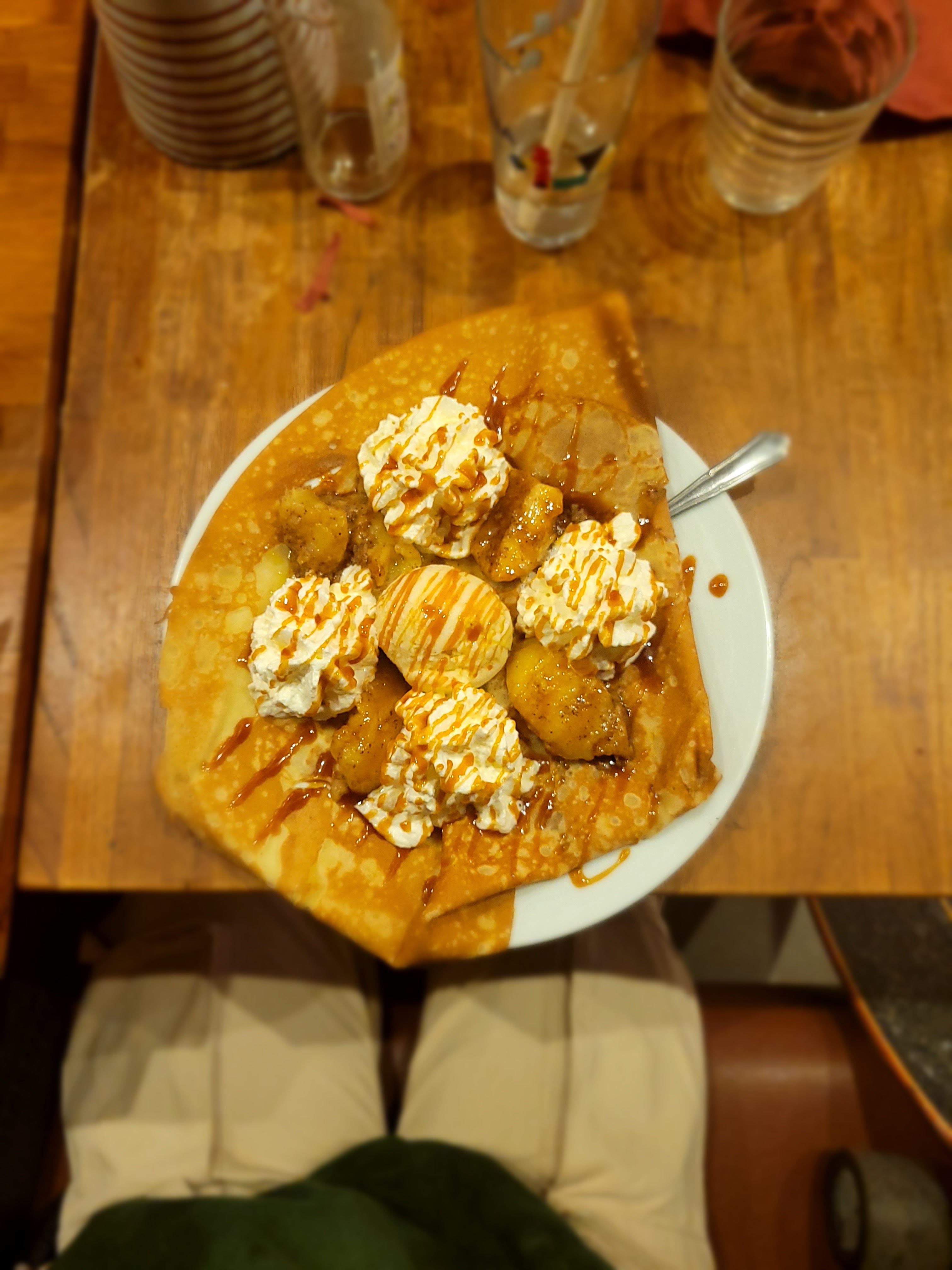 Super restaurant de crêpes. Vous pouvez manger ici des crêpes sucrées et salées avec des ajouts comme de la viande et du fromage. En plus des crêpes, le restaurant sert des salades, des desserts et des glaces. Prix attractifs. Grandes portions. Un large choix d'accessoires. Le service mérite des éloges particuliers. Le personnel est très gentil et serviable. La conversation en anglais n'est pas un problème. Les plats sont servis rapidement et efficacement. Le seul inconvénient est le manque de parkings et de bornes de recharge pour les voitures électriques.