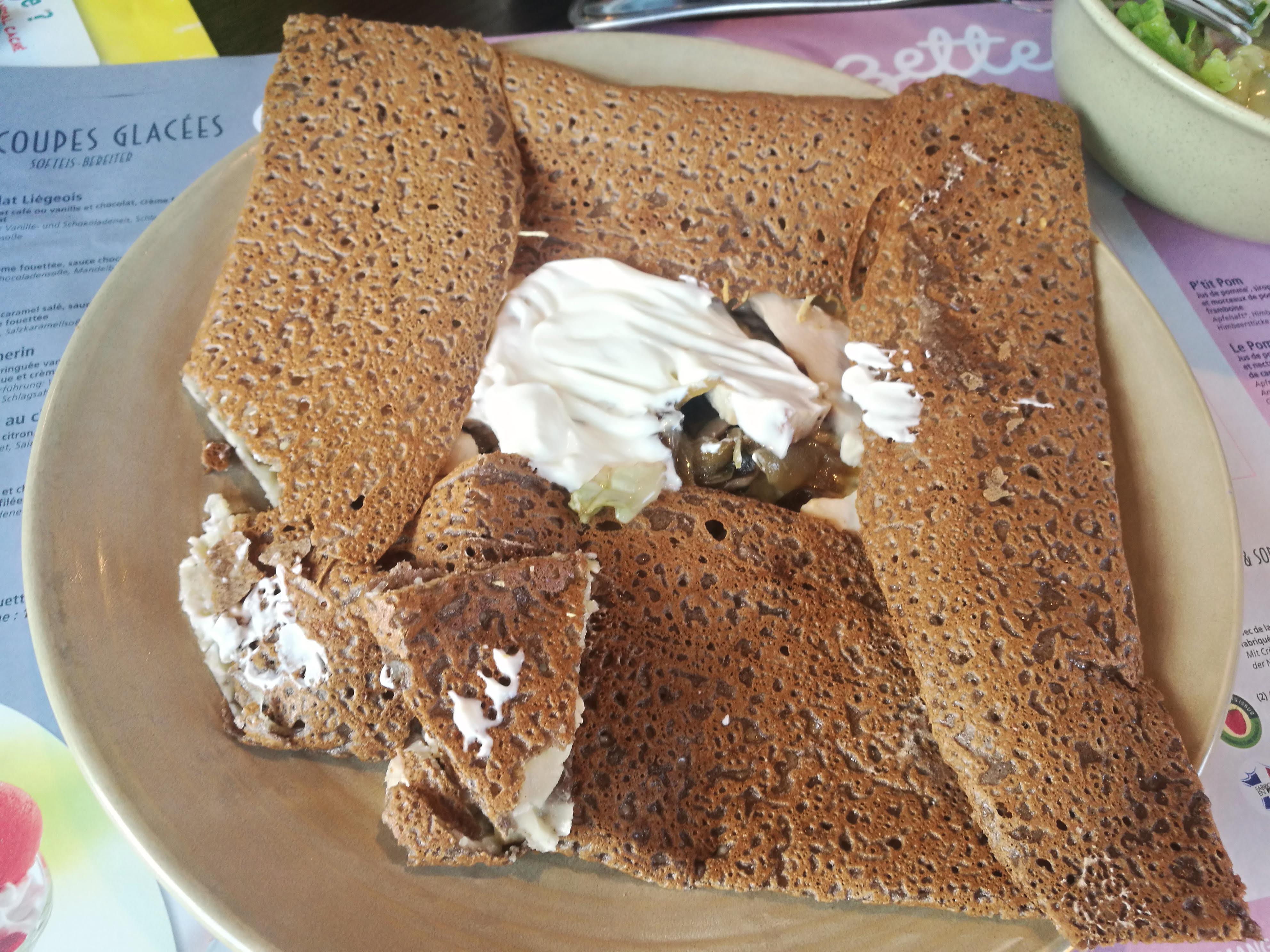 Nous sommes arrivés à 14h sans réservation. Le personnel était très sympathique et commander en allemand ne posait aucun problème. Nous avons commandé la Galette Grand Large et la Galette Bergère Chèvre. Nous n'avons pas attendu longtemps et les deux étaient vraiment bons. La portion enfants (<4 ans) était suffisante pour notre fils. Facilement la meilleure nourriture ici.