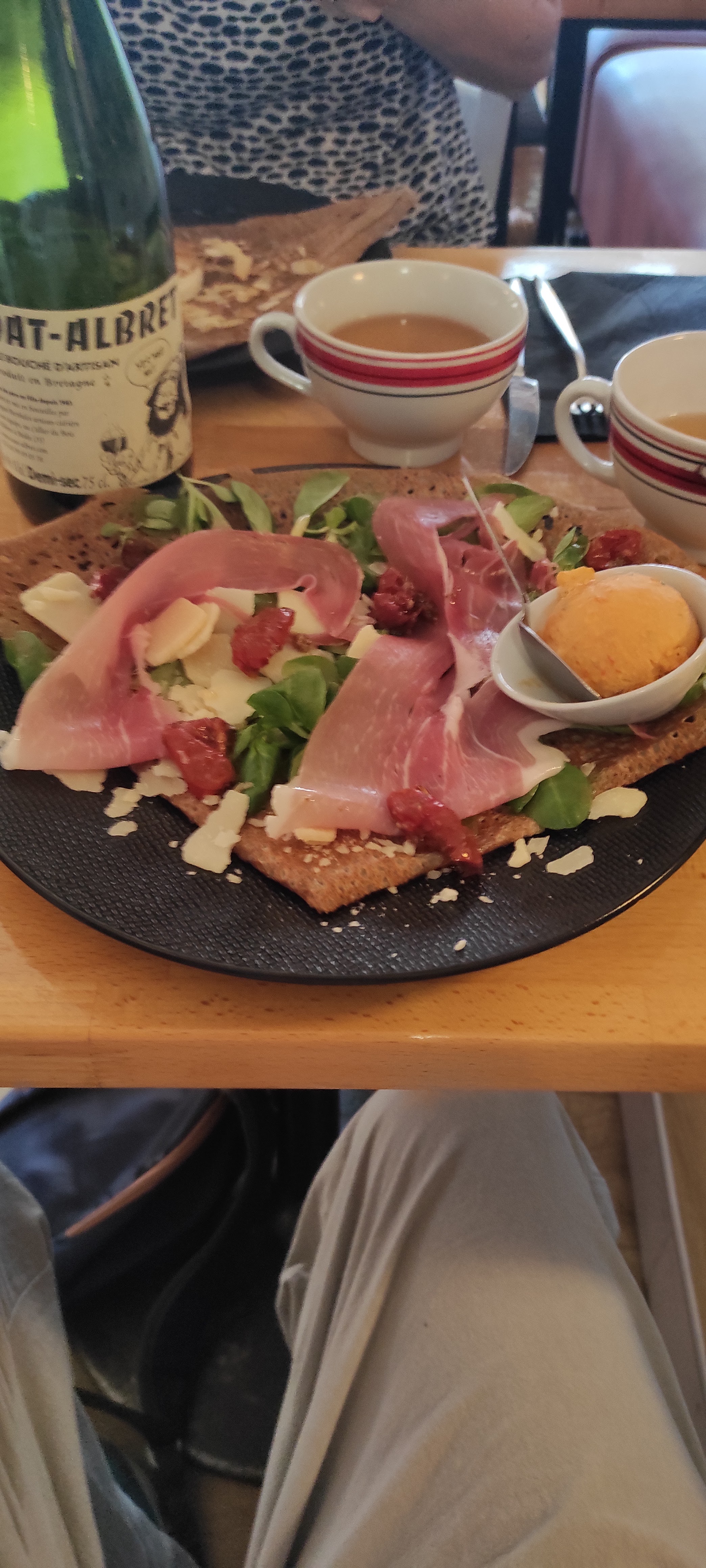 Plusieurs années sans manger de galettes (vie loin de l'Hexagone) et boum 🤩 Je retrouve le goût de mon enfance, en toute simplicité... galette sarazin de très bonne qualité et crêpe goûteuse (j'ai pris la beurre salé 🤭 une incontournable) avec bouteille de cidre demi sec paysan en circuit court (bravo pour la démarche écologique) et bon rapport qualité prix, c'est une bonne adresse à retenir pour passer ces petites soirées qui vous donnent envie de revenir...😊 👉 je recommande vivement