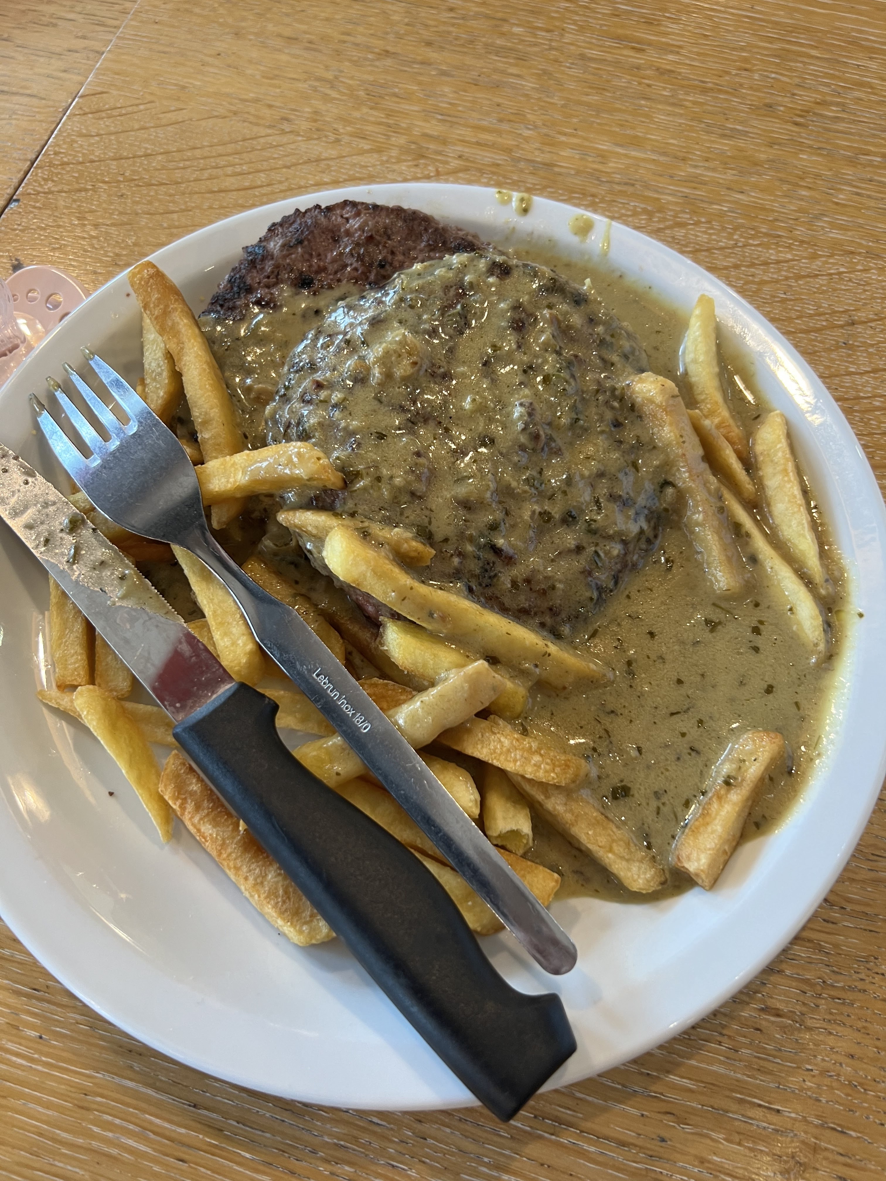 Temps de service un peu long , viande brûlée et sauce au poivre extrêmement forte ( ce n'était pas normal ) , néanmoins le personnel est souriant et agréable