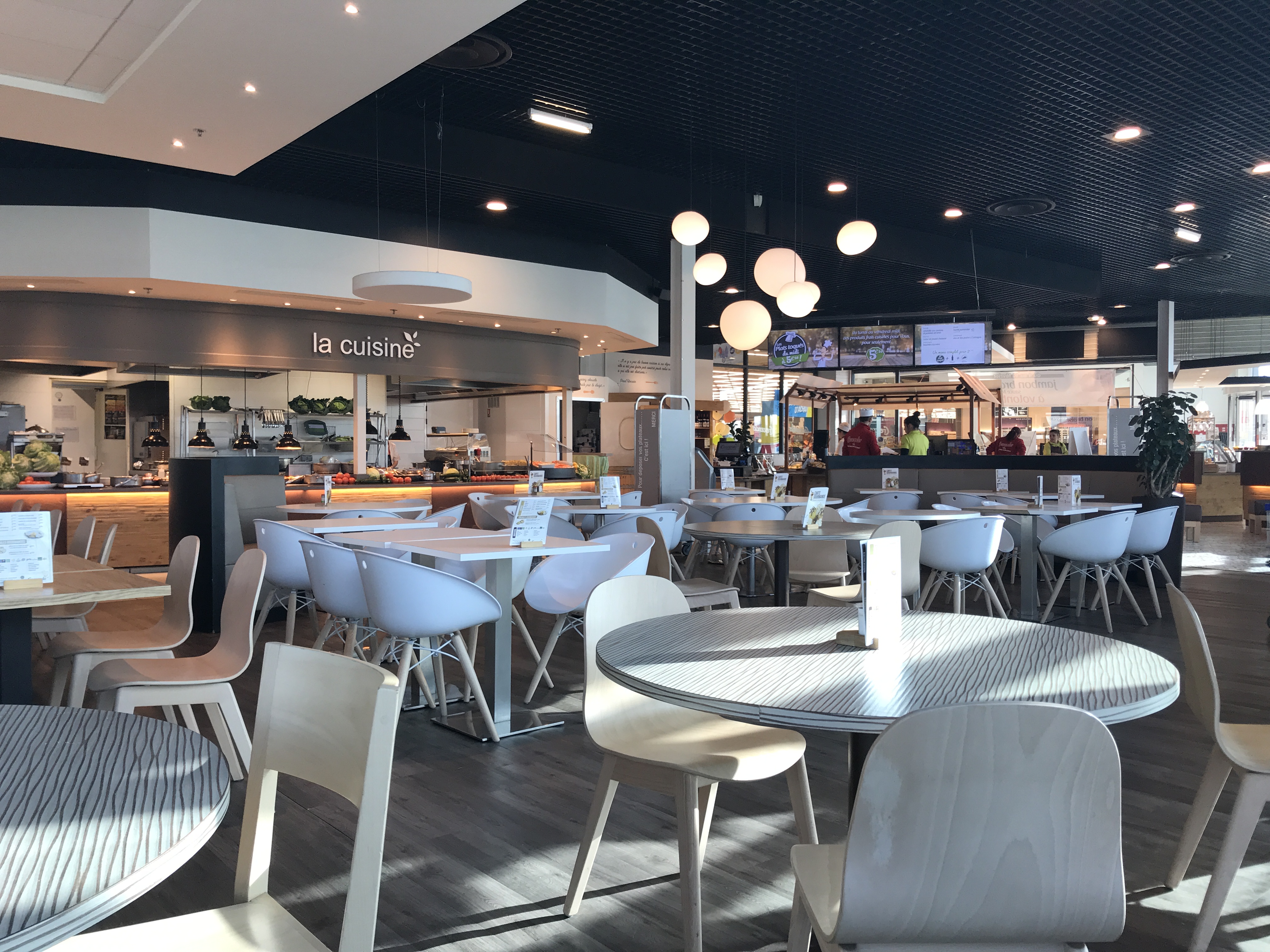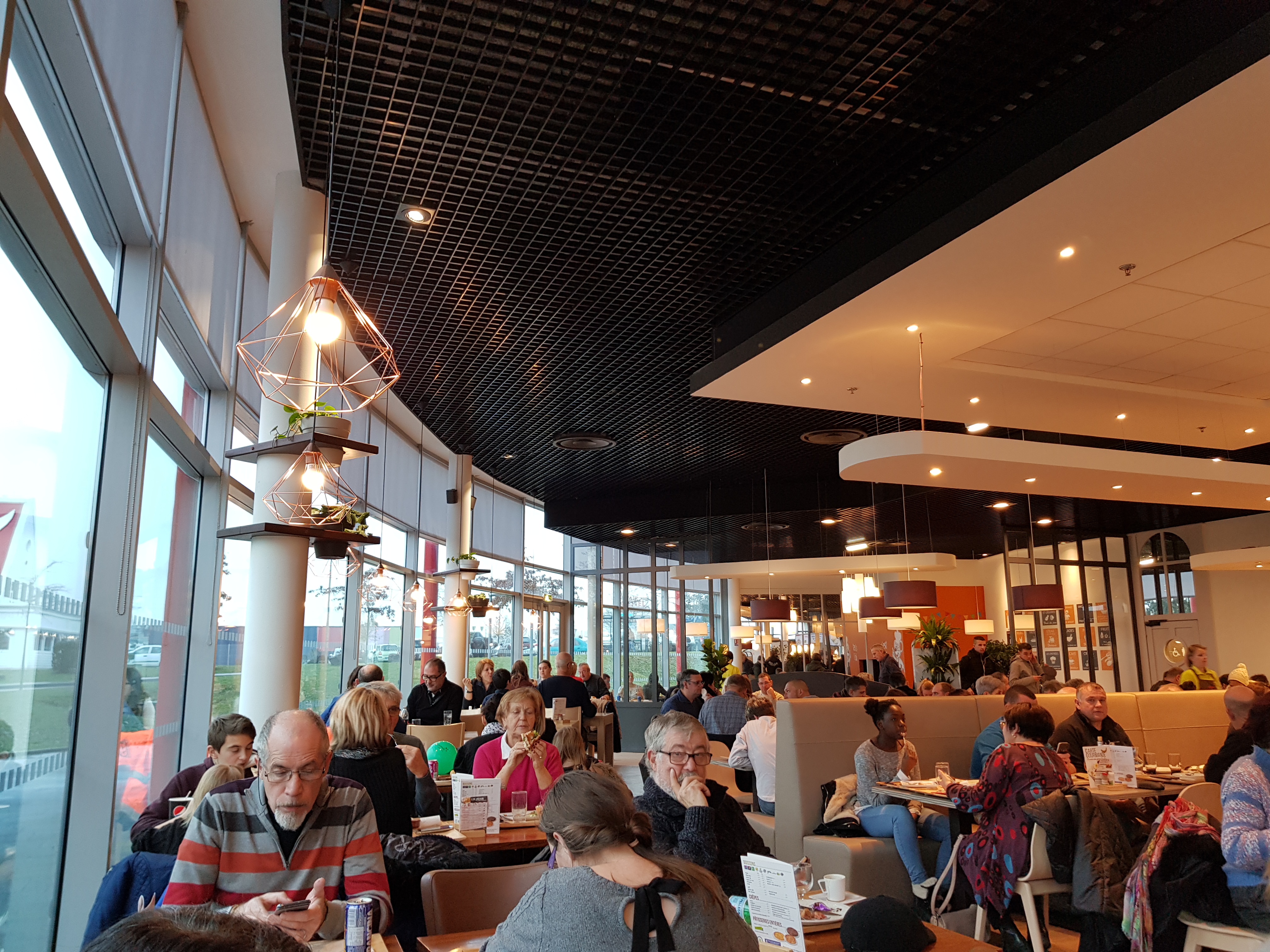 Bel espace vitré lumineux, des plats cuisinés sur place. Prix correctes. L'environnement est bruyant et la musique dite de fond est trop forte. Attention, on est au resto pas en discothèque ! Il y a des caissiers extrêmement sympathiques et d'autres limites désagréables.