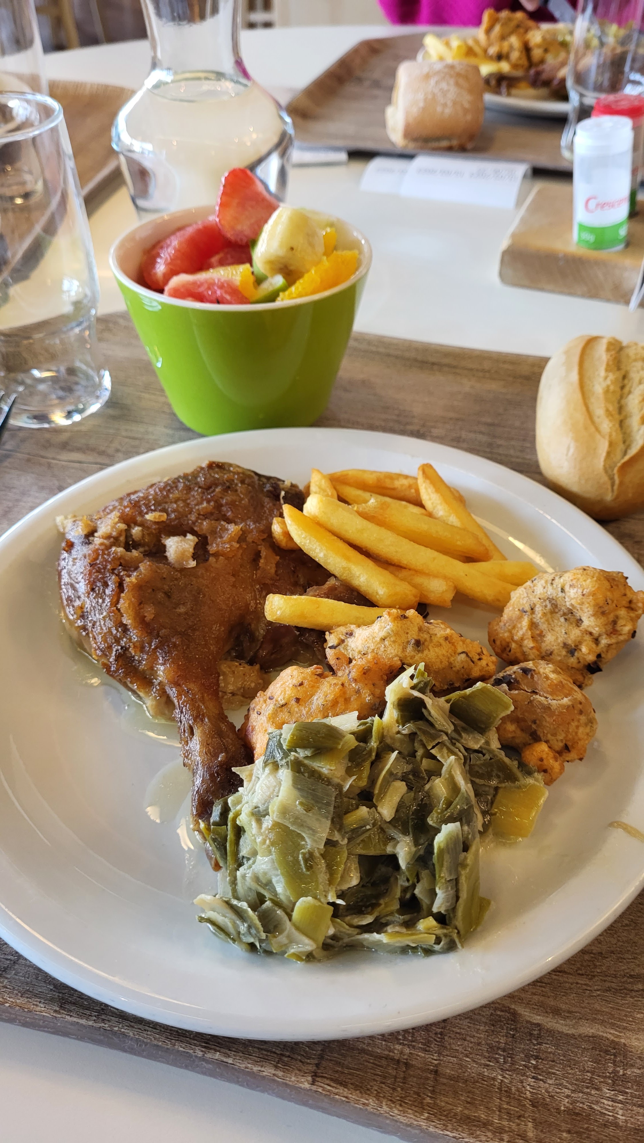 Grosse déception,choisir une assiette de légumes pour n avoir que des féculents ,le gratin de poireaux pas cuit ,très fade ,quelques courgettes ,et 3 aubergines qui se courent après ,par contre du riz ,des pâtes ,des frites remis régulièrement mais pas de légumes ..mon mari a pris une tartelette au fraises manque de fraîcheur .. déçu cette fois .