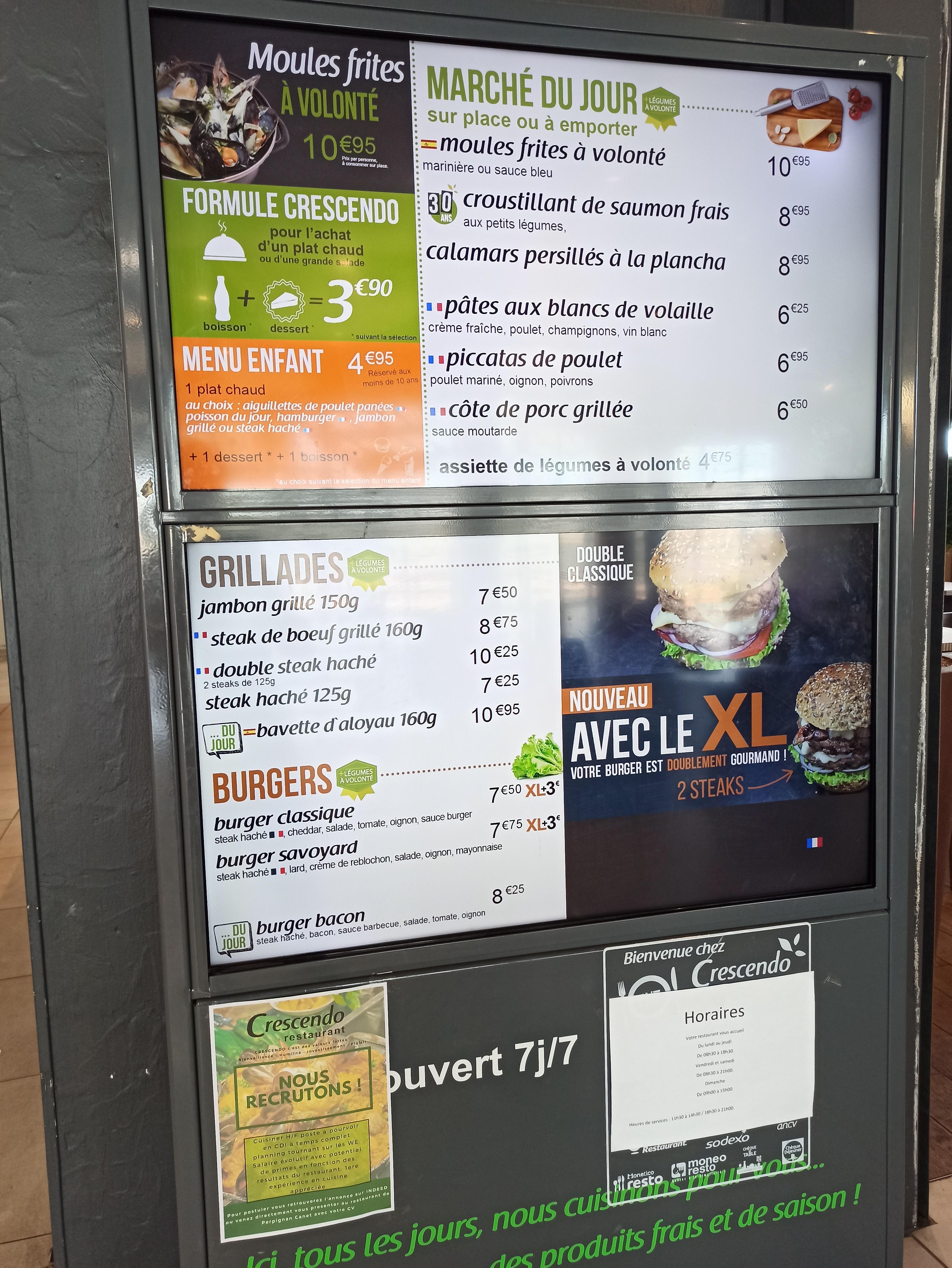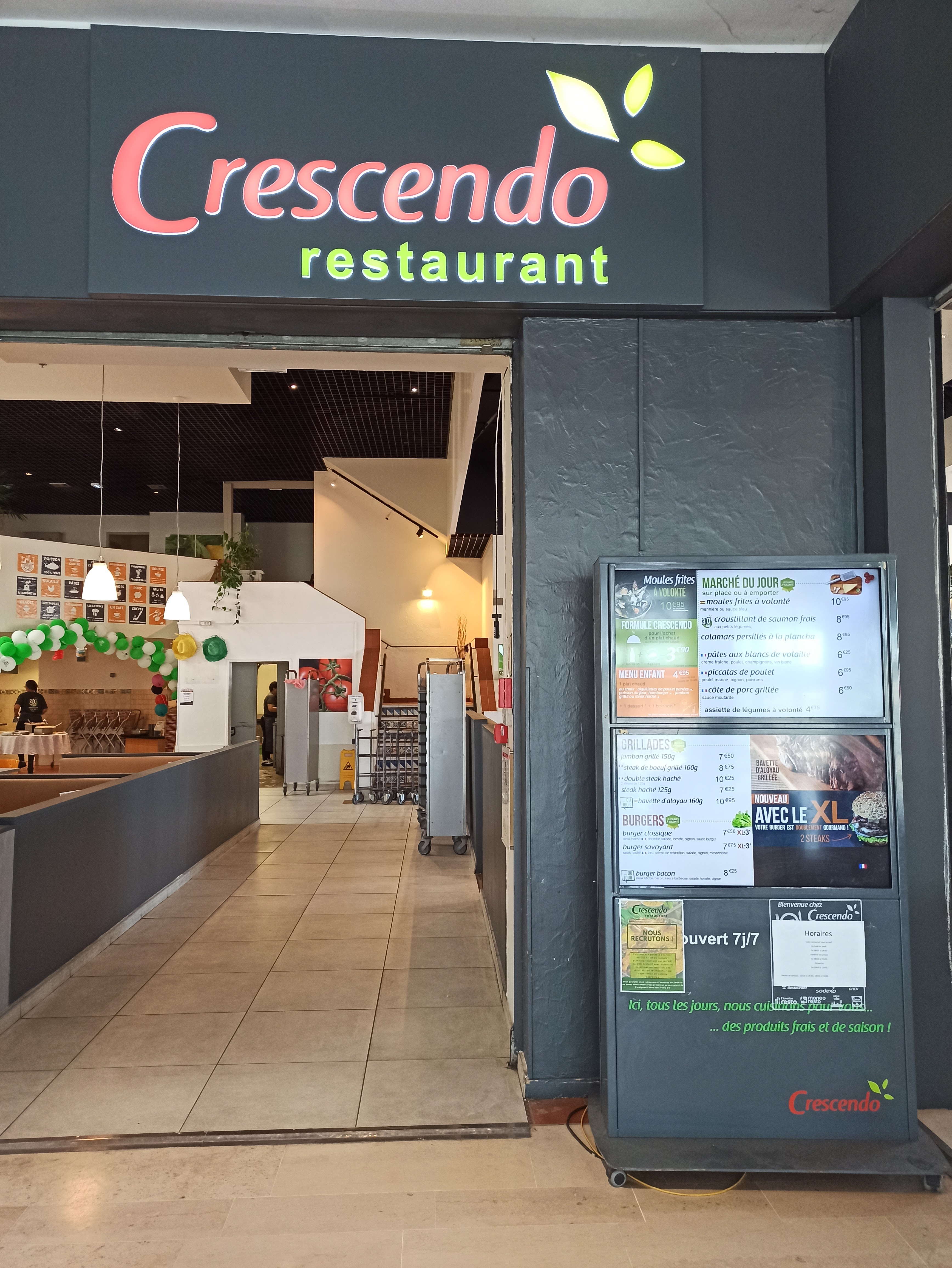 Nous allons faire nos courses à carrefour canet nous prenons souvent nos repas à crescendo c est 7n endroit familial les repas sont simples mais bons il y a le choix le personnel très à l écoute des clients j ai aujourd'hui testé une nouvelle coupe de glace un delice