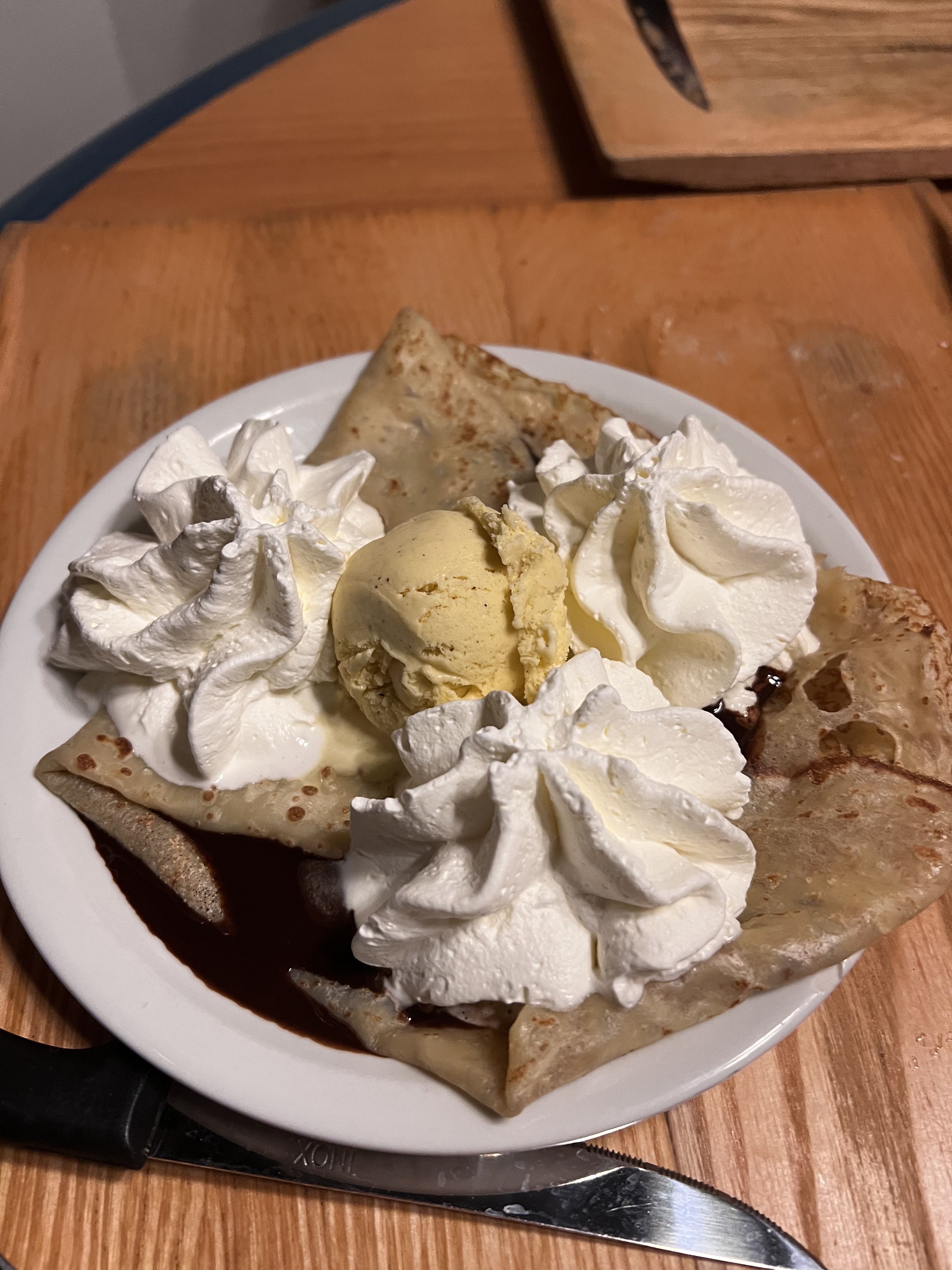 Food : Nos crêpes sont très bonnes. Service : Serveuse très aimable et souriant Atmosphère : Très chaleureux