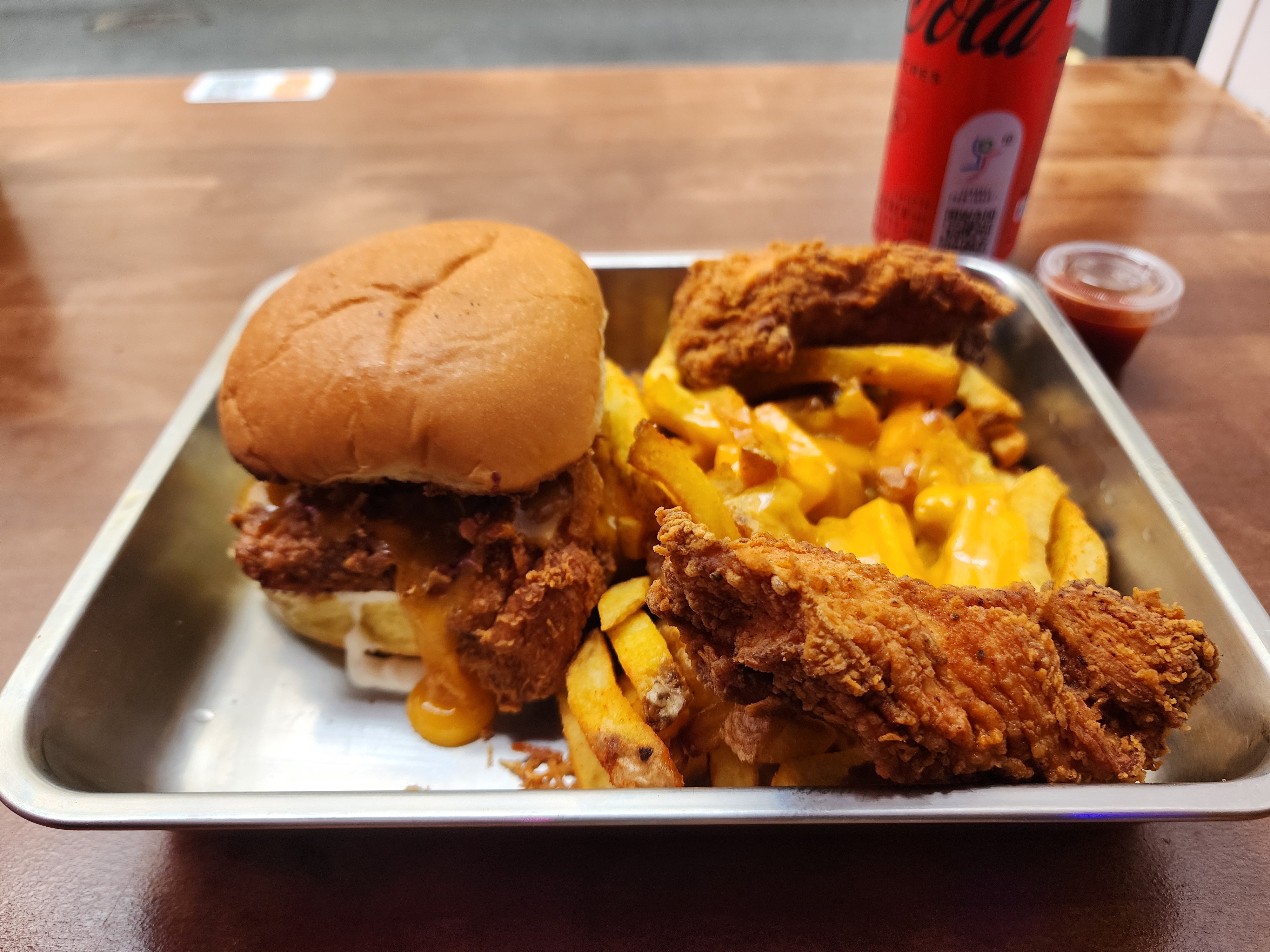 Énorme découverte du mois, ce restaurant sort du lot et mérites leur succès. J'en ai goûté des enseignes de poulet frit mais celle-ci n'est se démarque énormément. J'ai pris un burger Crispy Spicy accompagné de frites cheddar et 2 tenders. Les frites au cheddar sont très bonnes, épicées au paprika. Le goût du cheddar est juste parfait, il sera pas jaune et luisant comme Burger King ou Macdo (industriel) mais un vrai goût de cheddar artisanal. Les tenders sont très bons aussi rien à dire, pané comme il faut et consistant. Le burger c'est vraiment un goût différent à chaque bouchés avec une texture moelleuse et laissant passer toutes les saveurs des sauces et accompagnement. Le filet de poulet et lui aussi généreux. Je recommande très bon rapport qualité/prix.