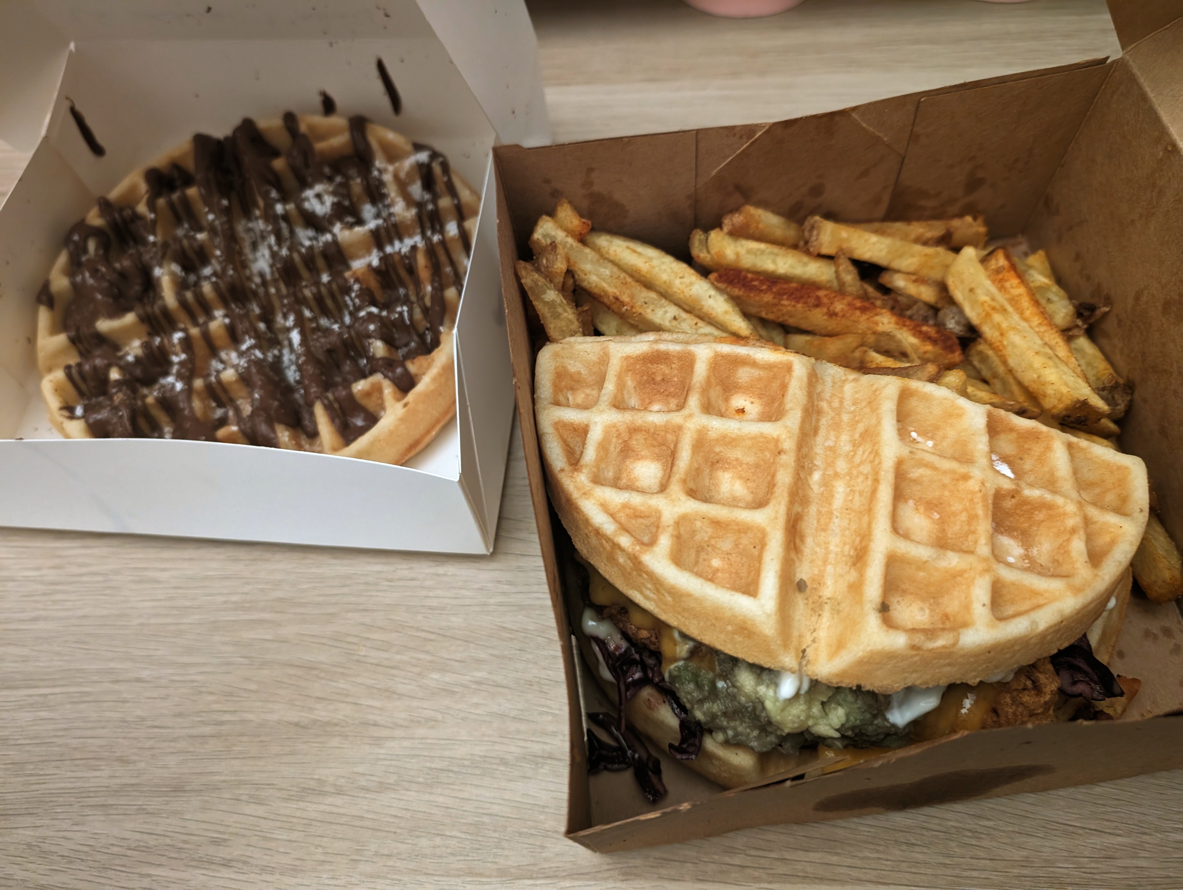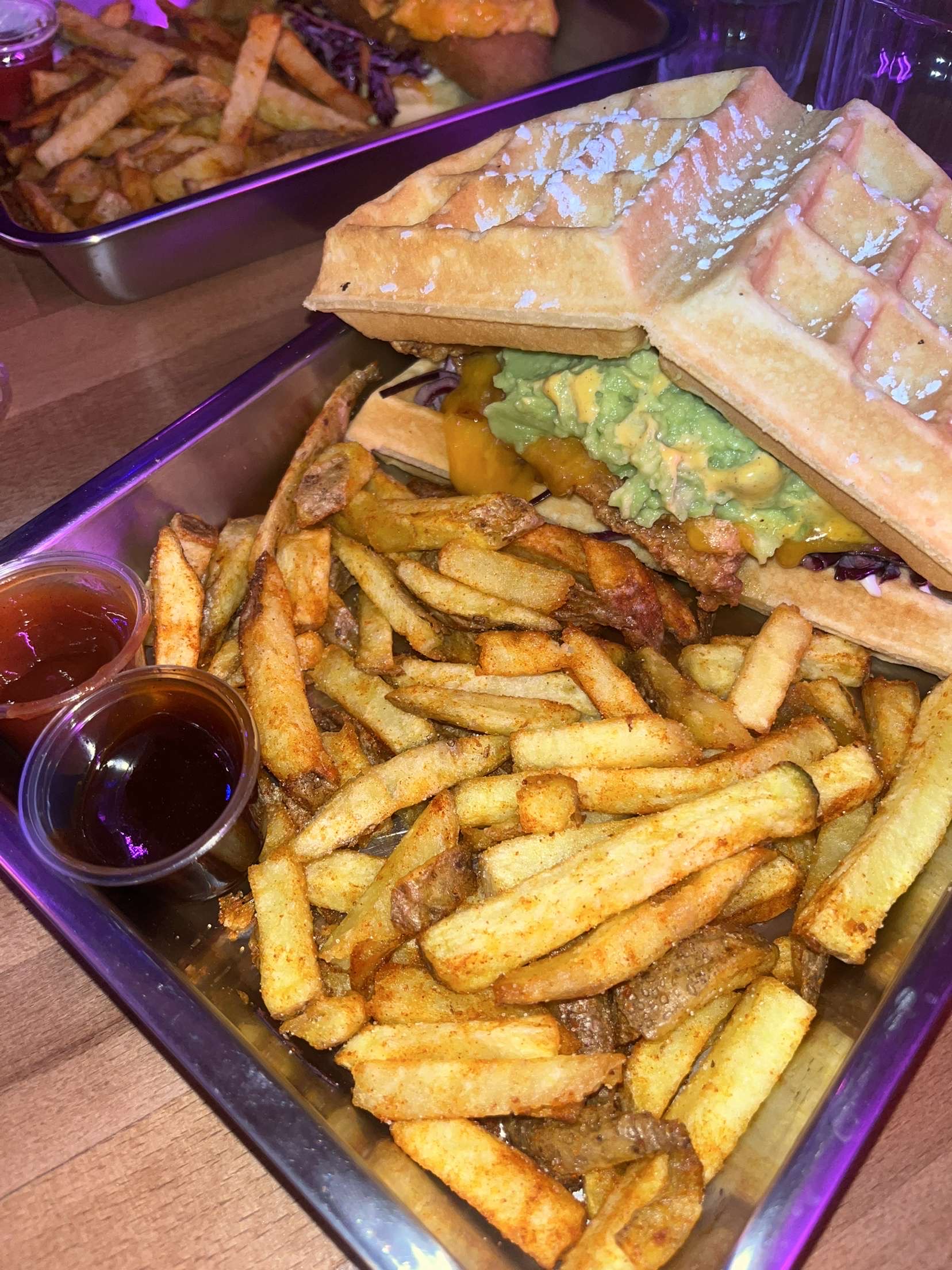J'ai découvert ce restaurant par hasard et quelle belle surprise ! Ce que j'aime particulièrement dans leur waffle burgers : la gaufre est vraiment moelleuse. J'ai pris le Joaquin Guzman : avec de l'écrasé d'avocat et du poulet frit mariné, on se mange les doigts ! La première fois, je suis venue avec une amie et on a mangé sur place. J'ai tellement aimé que j'y suis retournée trois jours plus tard pour une commande à emporter (c'est l'avantage d'habiter tout près). D'ailleurs en cadeau j'ai eu une gaufre sucrée :) Petits bonus qui ont leur importance : la musique est bonne et le personnel est grave sympa.