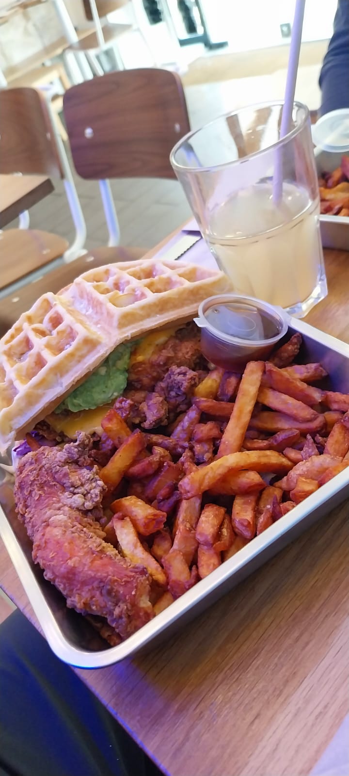 Idée originale de remplacer le pain par des gaufres. Je pensais que ça allait être lourd mais pas du tout, les frites sont fraîches et la citronnade maison est bonne 👍🏽