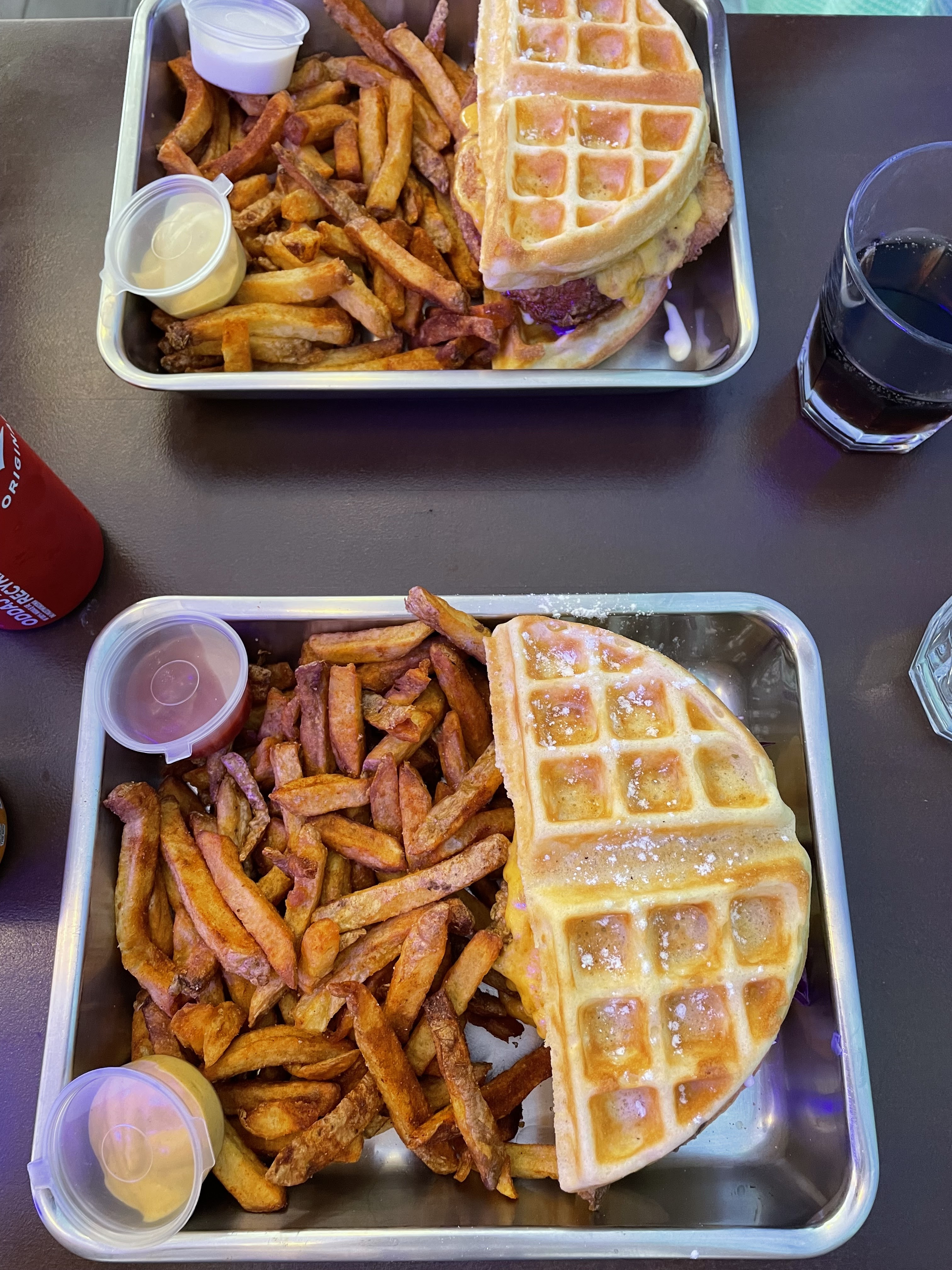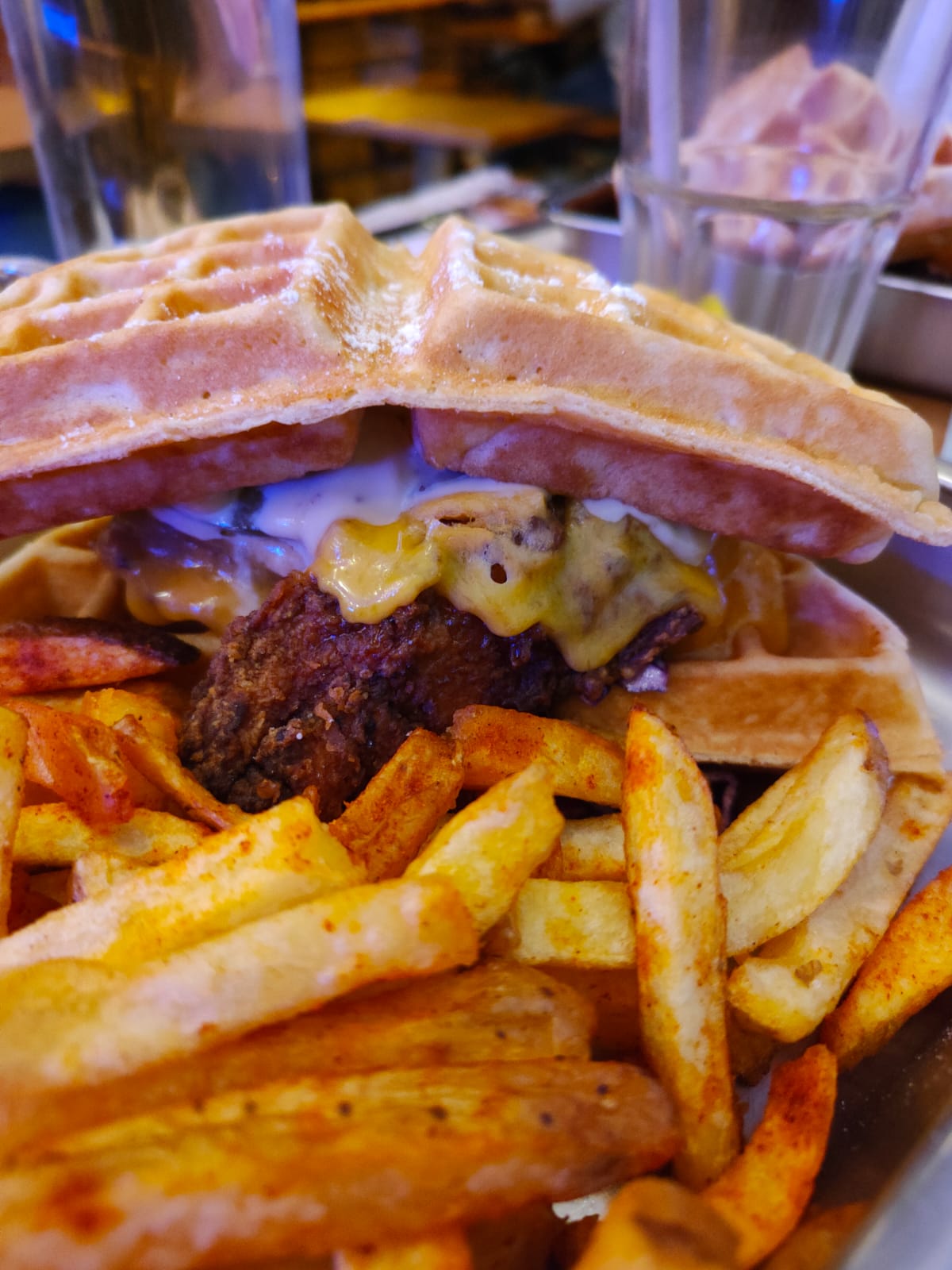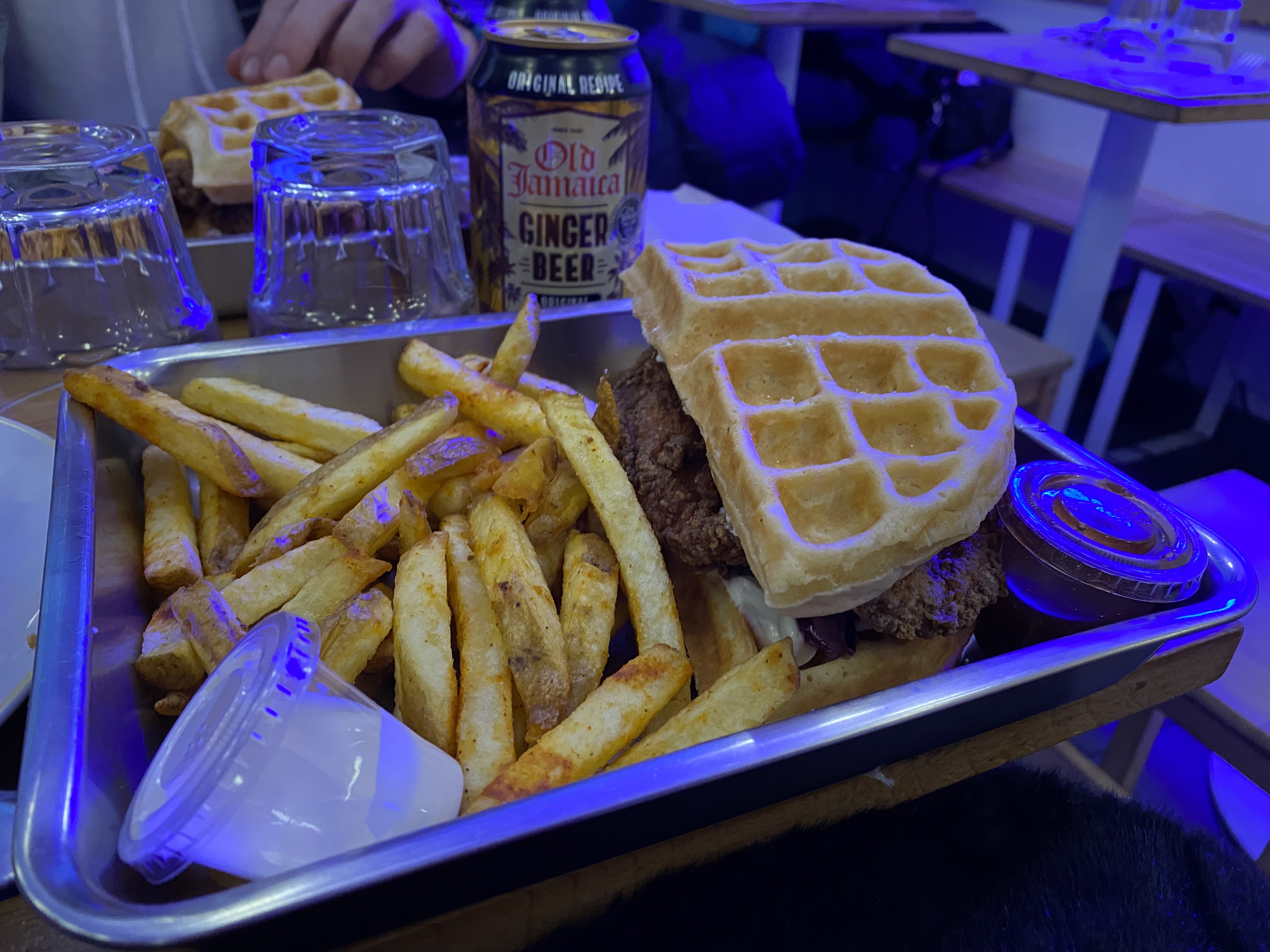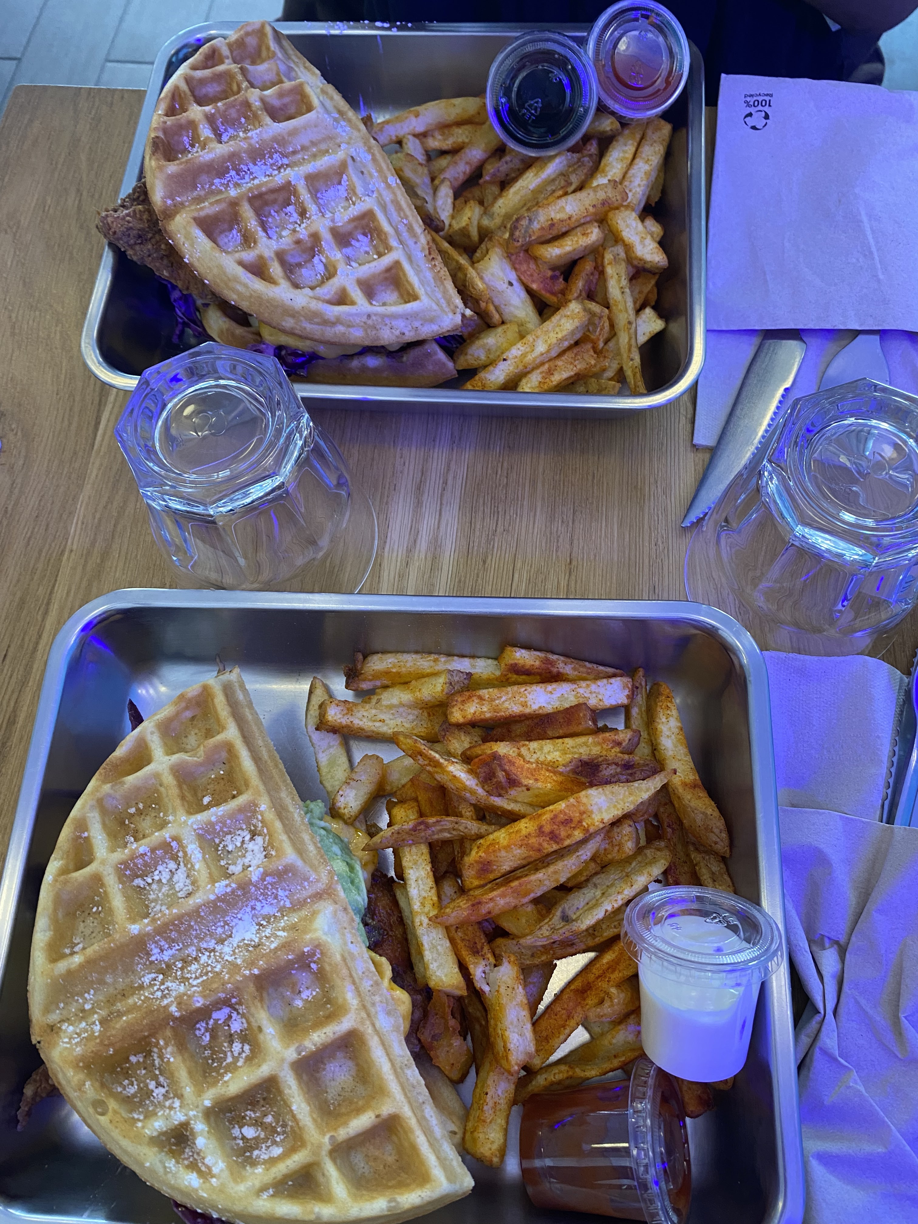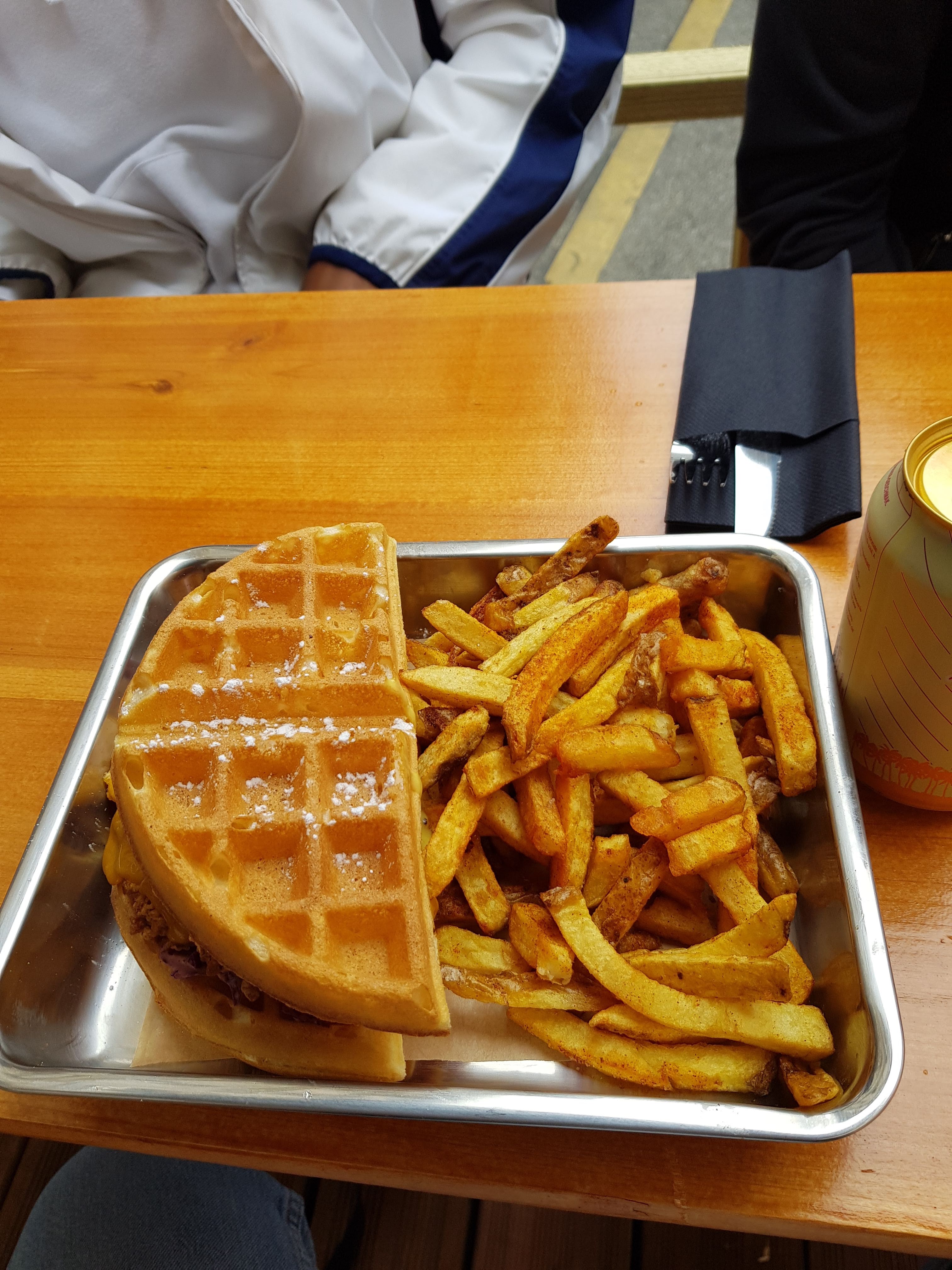 Alors déjà il ne font pas de tarif menu le week-end, c’est bon à savoir pour commencer. Ensuite le poulet frit est très bon ainsi que les frites, mais le Burger à la gaufre est un peu écœurant. J’aurai du prendre le classique qui avait l’air bien bon sur la table d’à côté !