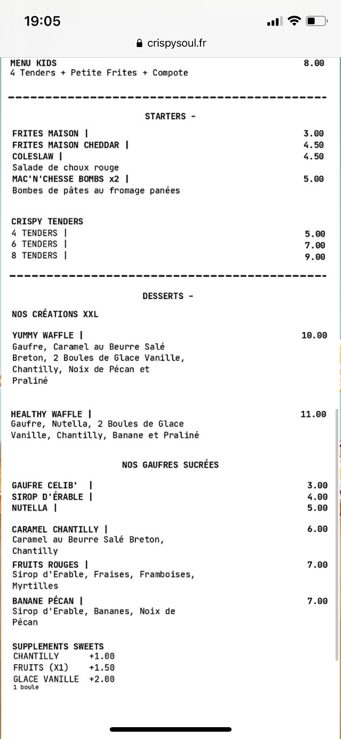 Définitivement les meilleurs Waffles salés de Paris Le poulet est ultra tendre, la viande est Halal Les waffles sont parfaites Le service est super, on est toujours bien reçu. Vous pouvez aussi trouver Crispy Soul en livraison Les prix sont ultra corrects : environ 14€ le menu avec le waffle burger + les frites (possible avec cheddar et c’est super ou frites de patates douces) Rien à redire c’est 5 étoiles