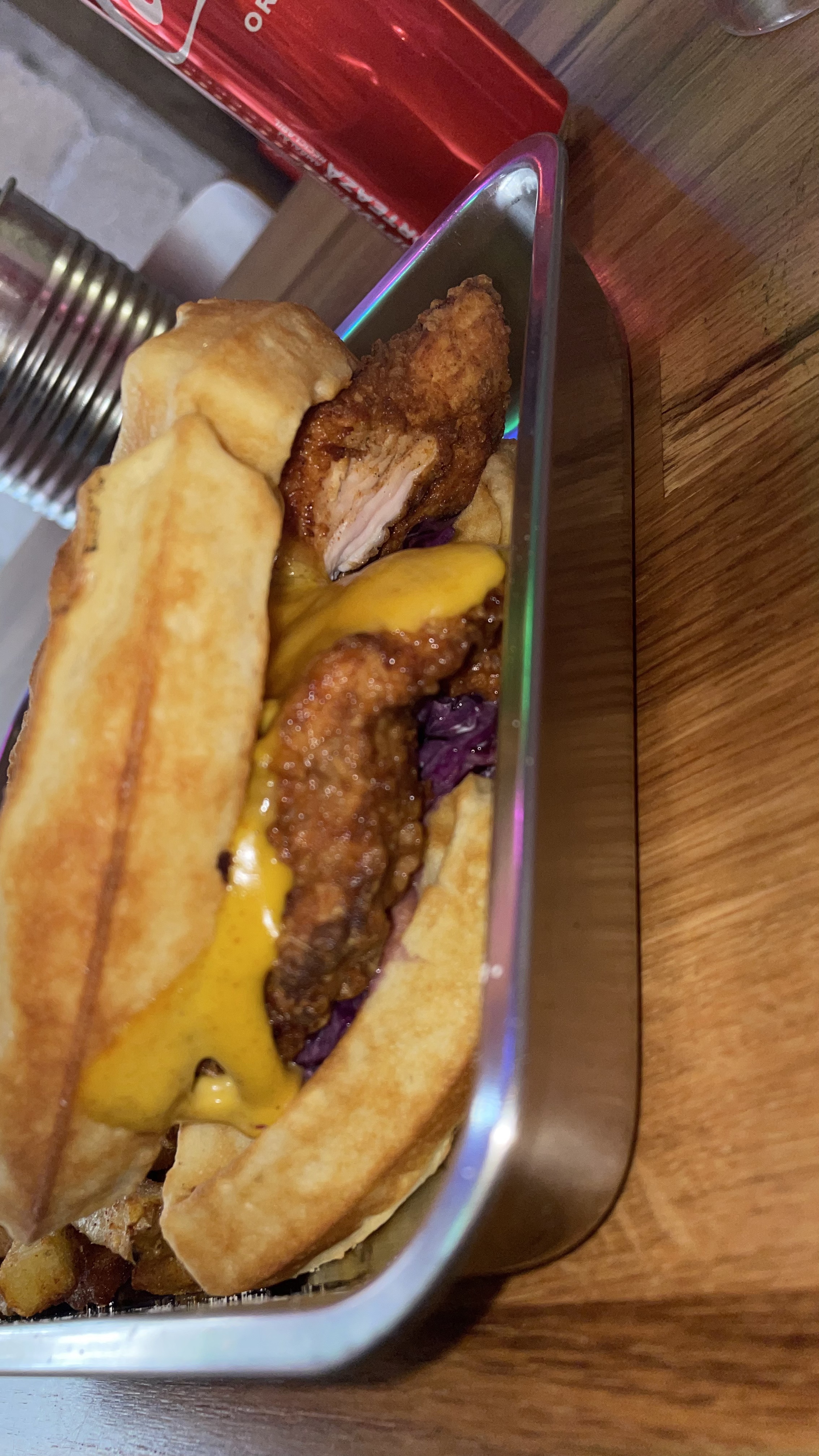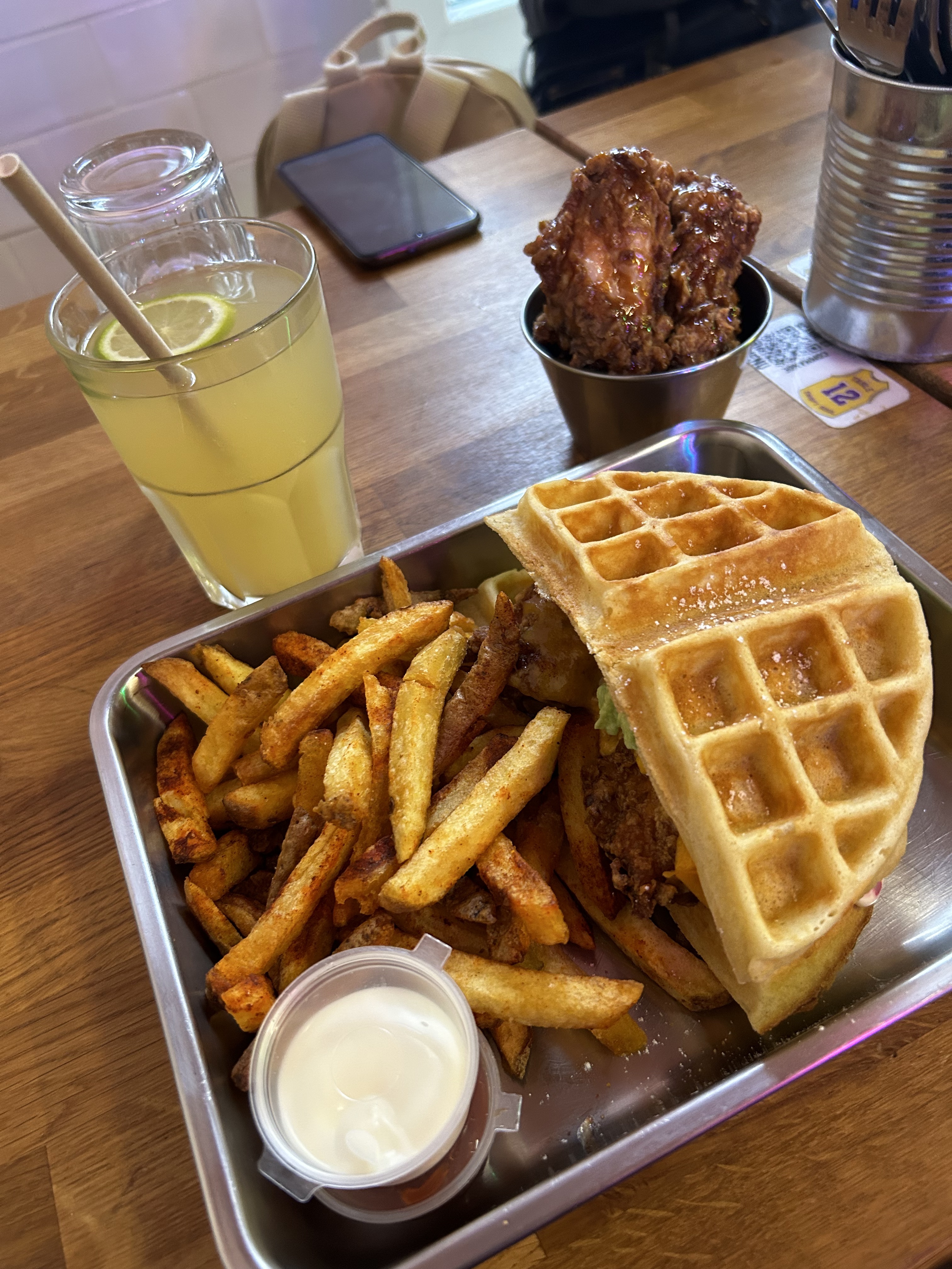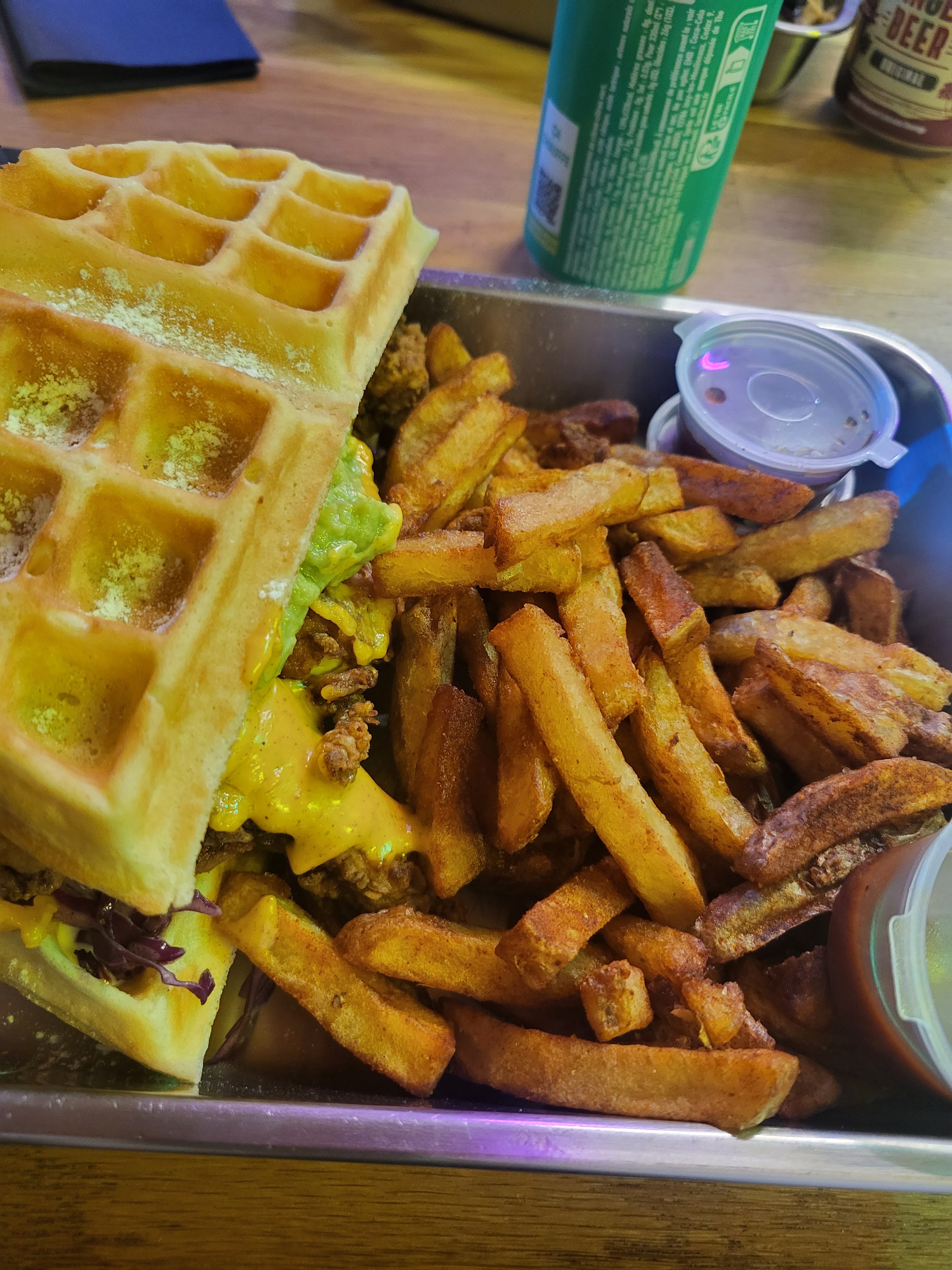 Je trouvais le concept intéressant. L'accueil est correct, sans plus. J'étais au rez-de-chaussée et j'ai trouvé le décor un peu simple. J'ai pris une gaufre au poulet frit avec guacamole et coleslaw de chou rouge à l'intérieur, avec une ginger beer. C'était très bon, roboratif mais avec une certaine finesse. Expérience intéressante mais pas le repas du siècle.