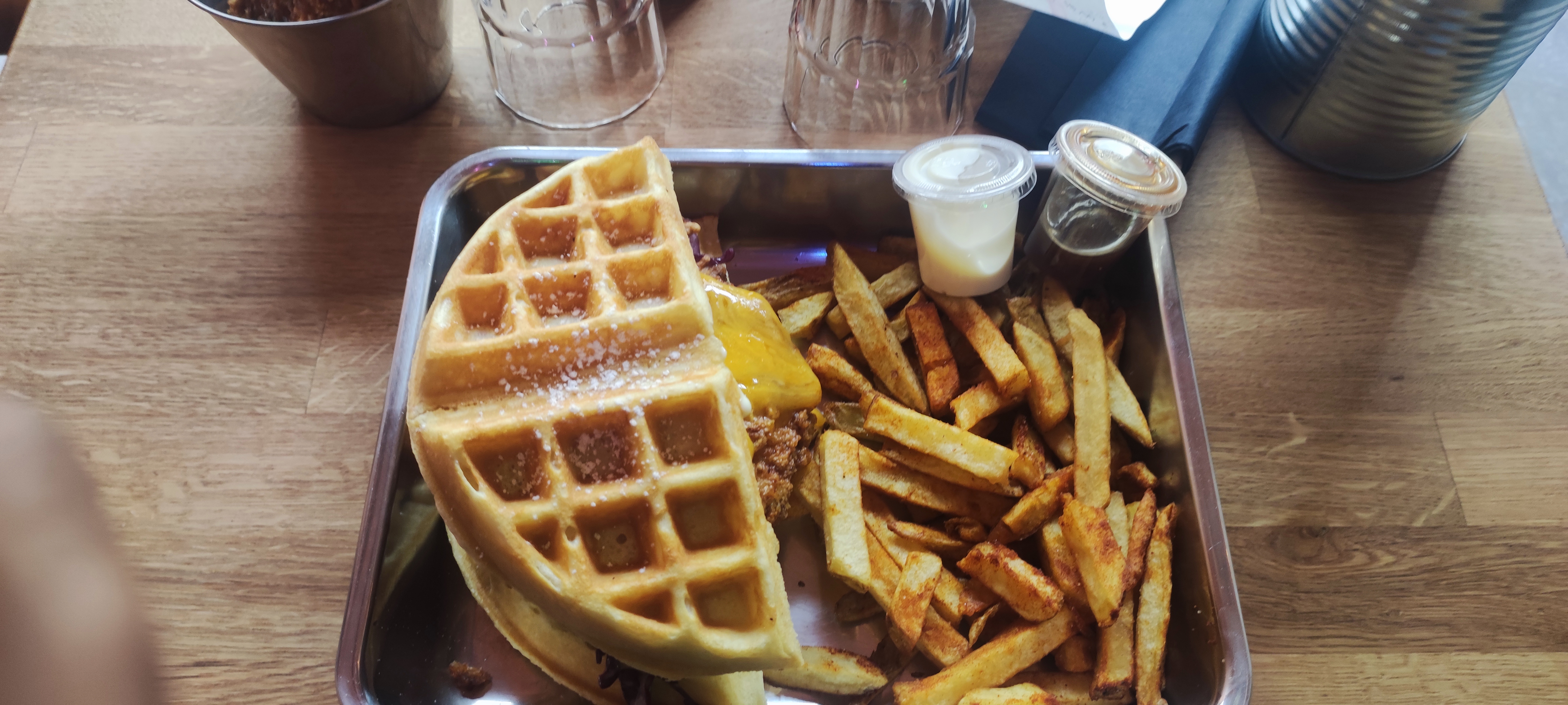Dans l’ensemble c’était bon, frite maison très bonne également le poulet crispy par contre le waffle avec le poulet etc était un peu trop sucré pour un plat salé …