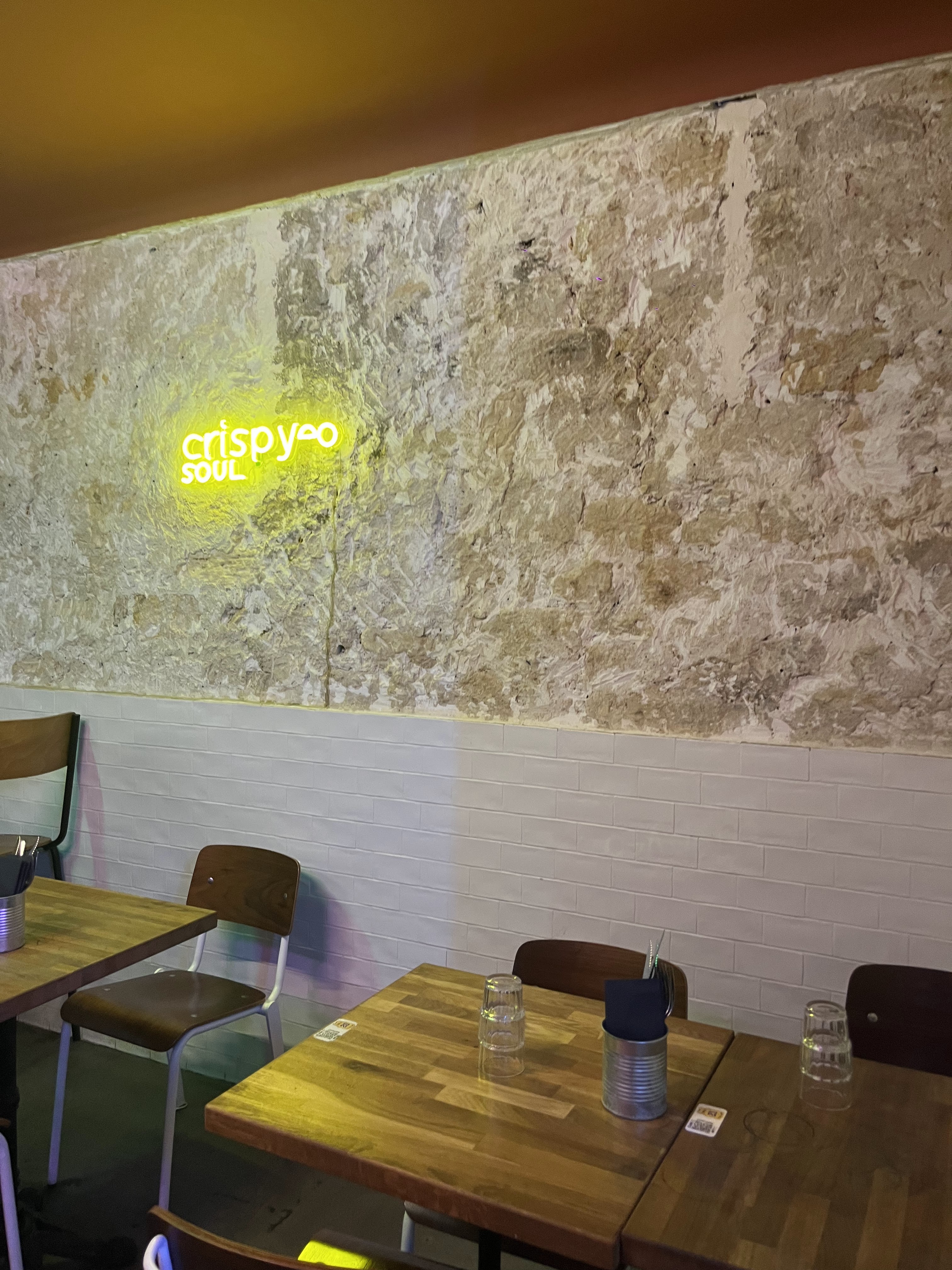 Lieu très cosy, nous étions arrivées en premier donc nous n'avons pas pu accéder au premier étage car il fallait d'abord que le bas soit plein (dommage), mais le serveur était très sympathique et la musique était super ! Concernant l'assiette : les plats sont arrivés très vite et c'était très bon, le poulet était bien mariné et les gaufres parfaites. Les frites étaient également assaisonnées donc elles étaient très bonnes. Le rapport qualité-prix est top donc je recommande vivement, merci au Crispy Soul !!