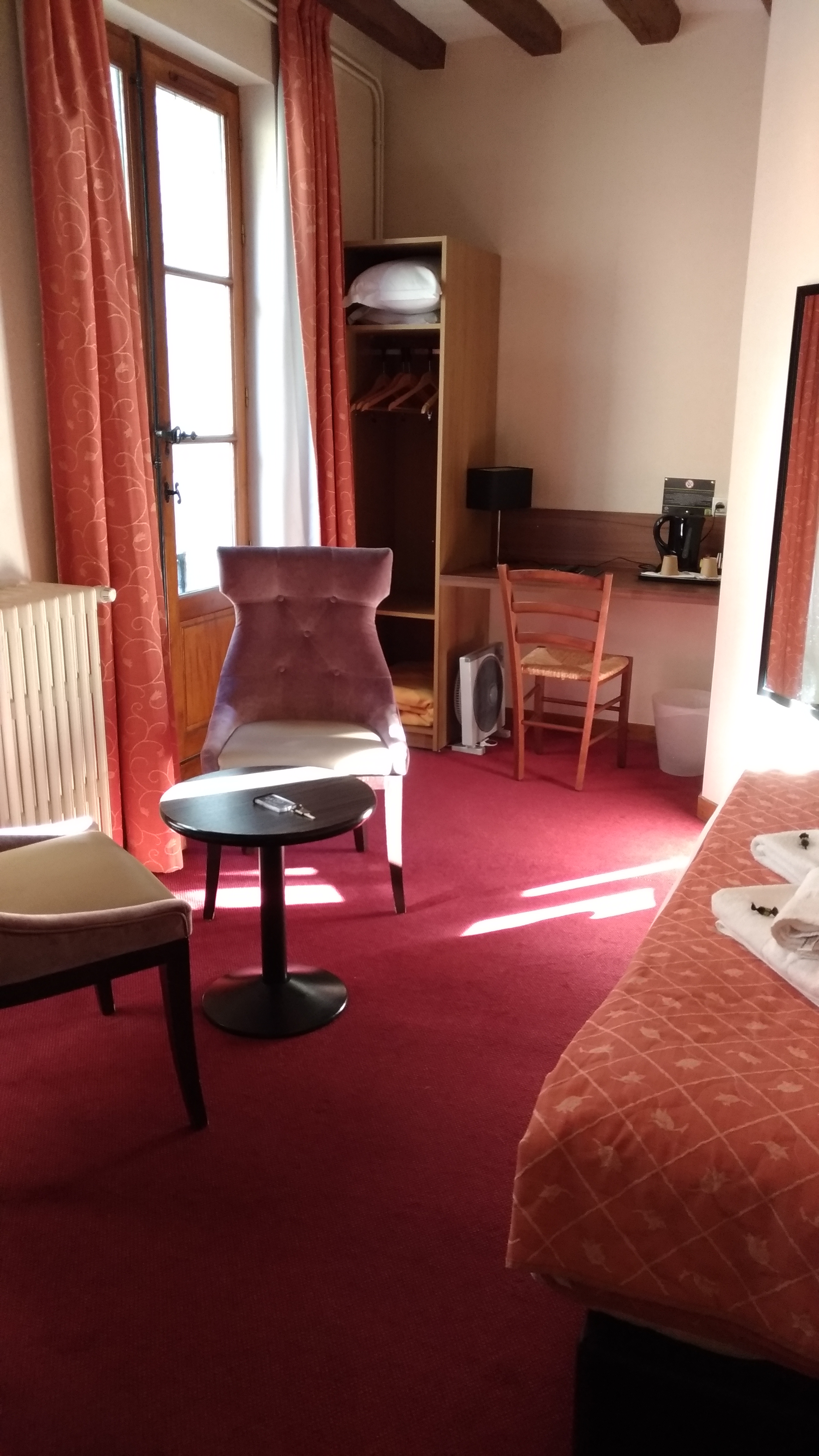 Chambre 25 spacieuse mais le lit grince Donne face à un mur de la mairie, dans une ruelle bruyante mais l'avantage c'est de trouver sous le lit des bouchons d'oreilles usagées parmi la poussière. Sympa la bouilloire mais couvercle cassée Quant à la salle de bain, couvercle et abattant de toilette cassés et trop petit. La douche fuit sur le sol. Obligé de revisser la poignée de porte de la salle de bain pour éviter qu'elle tombe. Mais pas pu revisser les portes peignoir qui était hors-service. Dîner correct éviter carbonara qui sont trop grasses avec du chou rouge dedans. Quant au petit-déjeuner que nous avons demandé en chambres pour 5 € supplémentaires par personne très moyen il manquait les serviettes et les viennoiseries juste un morceau de pain et de la confiture pour 15 €. Nous avons fait part de nos désagréments au moment de partir à la réception mais aucun geste commercial nous n'y retournerons pas.