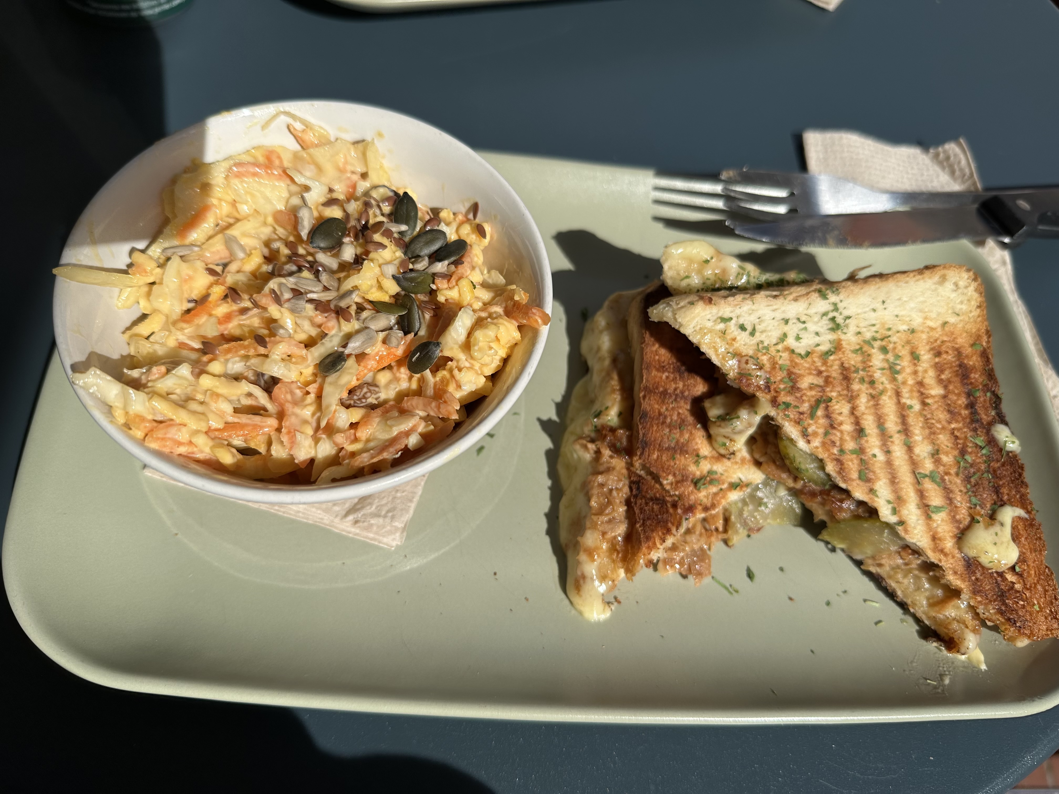 Bonne nourriture et personnel adorable. J'ai eu le croque le Brexit et c'était délicieux et plein de saveurs. Vous pouvez choisir un plat d'accompagnement et j'ai choisi la salade de chou qui était incroyable mais aussi une recette secrète ! Une grande sélection de fromages y est également disponible.