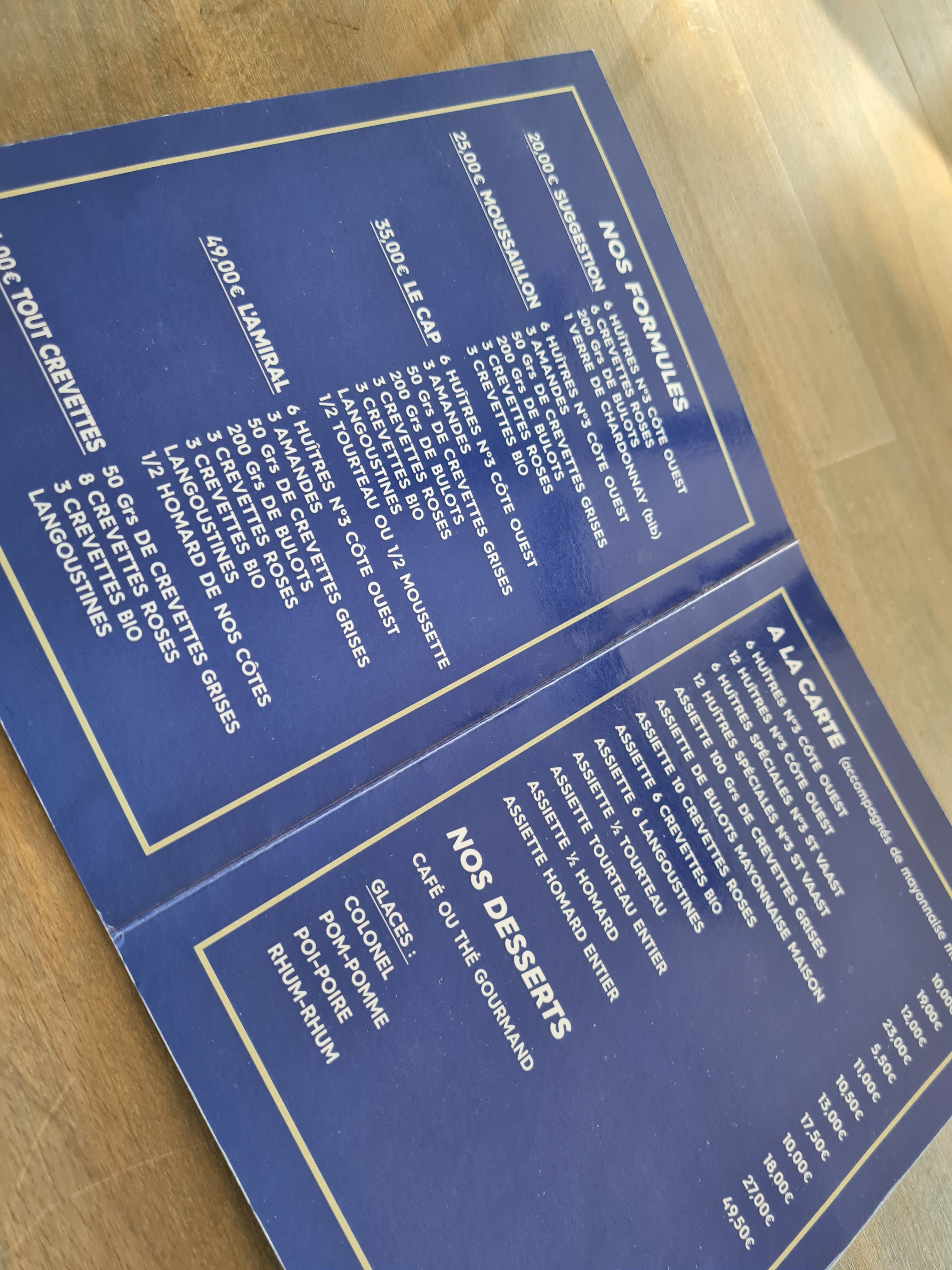 Aujourd'hui j'ai commandé un plat fruit de mère au homard et un au crabe à emporter. Payé 80 € avec une bouteille de vin blanc. C'était un repas copieux pour 2 personnes. Le rapport qualité/prix était top. Fortement recommandé si vous séjournez dans la région ou si vous êtes de passage.