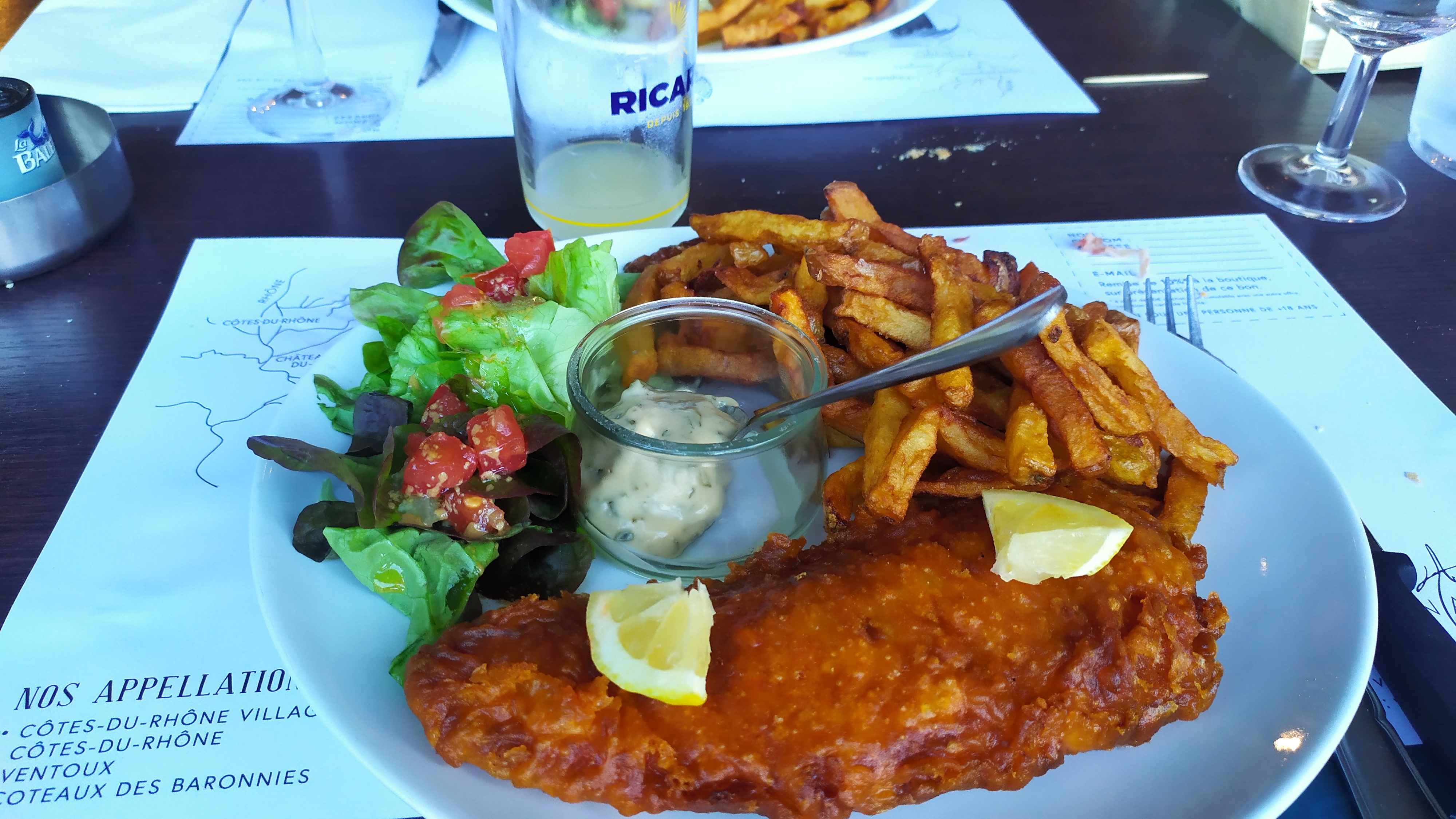 Ce midi Le tartare de st Jacques à la mangue était frais et bon, à 13€ Le fish & chips copieux et de qualité, avec des frites bien préparées et sa sauce estragon, à 14€. Le cadre est bucolique, le service correct.