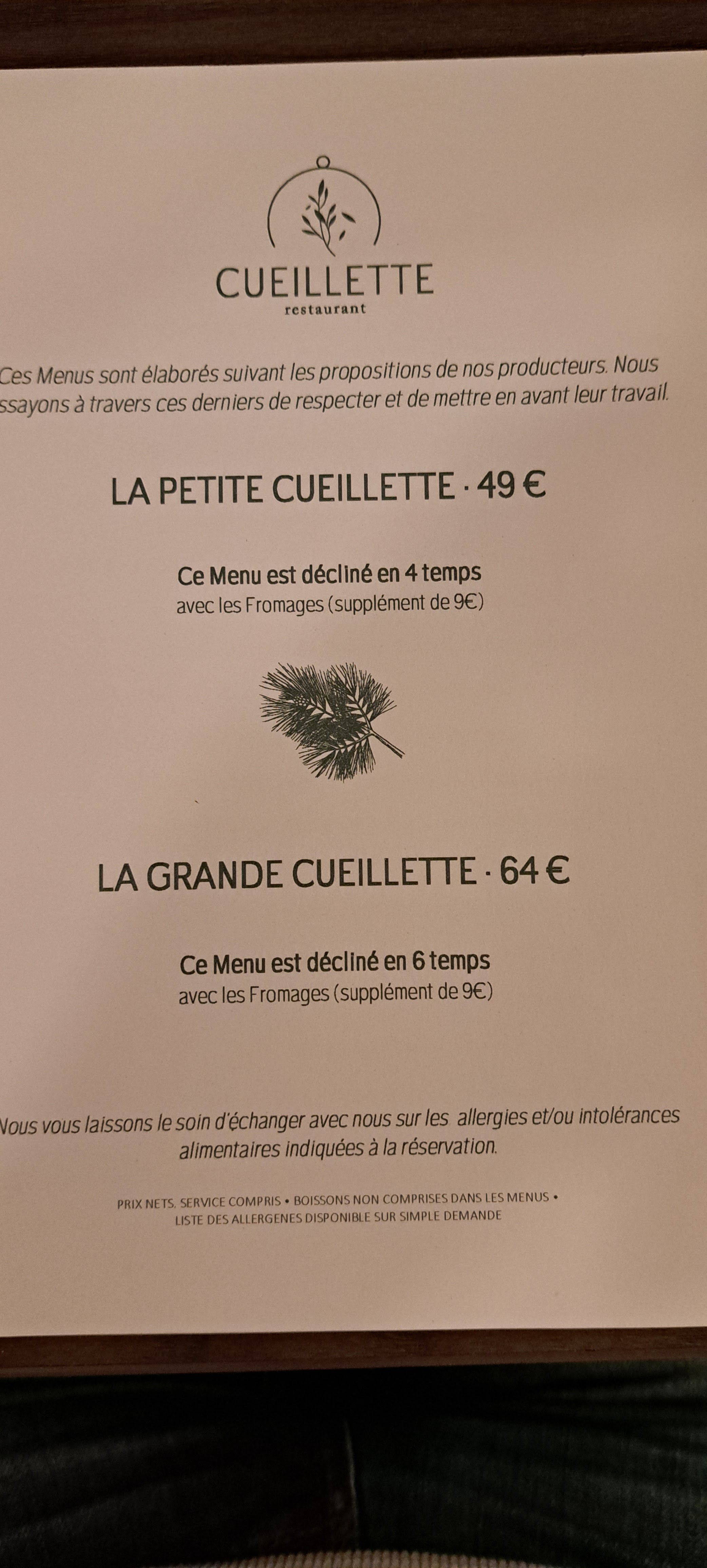 Délicieuse soirée chez Cueillette ! tout était parfait : l’accueil, les conseils et la cuisine. Nous nous sommes régalés. Nous reviendrons !