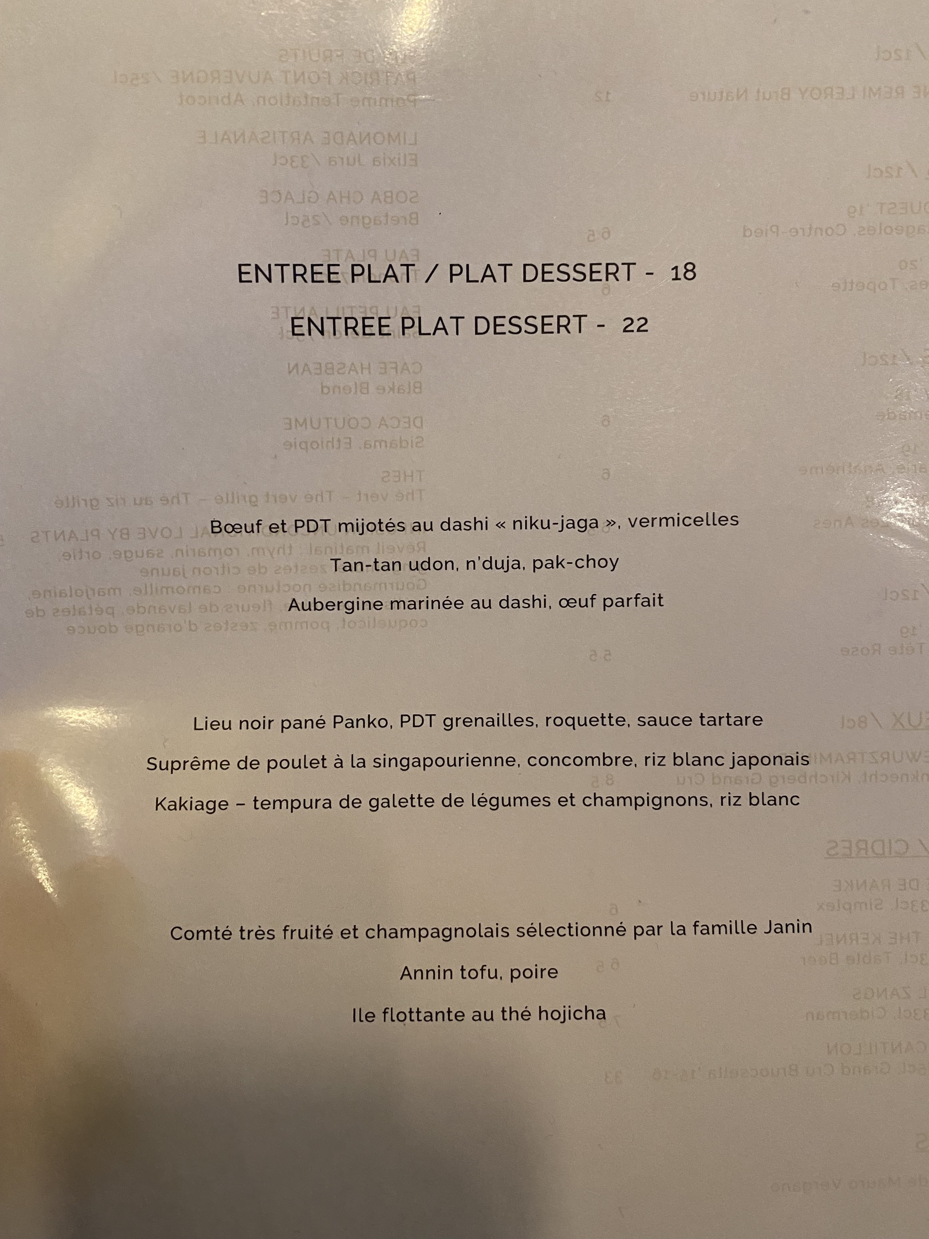 Comme le menu unique et à évolution rapide et PETIT —> fusion intéressante de l'Est et de l'Ouest. Cela vaut vraiment le détour et pour une bonne conversation car dans une rue pas très fréquentée et pas trop grande non plus.
