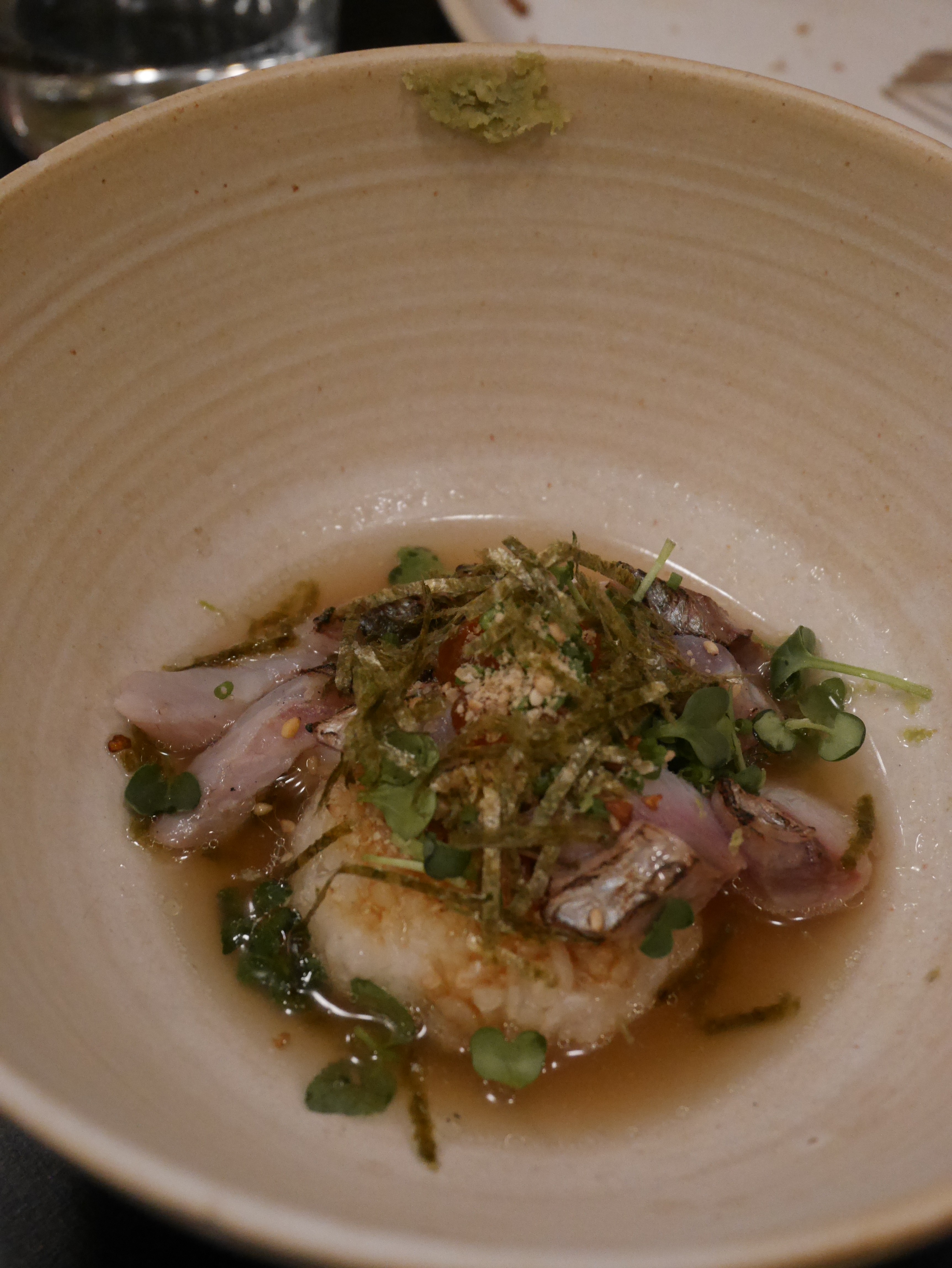 C'était un repas incroyable et ce n'est pas un restaurant à ne pas manquer. La fusion franco-japonaise fonctionne vraiment, contrairement à certains restaurants fusion où vous avez l'un ou l'autre, voire pas du tout. A noter également : le service est incroyablement en pointe : les serveurs savent à quel point — ou peu — s'impliquer dans votre repas. Mais avant tout, il faut essayer la nourriture dans sa qualité de croisement expérimental. Nous avons eu le copieux karage demi-pigeon (pigeon). Très savoureux et particulièrement bon si vous avez faim. Nous avons également ravalé nos scrupules et mangé la salade de pulpe, que nous n'aurions pas mangée en d'autres circonstances, mais à laquelle nous n'avons pas pu résister ici. Nos enfants ont adoré les raviolis shu mai, une bouchée de bonté savoureuse et salée. Nous avons apprécié la salade de concombre et adoré le ragoût de poisson dans un bouillon de légumes miso. Vraiment, ce repas n'aurait pas pu être amélioré.