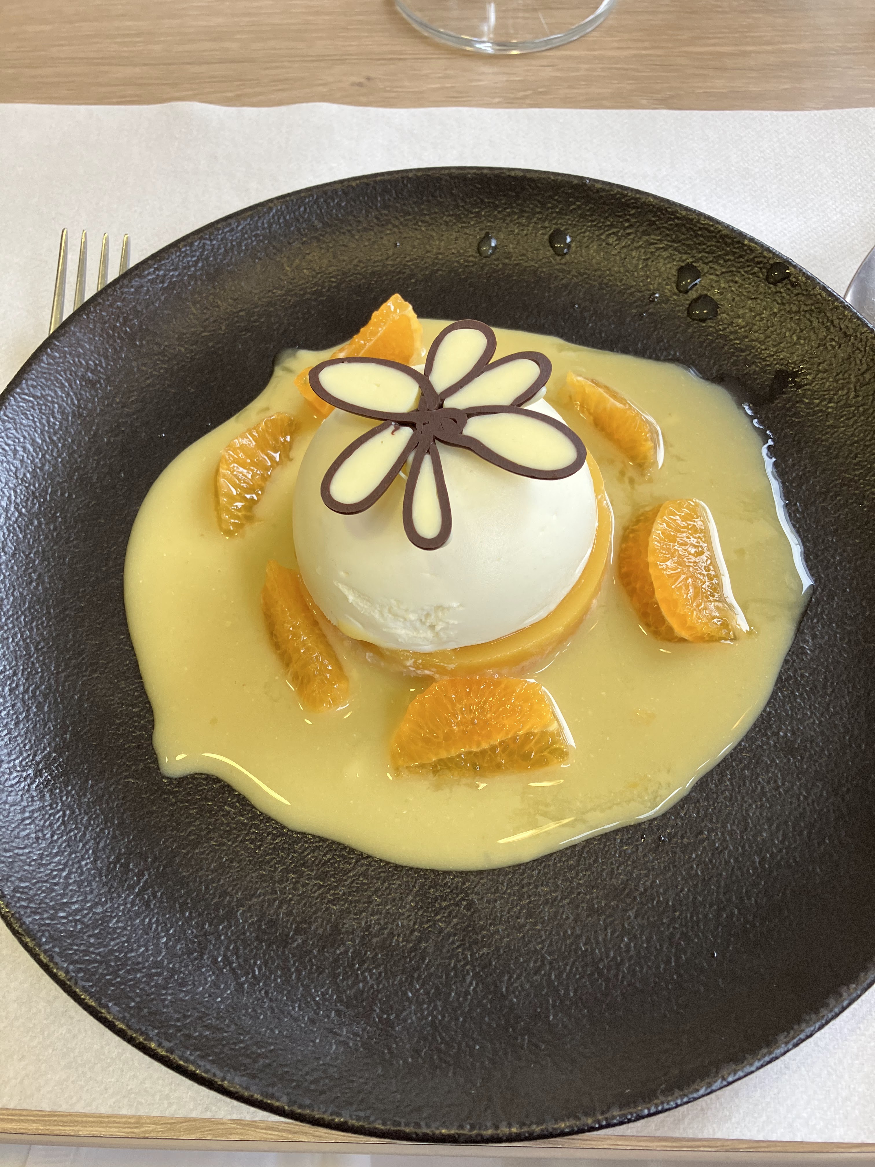 C'est un endroit où tout est comme il se doit. Dès l'entrée, vous êtes accueillis par de belles bouteilles de vin. Il y a un amuse-gueule, et tous les plats que j'ai mangés étaient excellents. Le dessert à l'orange et au Grand Marnier était excellent !