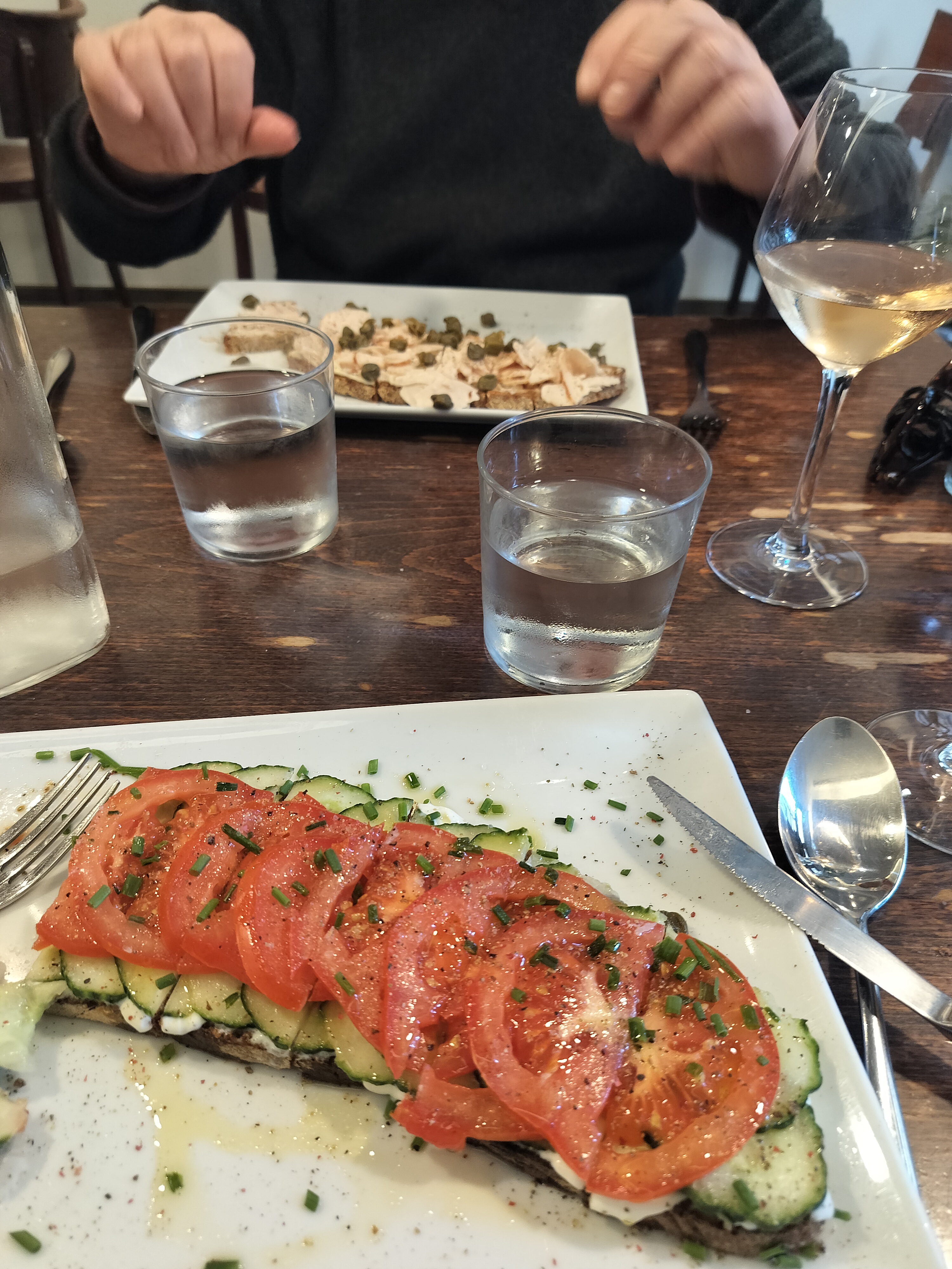 Juste des tartines (pain grillé ouvert) avec une soupe ou une salade au menu. La nourriture était excellente et le service était efficace et agréable. J'y retournerais certainement !