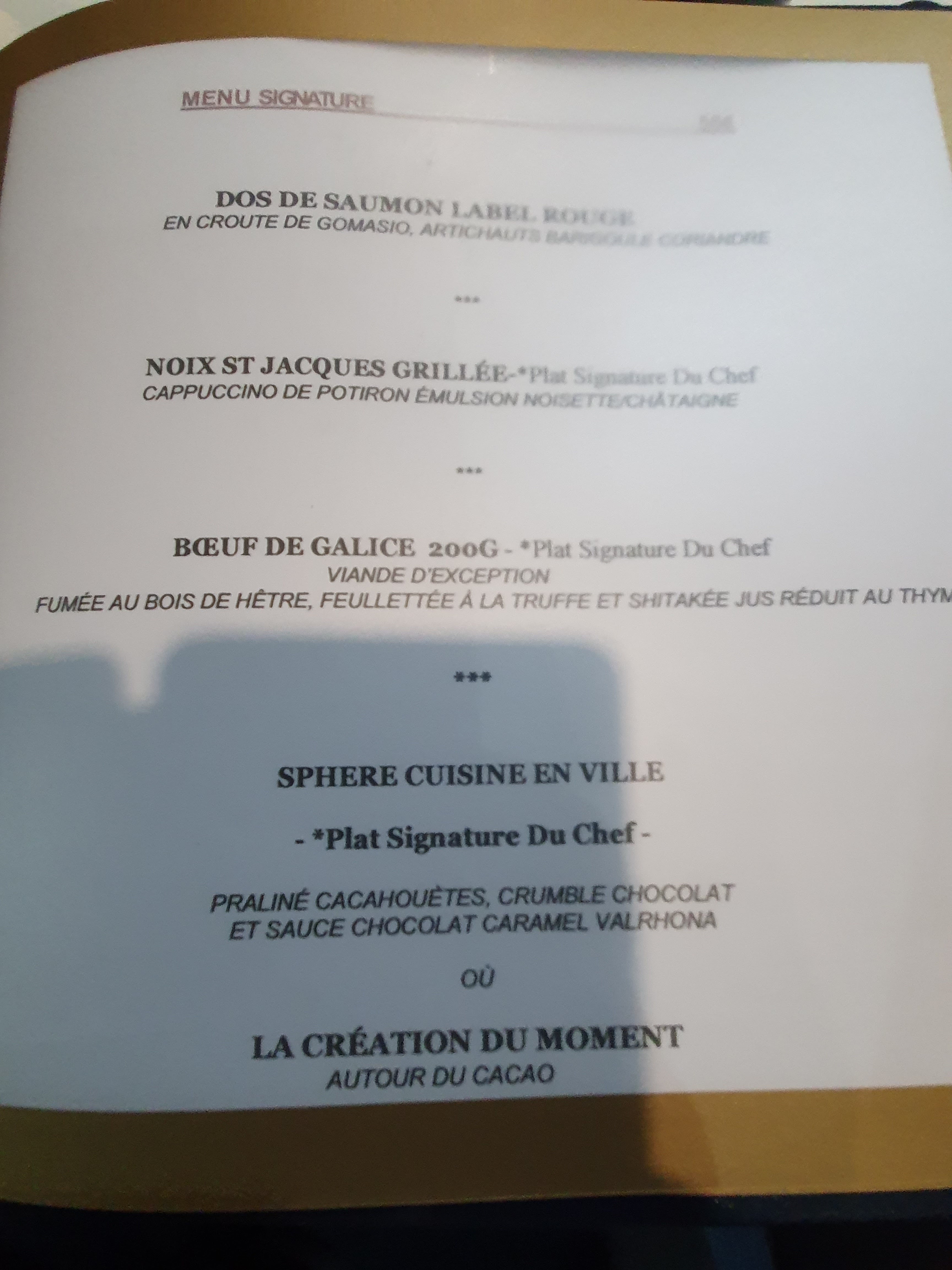 Pour commencer pas de chauffage dans la salle j'ai eu froid tout le long. Les plats : l'entrée était magnifique les noix de saint jacques fondantes avec beaucoup de goût, les plats chauds pas si chaud que sa ça, le saumon trop sec et pas assez de crème , la viande tiède mais la garniture était bonne et le dessert le trop léger en mousse j'avais l'impression de manger que du chocolat. Pour ma part j'ai été émerveillé au début avec l'entrée mais plus le service avançait plus j'étais déçu.