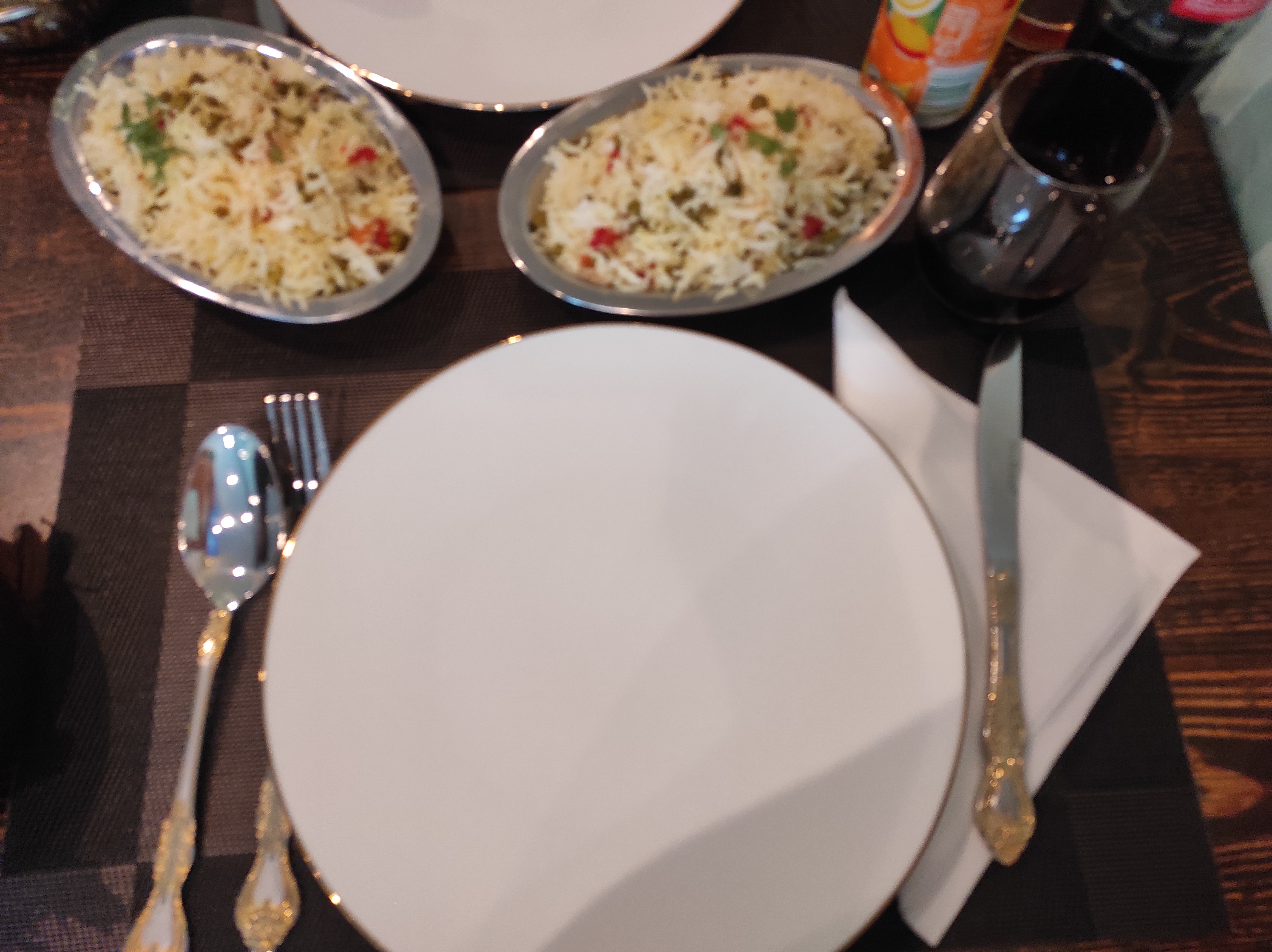 Le service était excellent. Personnel sympathique et serviable. Style indien où tous les plats arrivaient en même temps mais. Ce n'est pas un problème pour nous, étant habitués à vivre en Asie. Mon mari et moi avons des opinions mitigées sur les samosas et le Briyani mais le riz était délicieux, le chapati aussi. Je le recommande pour un repas décontracté et décontracté.