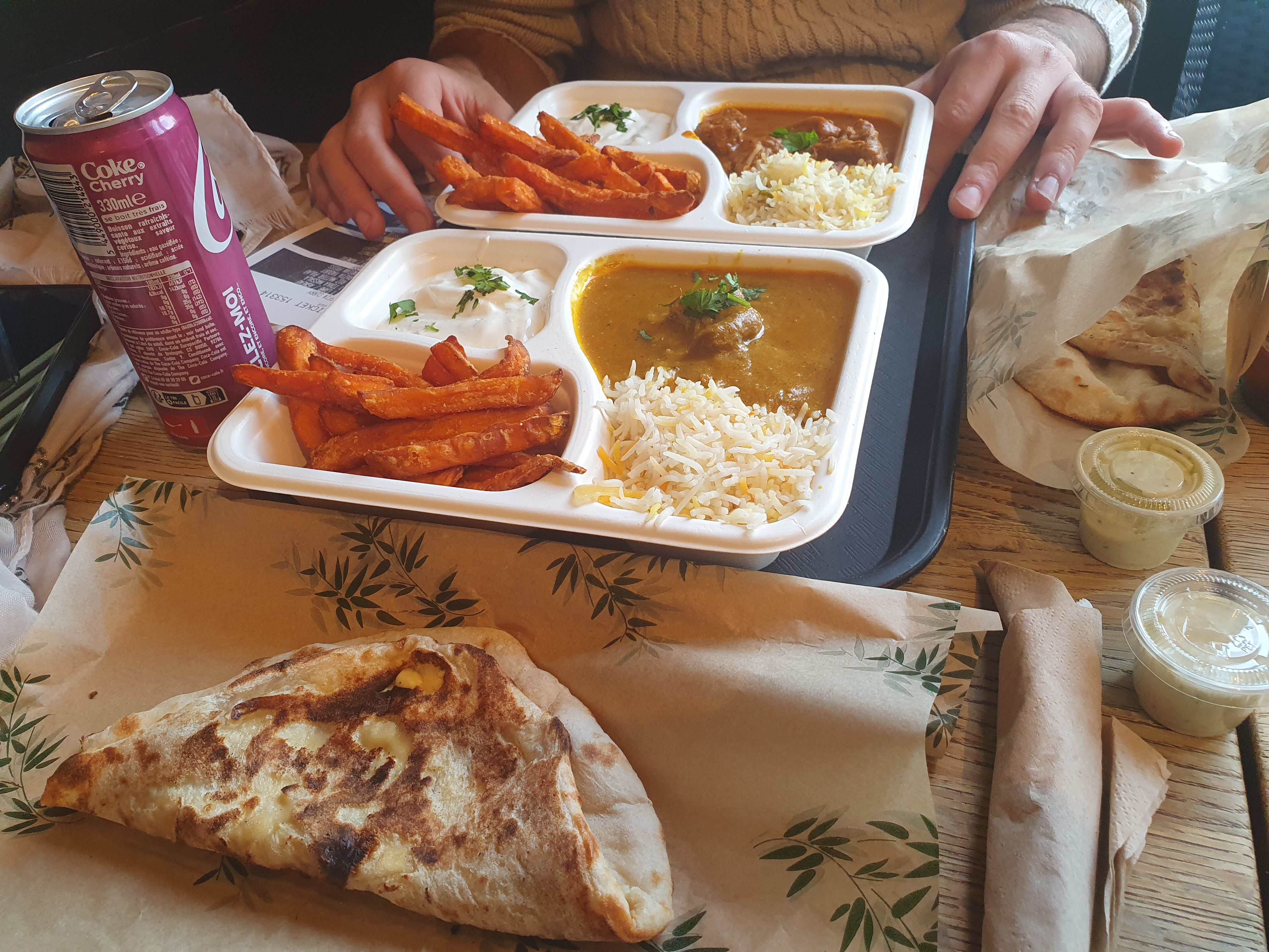 Nous avons placé une commande sur internet à venir récupérer sur place. Aucun item n'était identifié, ça a été difficile de s'y retrouver dans tous les naans commandés (surtout quand on en a commandé au fromage et que certaines personnes n'aiment pas ça...) et aucune boisson n'a été livrée correctement. En dehors de ça, le poulet frit est très bon, les frites de patates douces également. Ceci dit, les currys ne sont pas ouf, la cuisine a la main lourde sur la coriandre dans les salades et les naans nature n'ont pas vraiment de goût. Bon point pour la personne qui nous a donné notre commande, très accueillante et souriante, cependant !