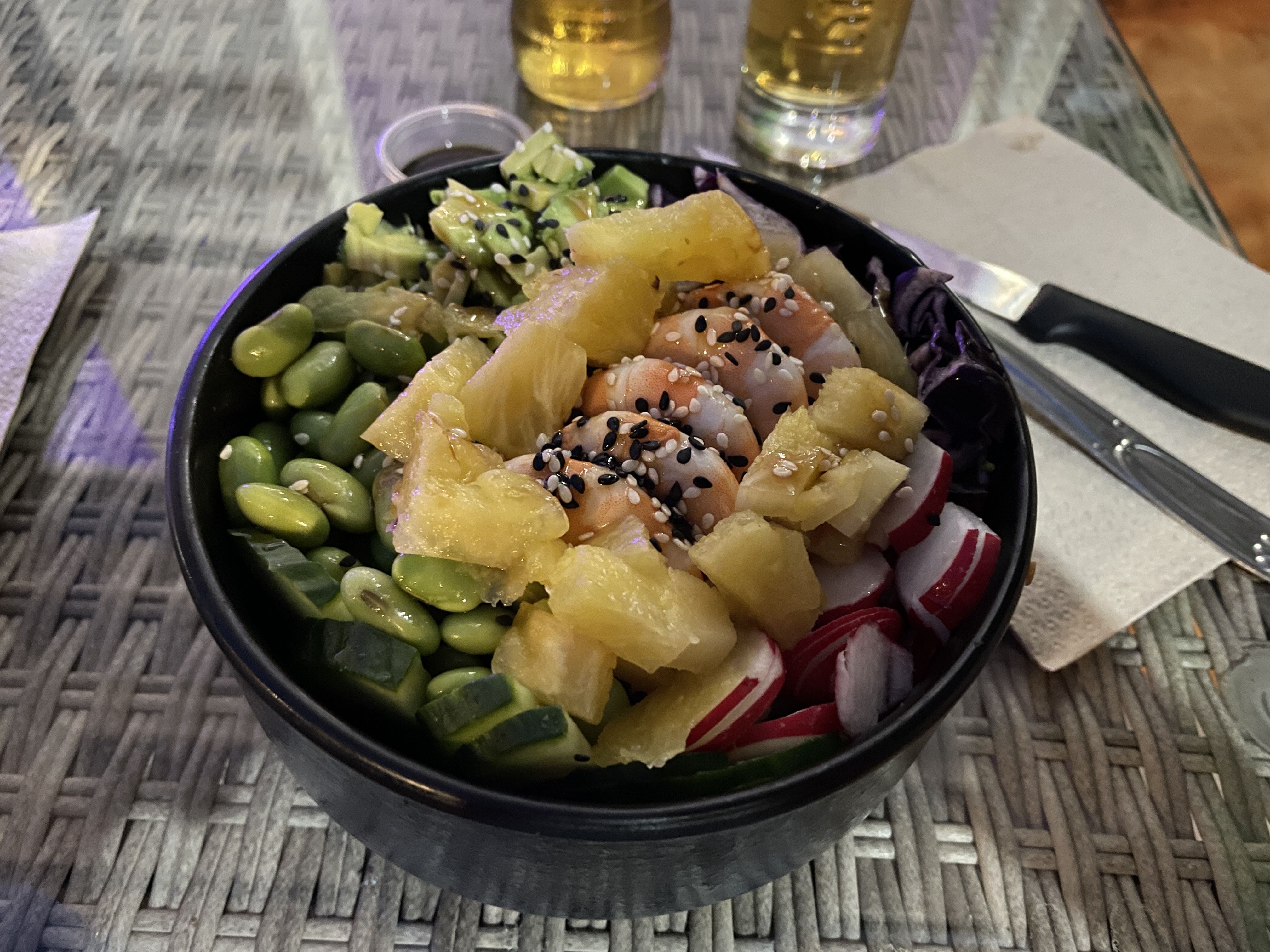 Très bonne soirée. Les poke bowl sont gourmandes, personnalisables et avec des produits frait. Avec un cocktail très bien dosé servi dans un ananas (nommé Pananas je crois). Les gérants sont aussi très sympa. Bref, super ! Adresse à tester et à retenir !