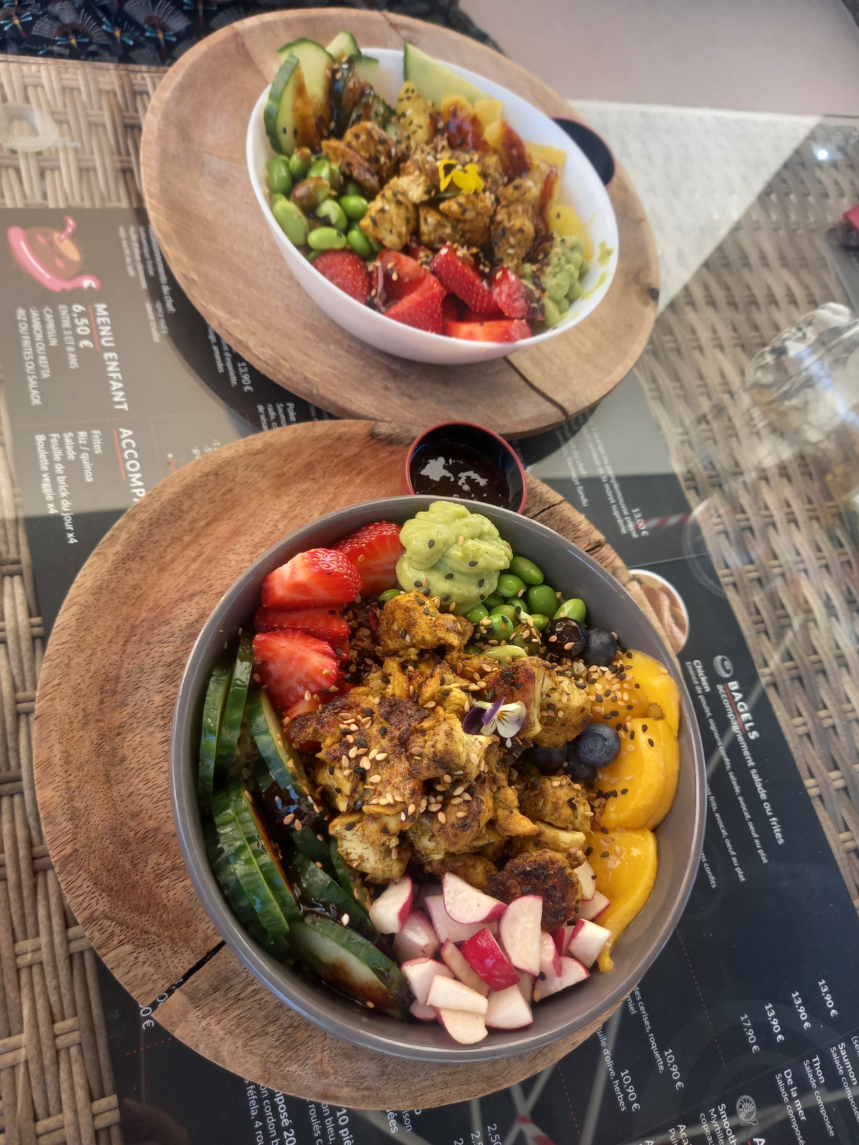 Produits bien frais, beaux assemblages et poke bowl copieux et réussis. Deux jeunes bien sympathiques. Sans vent , on aurait mangé sur la terrasse, ça aurait été parfait.