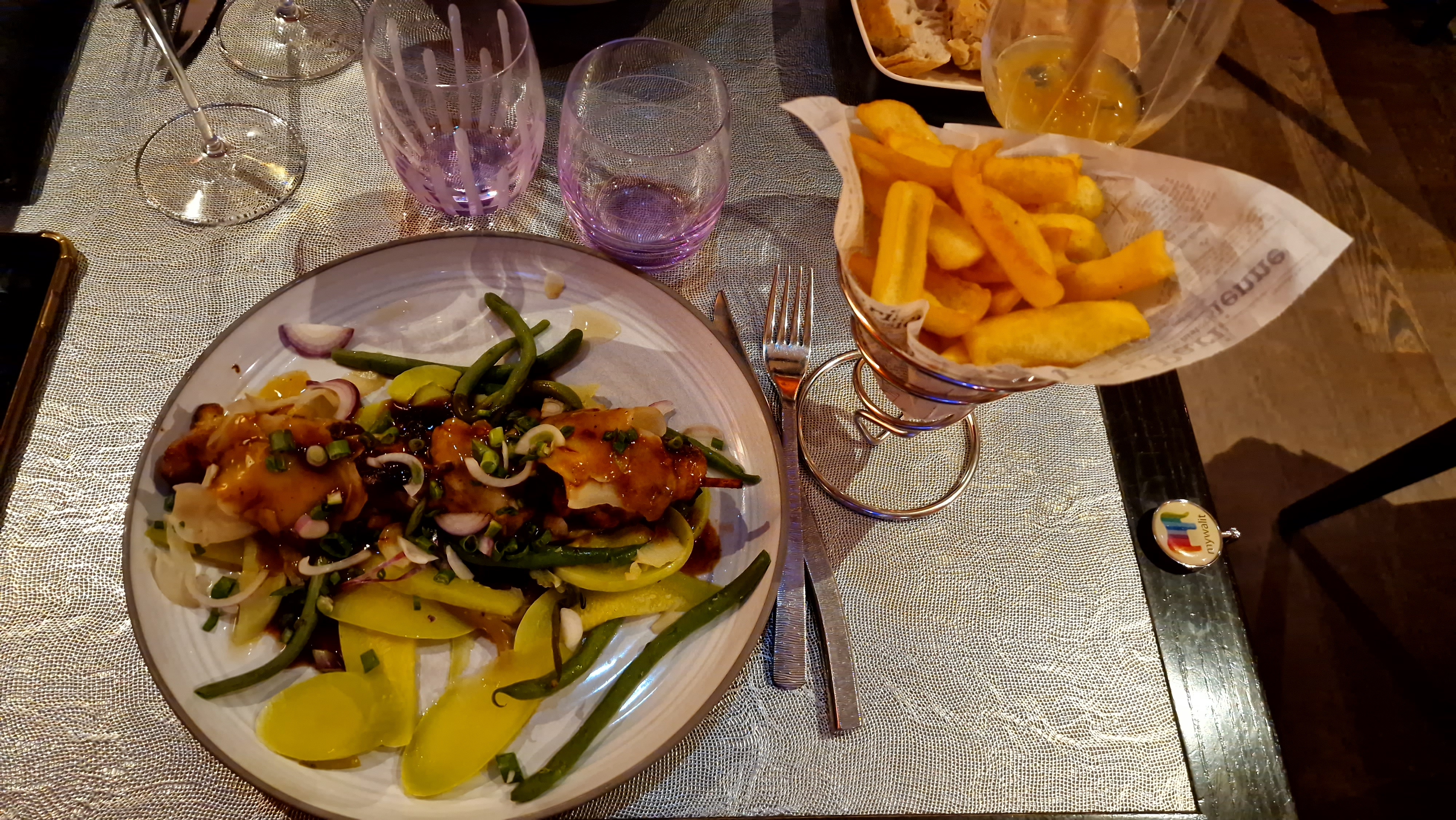 Nous avons réservé pour 9 personnes. La serveuse qui nous a accueilli était adorable. Les plats étaient bons dans l’ensemble, même si la première assiette de jambon est arrivée totalement froide. Nous n’avons pas eu les frites pour tout le monde et nous aurions dû payer 10 euros de supplément frites (une farce de leur part je suppose). Au moment de régler l’addition j’essaie d’expliquer ce qu’il s’est passé et la personne qui nous a encaissé m’a dit d’un air hautain et désagréable « ouais c’est bon je vous les enlève » sans essayer de comprendre là où était le problème. Sachant que les deux personnes qui avaient un burger n’en ont pas eu, c’était la moindre des choses… Nous avons aussi trouvé deux cheveux dans mon plat et dans le plat gambas/noix de st Jacques. Nous avons commandé une bouteille de vin qui est arrivée une fois que nous avions tous fini de manger, nous avons failli la refuser. Bon point, le jambon était excellent et à volonté. Mais en définitive, beaucoup trop onéreux pour la qualité du service et des plats, même si dans l’ensemble c’était correct, ça ne valait pas une addition à presque 500 euros. J’émets cet avis ici car la personne a qui je voulais faire remonter ces informations à la fin du repas n’avait visiblement pas envie de les entendre. Vos clients ne sont pas tous des touristes du marché de noël, nous résidons dans la région et c’est toujours décevant de voir des restaurants proposer des plats à 30 euros sans pouvoir avoir la qualité qui suit dans l’assiette. « Attrape touriste », comme on dit…