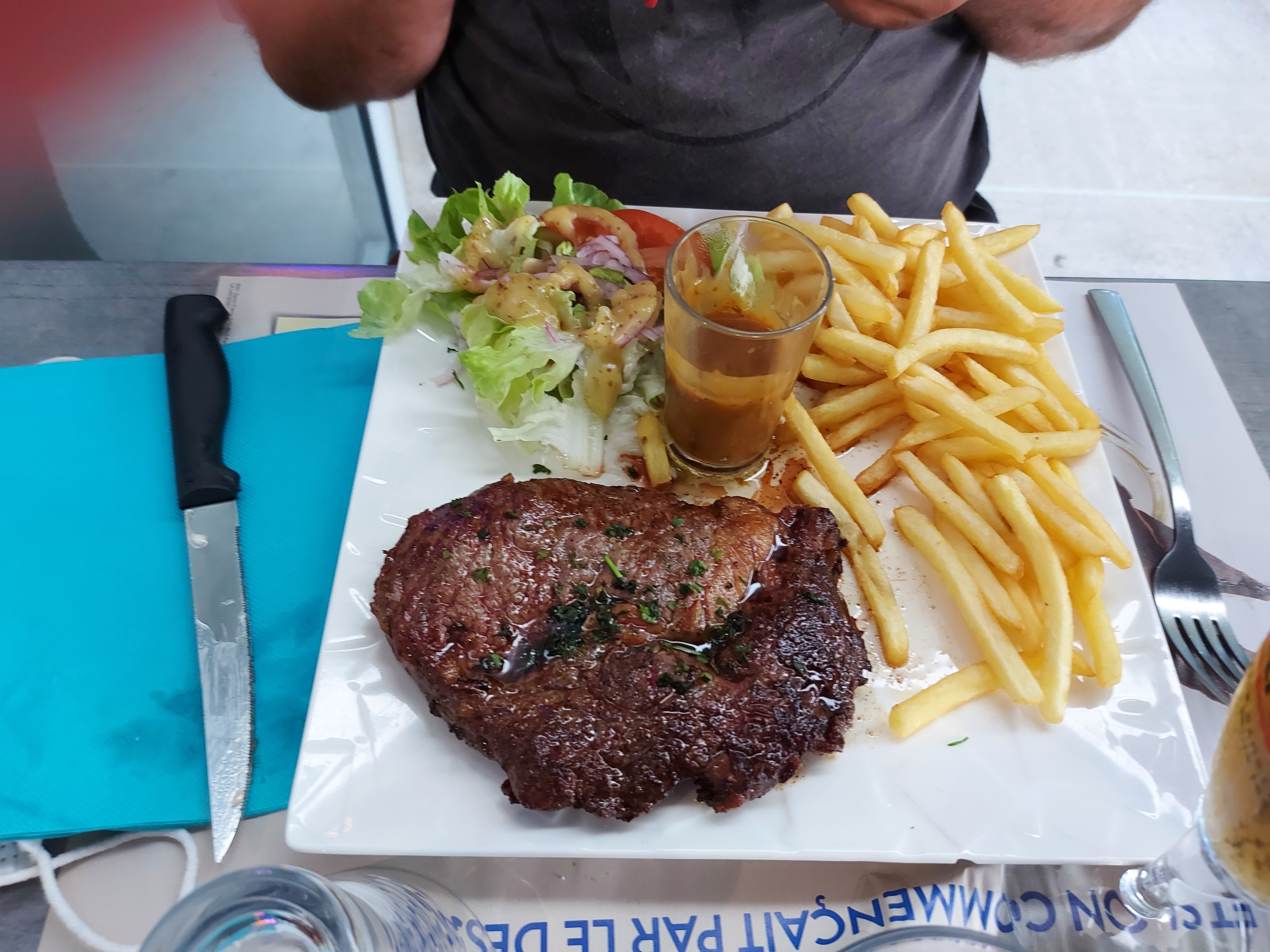 Tout était parfait ! Table ou nous étions 10 , des ribs, andouillette moutarde, camembert rôti, entrecôte, pizza ou tiramisu speculos tout était bon !! Les patrons très sympathique et la vue sur un parc sympa ! Restaurant dans le centre d'Andernos, je recommande !!