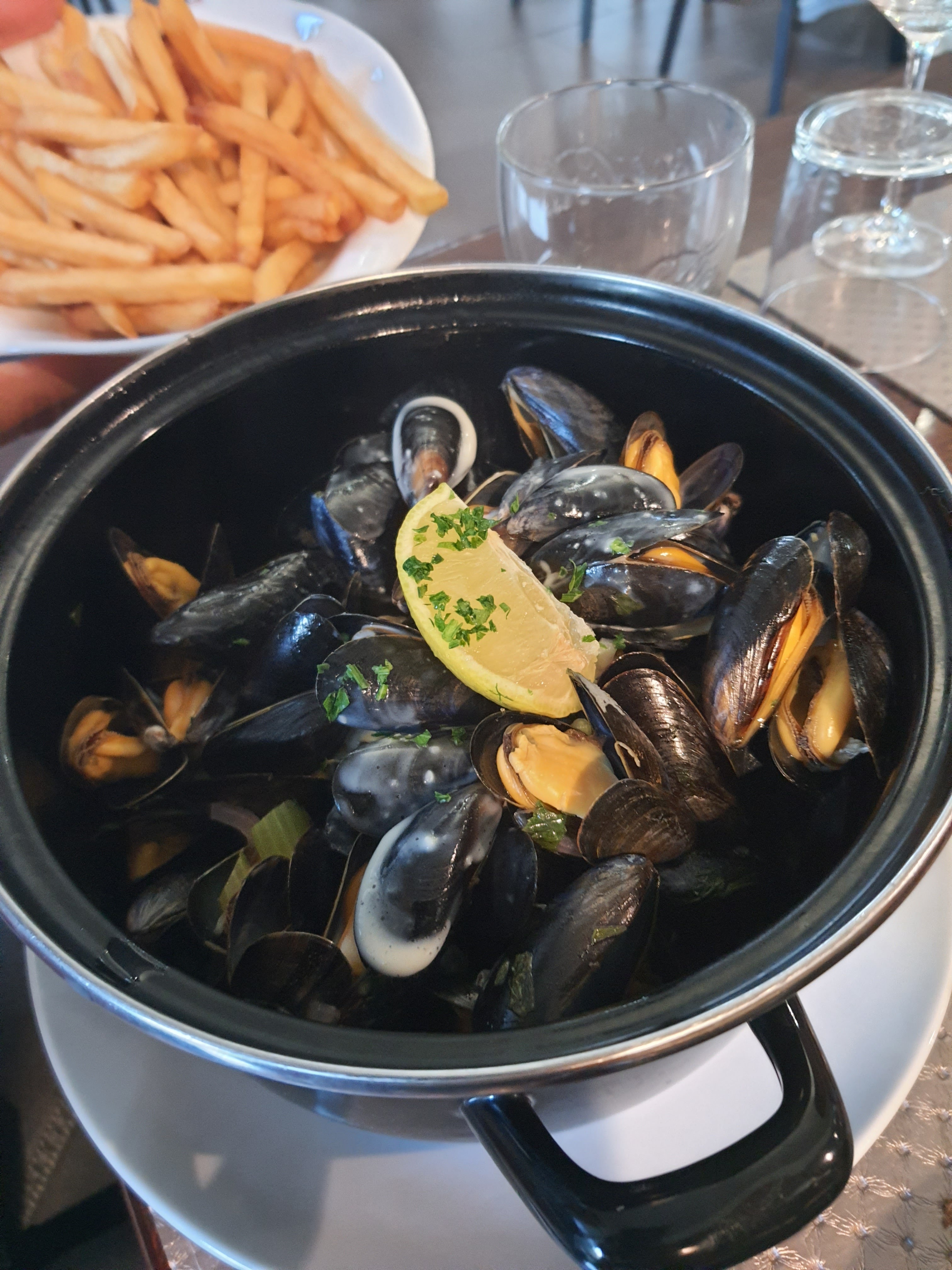 Un accueil sympathique pour ce restaurant qui offre une grande surface d'accueil en terrasse. Malgré le monde on est servi assez vite. Le souci c'est qu'on vous sert des moules frites tellement minuscules qu'on n'en sent presque pas le goût. En revanche la sauce crème et le plat étaient excellents. Je pense que lorsque le restaurant reçoit un arrivage de petites moules, ils devraient avertir le client au moment de la commande...