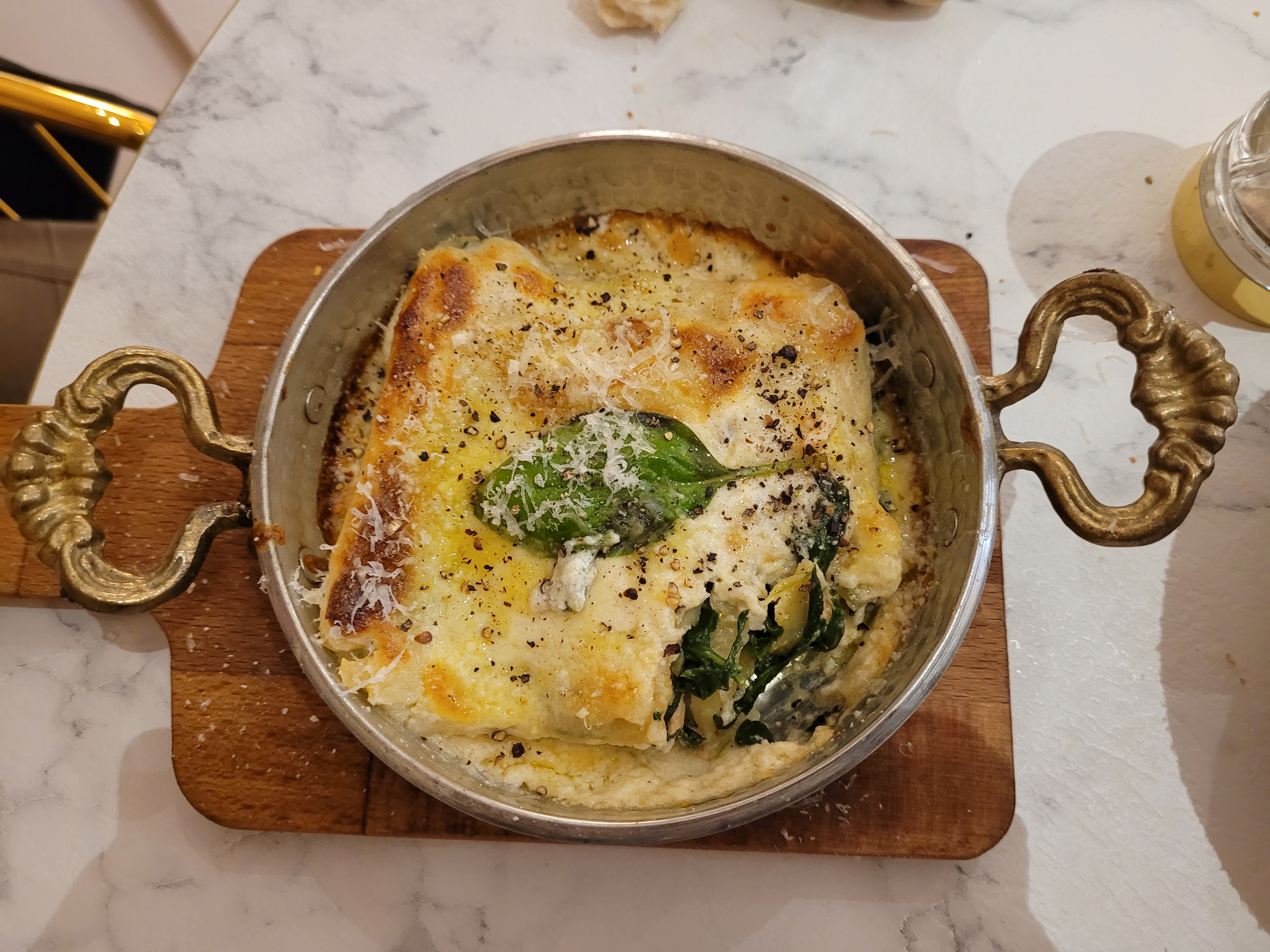 Très bon accueil et service; recherche dans la déco. La burrata à la truffe et feuille d'or est top, mais plutôt à partager à deux en entrée. La qualité cuisine est à l'avenant de mes photos. Excellent rapport qualité prix. Lasagnes saumon un peu compactes et pour salade fruits, mieux de privilégier les fruits de saison. Mais allez y c'est une bonne table !