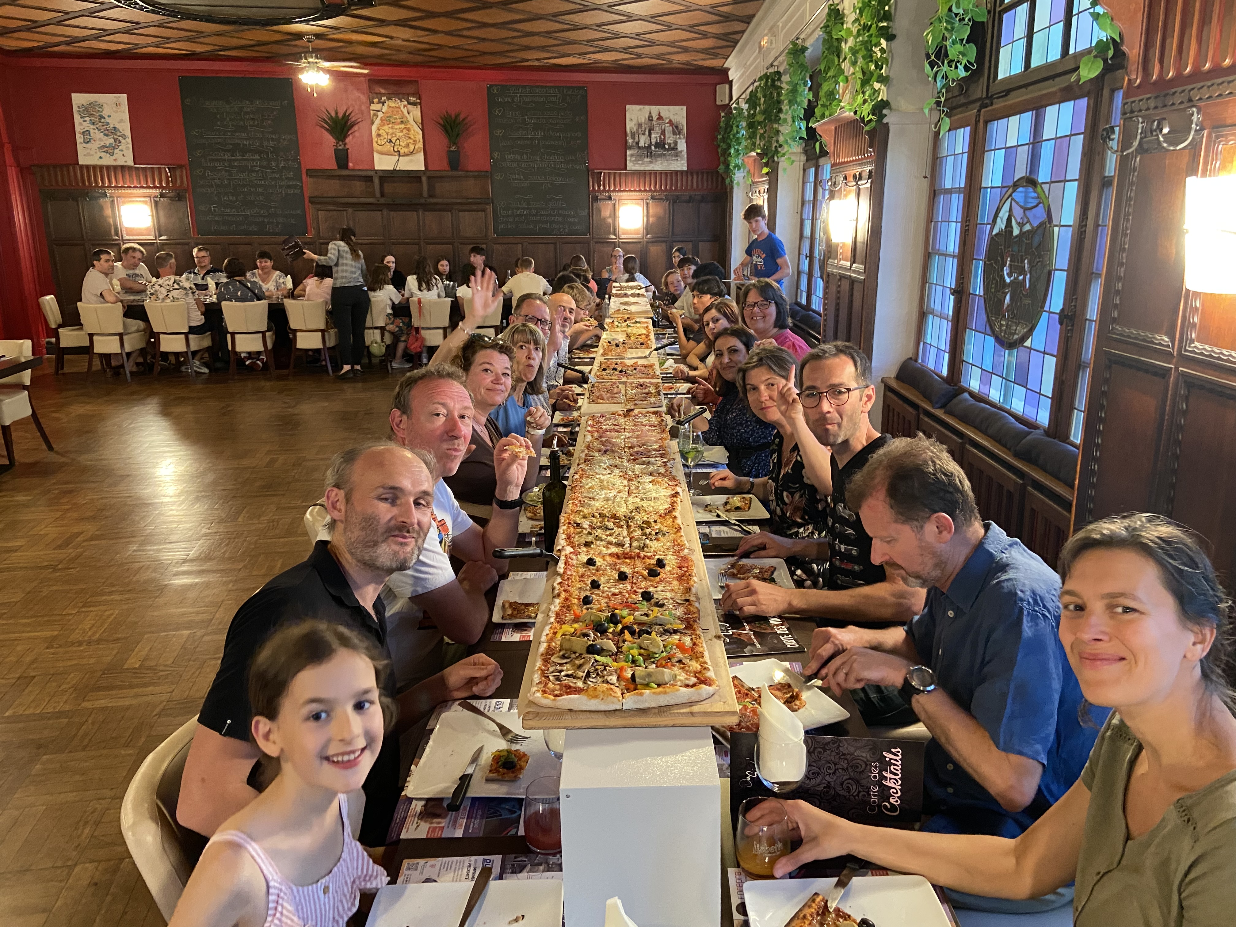 Un repas convivial partagé à l'occasion d'un trio d'anniversaire, une salle annexe spacieuse et lumineuse qui a plu à toute la table 6 mètres de pizza déguster avec grand plaisir, 6metres collés pour le plaisir des 20 personnes de notre table. Un repas convivial, un service rapide et efficace, soigné par des sourires et de la bonne humeur grâce à l'équipe Un restaurant conseillé en famille et entre amis pour passer d'excellent moment ! A refaire !