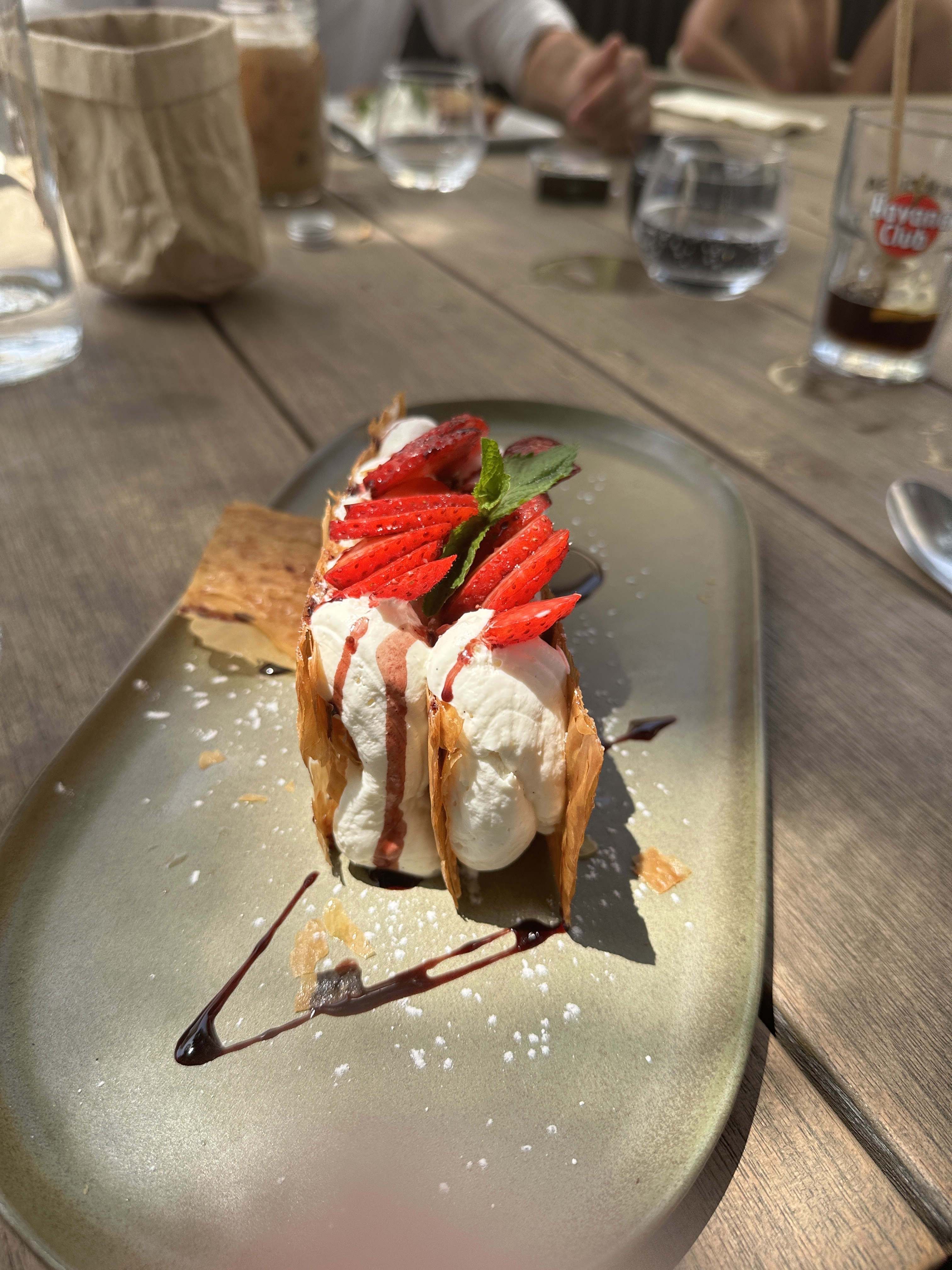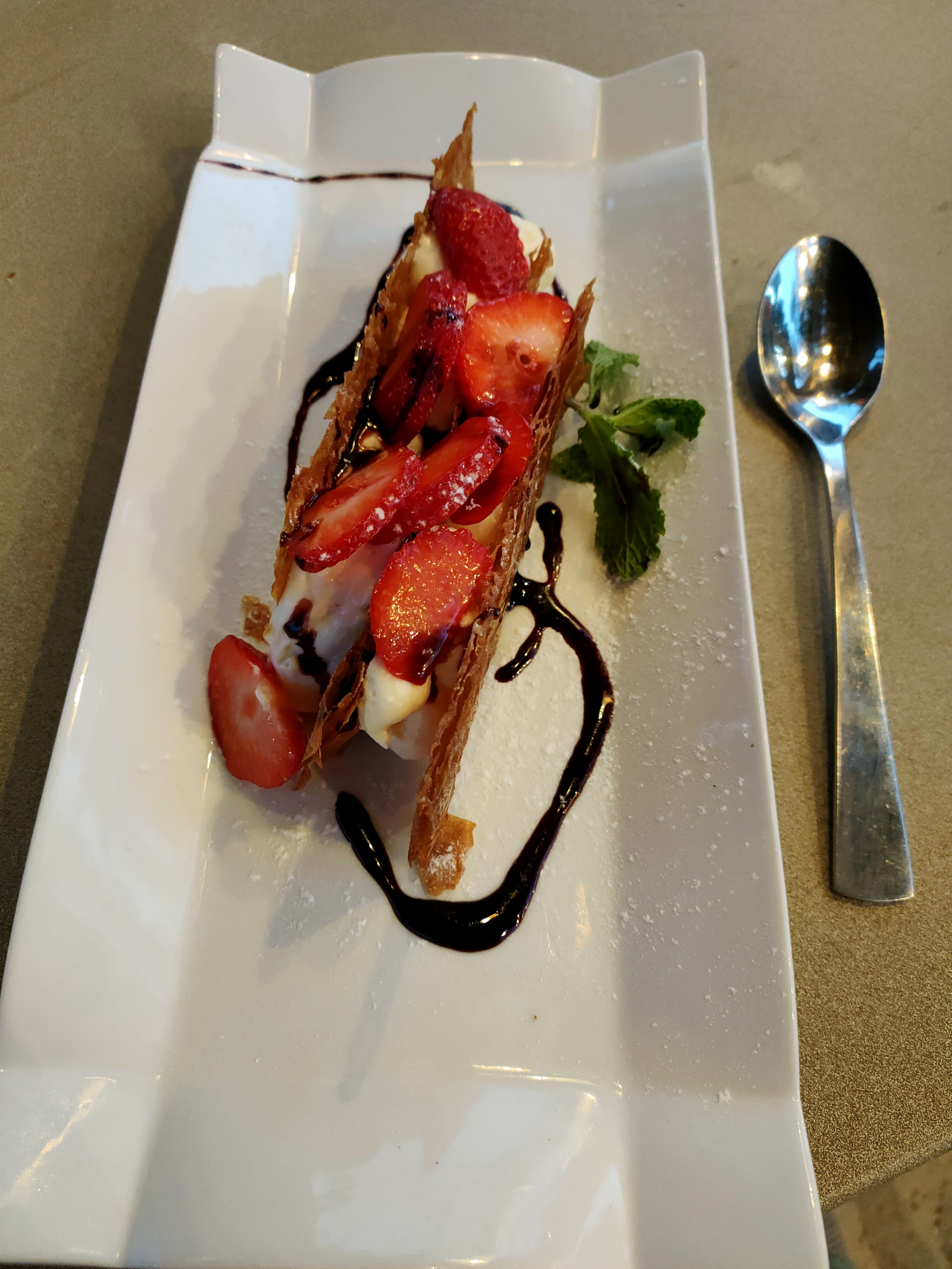 Nous avons apprécié le plat du jour, risotto aux moules. Nous avons retrouvé avec plaisir le millefeuille du moment aux fraises. Repas dans un endroit exceptionnel.