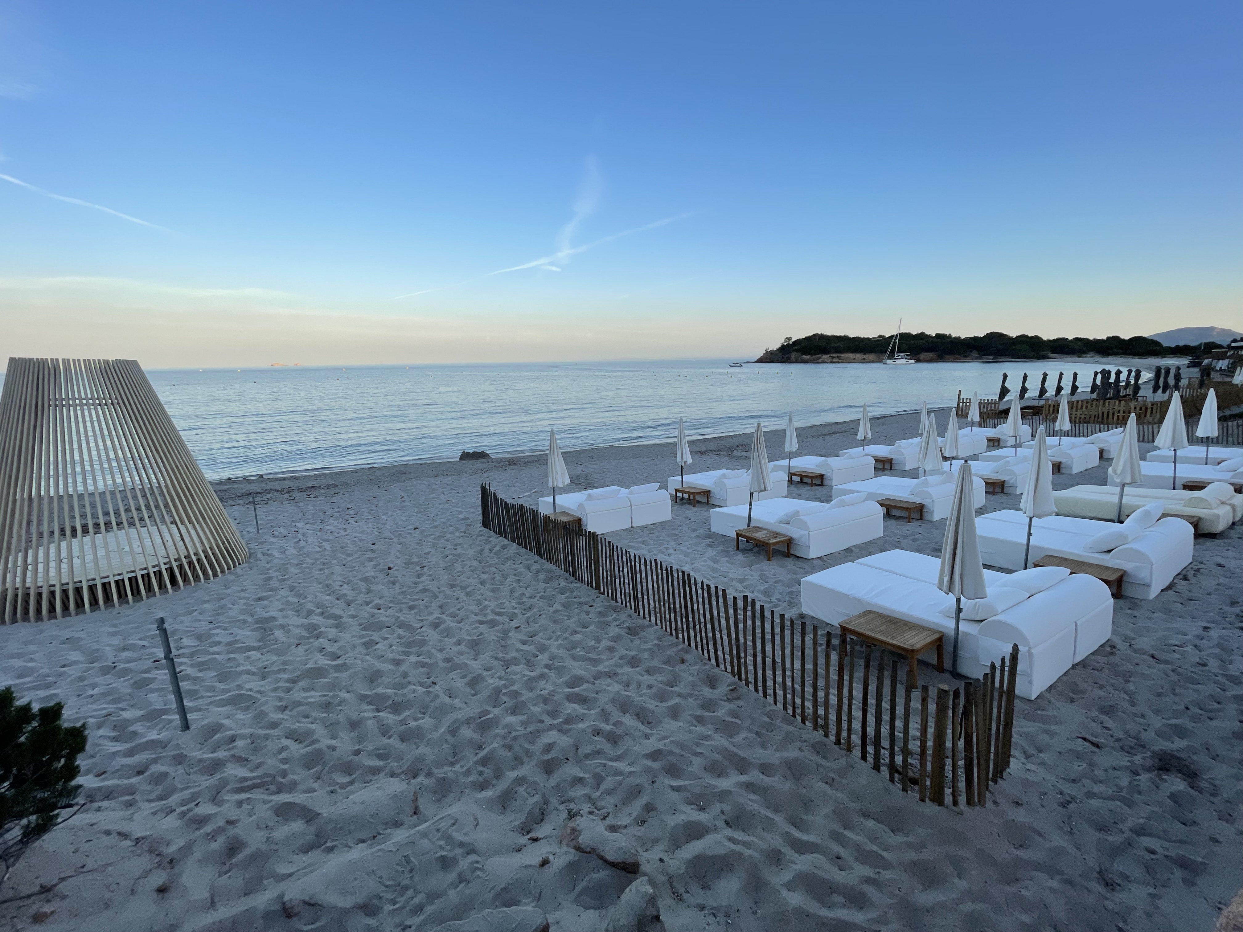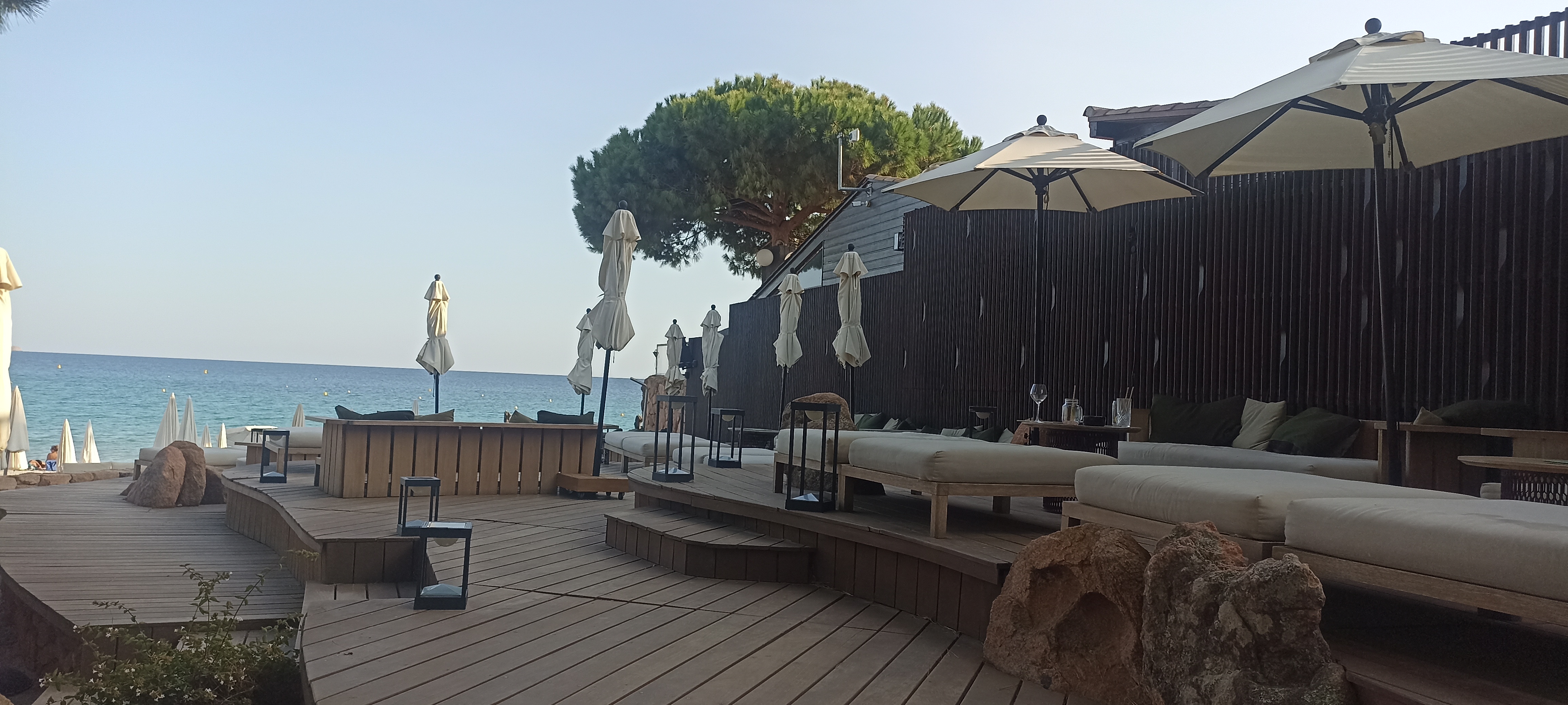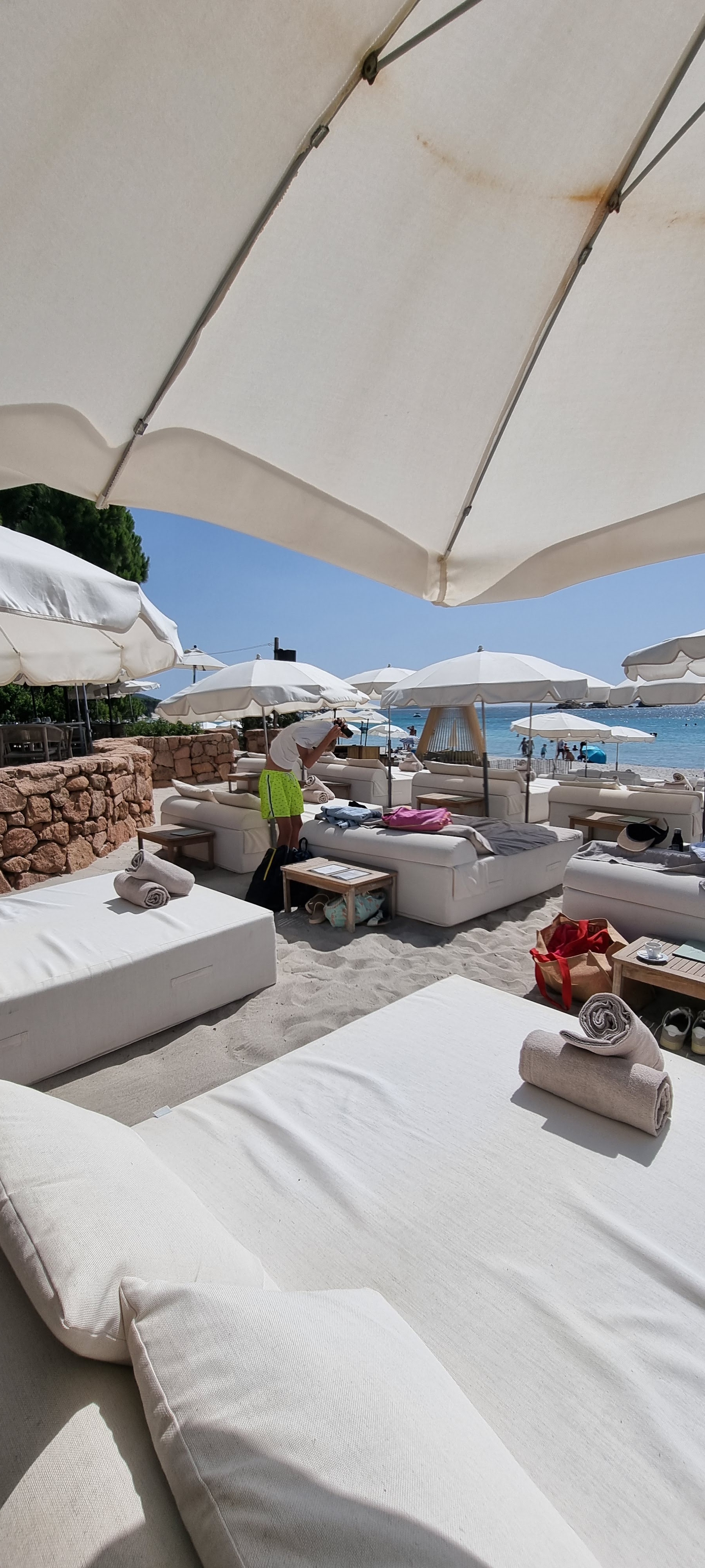 L'endroit pourrait être génial - mais ce n'est malheureusement pas le cas : mi-septembre - basse saison - on nous a dit que nous ne pourrions avoir des lits que si nous déjeunions tous - et même dans ce cas, le prix par lit était 50 % plus élevé que celui des meilleurs clubs de plage de St. Tropez. Nous voulions quand même déjeuner et cela ne nous dérangeait pas de dépenser, mais la qualité du poisson était très mauvaise - à 117 EUR par poisson sans accompagnements, vous vous attendez au moins à un poisson frais. Comme c'était une journée de tempête, nous avions la majeure partie de la place pour nous, mais nous avons obtenu les dernières rangées pour les lits et le déjeuner… et nous nous sommes fait reprocher une fois que nous avons déplacé un oreiller pour que notre bébé dorme et que nous voulions garder la purée de pommes de terre pendant qu'elle mange sur la plage. Tous les membres du personnel n'étaient pas impolis, mais dans l'ensemble, nous avons eu l'impression que cet endroit avait un peu trop d'attitude pour ce que c'est.