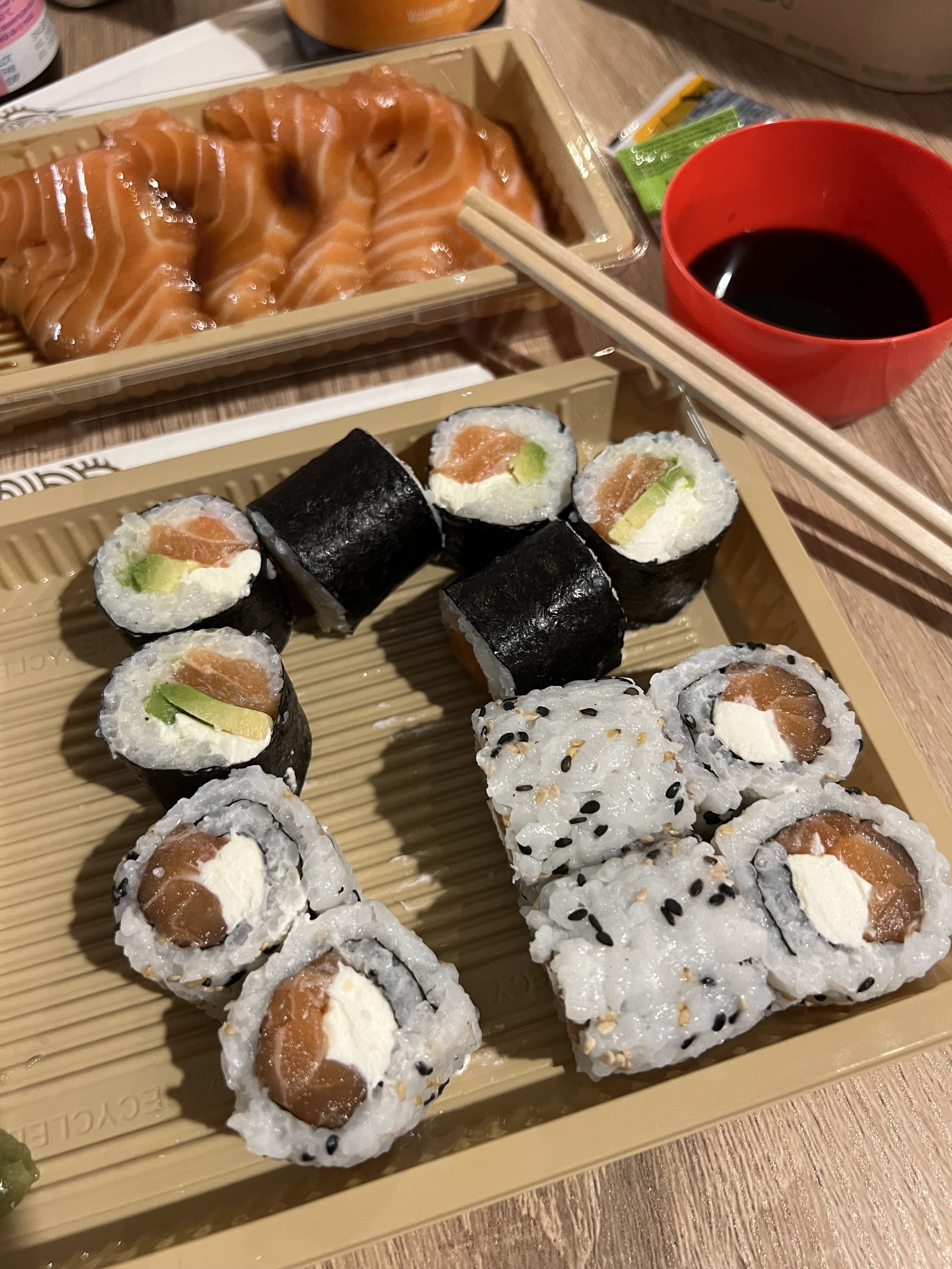 Première commande, sûrement la dernière. J'ai pris en dépannage par envie de saumon et par manque d'ingrédient chez moi. Déjà les prix sont très cher, heureusement les quantités sont au rendez-vous. Le saumon est découpé grossièrement, les morceau peu esthétique que l'on enlève normalement sont laissés. Une arête dans mon saumon tellement aucune attention n'est portée à la découpe. Une sauce déjà appliquée sur mon chirachi, beaucoup trop de sauce. Le gout du saumon était OK. Le riz était sec, très sec, je ne pense pas qu'il soit vinaigré, le fait qu'il baigne dans la sauce compense. L'avocat avait une partie abîmée, qui a été bien évidement laissé. Je pense que je prépare mieux et avec de meilleurs ingrédients chez moi.