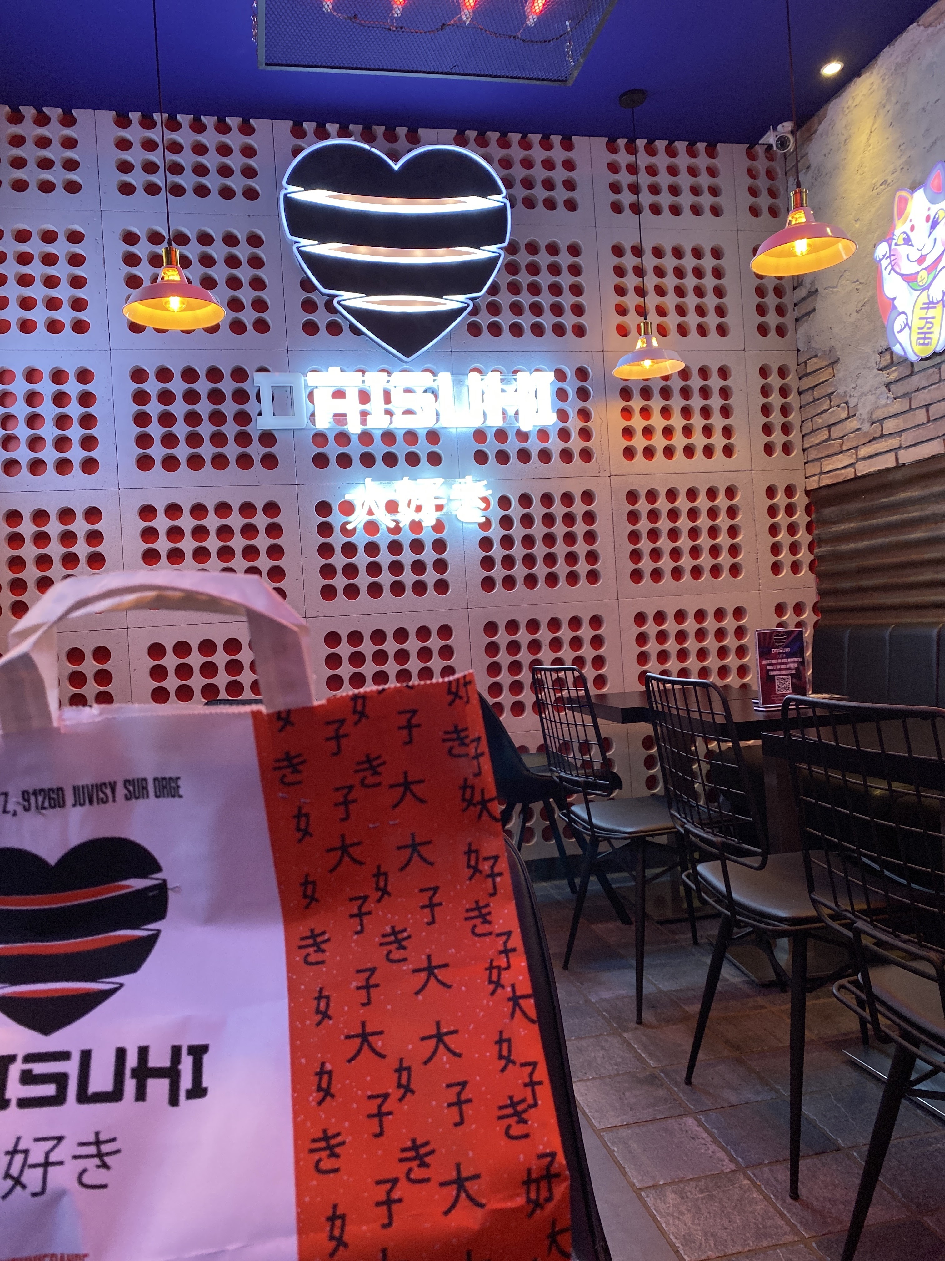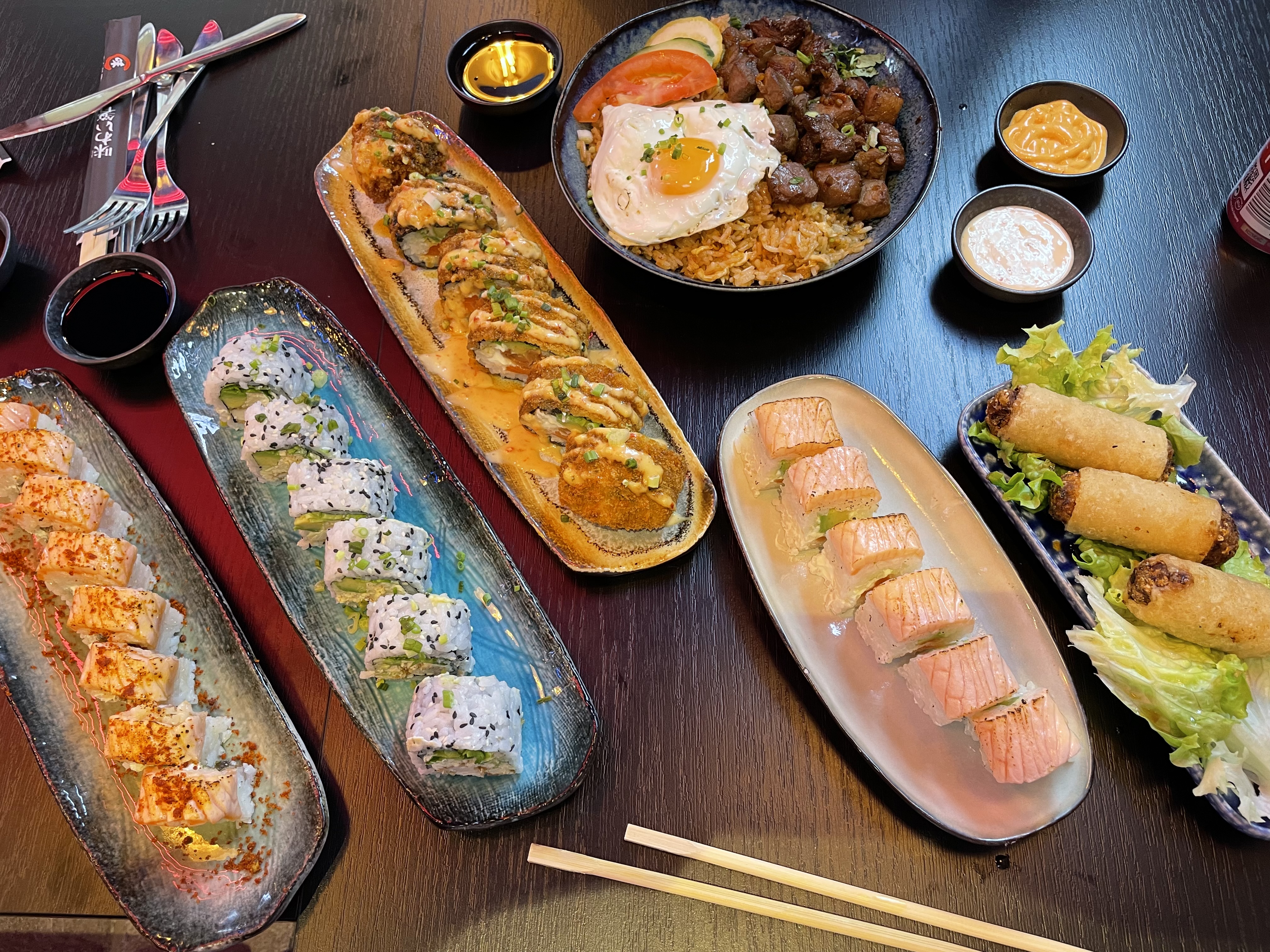 déco réussi et très jolie. de plus la nourriture est très bonne et les sushis signature sont tellement grand que ça rentre pas dans la bouche. leurs sauce maison est réussi et donne un goût prononcé au sushis. je recommande ce restaurant