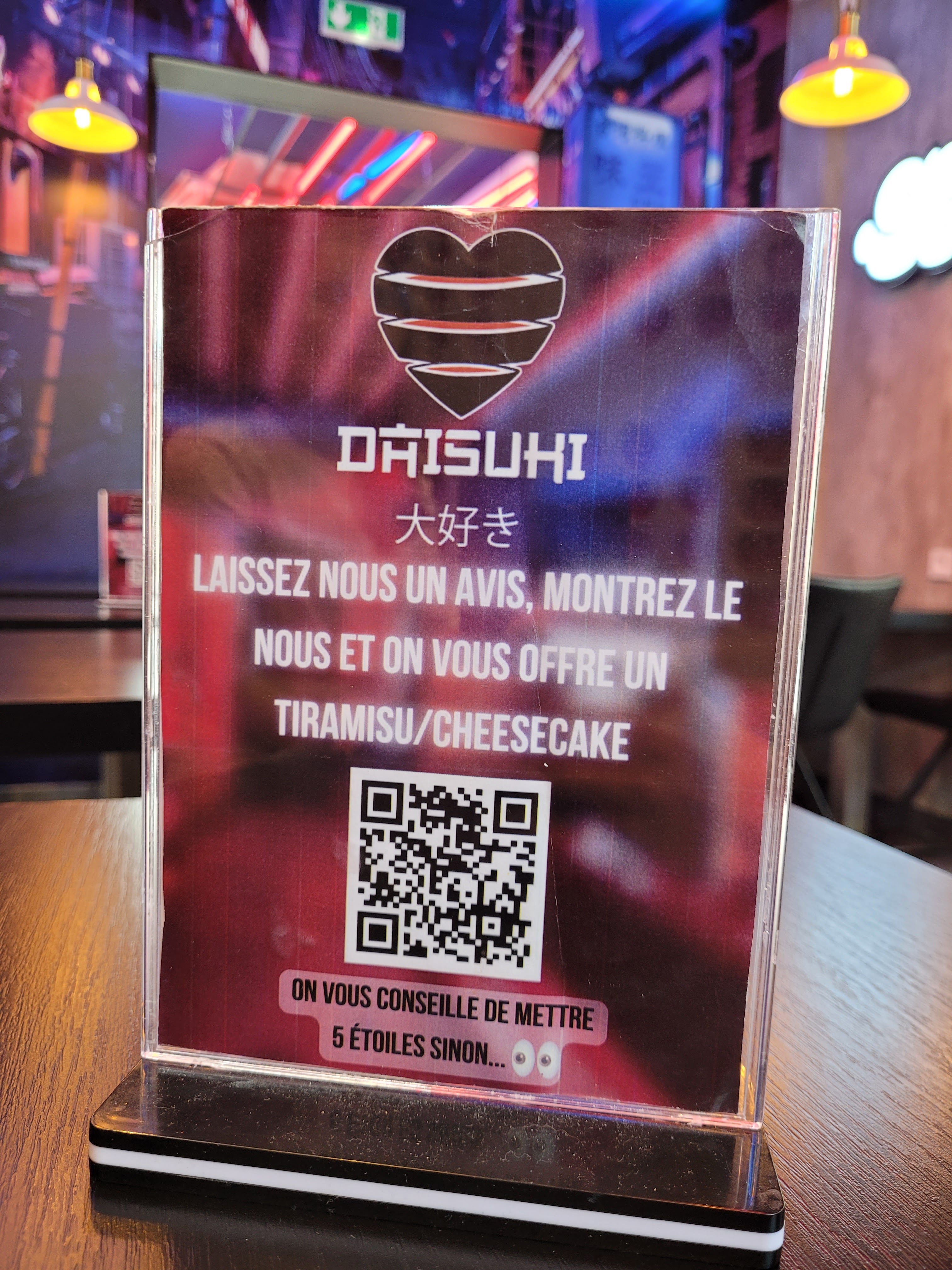 Je vais très souvent à Daisuki et j'y ai ramené tous mes amis. Jamais déçu par la qualité et la quantité des plats proposés !