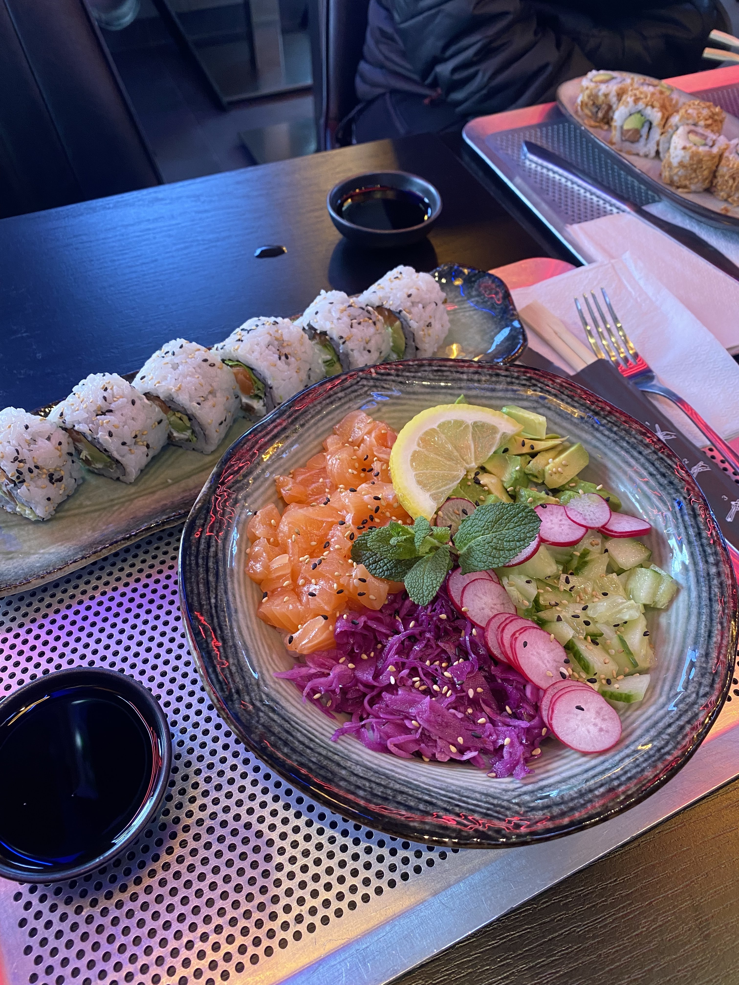 ÉDIT : la deuxième fois s’est mal passé. Oubli + temps d’attente supérieur à 30 minutes, d’autres clients attendaient et sont arrivés après nous, ils ont été servis en premier. Bref très déçu. On y a été une fois, nous voilà pour la deuxième. On avait beaucoup aimé, la déco, la devanture, la nourriture, bref c’est super Si vous aimez les sushis, c’est une bonne adresse 👀