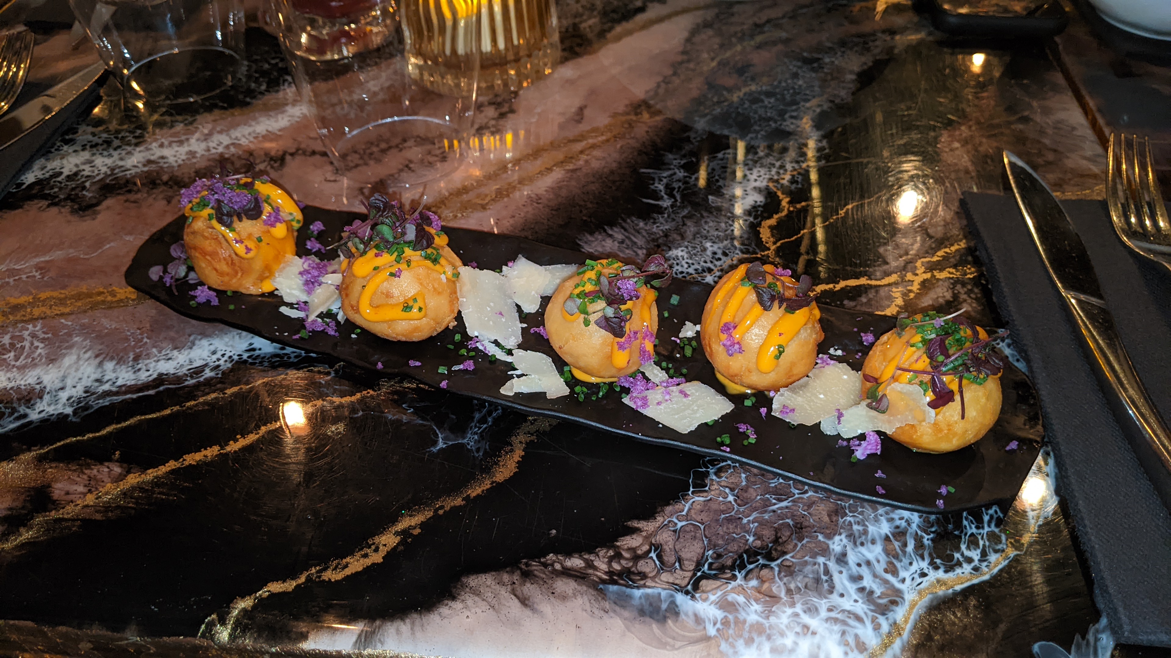 Une décoration originale qui donne une très belle 1ere impression mais ça en restera là. Tout d abord on a eu froid du début à la fin et le chauffage était à fond. Playlist sympathique mais trop forte au milieu de ce restaurant quasi vide un dimanche soir… luminosité variable donc obligé d adapter la vue en permanence en fonction de la lumière…. Ensuite une carte faible en choix total où directement on nous met dans l ambiance en disant que « ce n’est pas un restaurant , c est une expérience »…et bien pour le prix annoncé une nourriture insipide ( la plat saumon yakitori sera à éviter !Mais les Gambas restent savoureuses et joliment flambées, et de la truffe partout … ça sature.) On nous a même refusé de souffler le gâteau d anniversaire fait maison. ( on comprend le fait de ne pas le manger pour des raisons sanitaires …. Mais au moins accepter de souffler la Bougie pour que la personne fêtant son anniversaire ait sa photo souvenir… ce fut un refus formel … cela pour mettre une pauvre bougie sur un de leur dessert). Un final dans la lignée du repas. Bref une expérience que nous ne renouvellerons pas . De l’ESBROUFE….