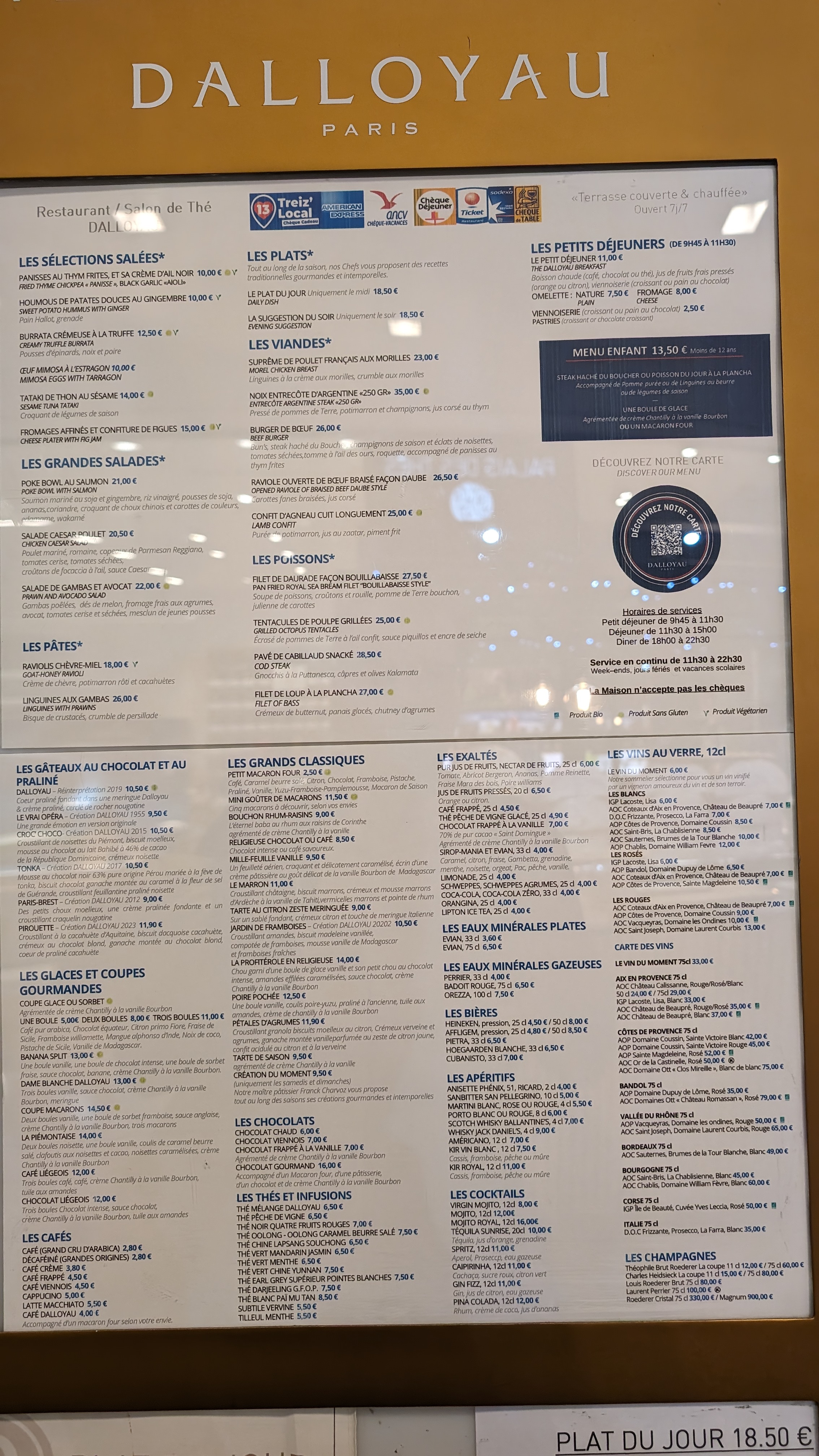 De plus en plus déçu .. Dalloyau était mon restaurant préféré, avec le temps malheureusement ça s’est dégradé. Assiette ébréché, couvert sales, des moucherons dans l’eau, des plats moins bons, qui arrivent froid … Des quantités de plus en plus petite. Franchement je suis déçu, à présent je n’irais plus, c’est bien dommage